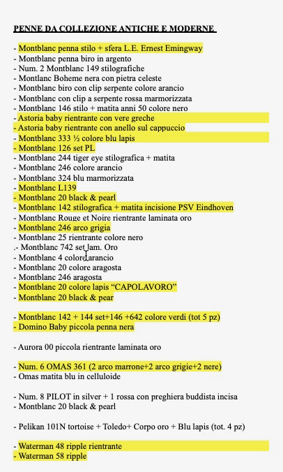 Alcune penne sono abbastanza rare e riconoscibili e non è comune trovarle in giro in qualche vendita, se non nei banchi dei venditori professionali qualificati, come per esempio una MONTBLANC #20 Black & Pearl con incisione “CAPOLAVORO” sul cappuccio, una WATERMAN #48 SAFETY RIPPLE, una DOMINO BABY in BHR, una serie completa di OMAS 361 in celluloide nei tre colori sia nella misura grande che standard e molte altre.