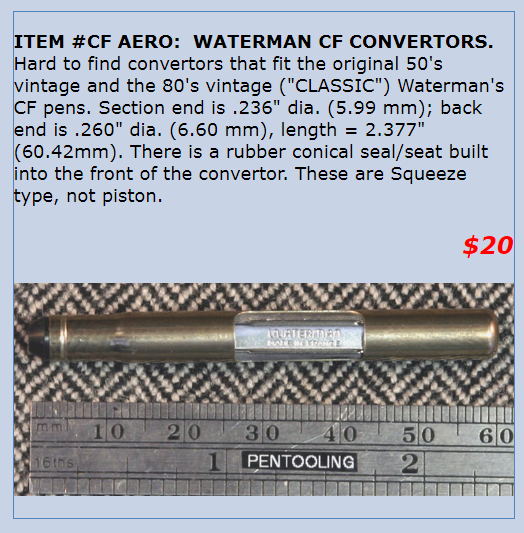 Pentooling invece afferma che è solo per penne CF Il nostro ineffabile Sanpei ha tempo fa venduto una Watermina, e da questa foto la cartuccia sembra.... mah, non so Su FPN ho visto il suddetto converter installato tanto su una Watermina quanto su una CF; questo deporrebbe a favore dell'idea che sia un unico standard, ma le discussioni vertevano su tutti altri argomenti, quindi è una prova indiziaria, non definitiva.