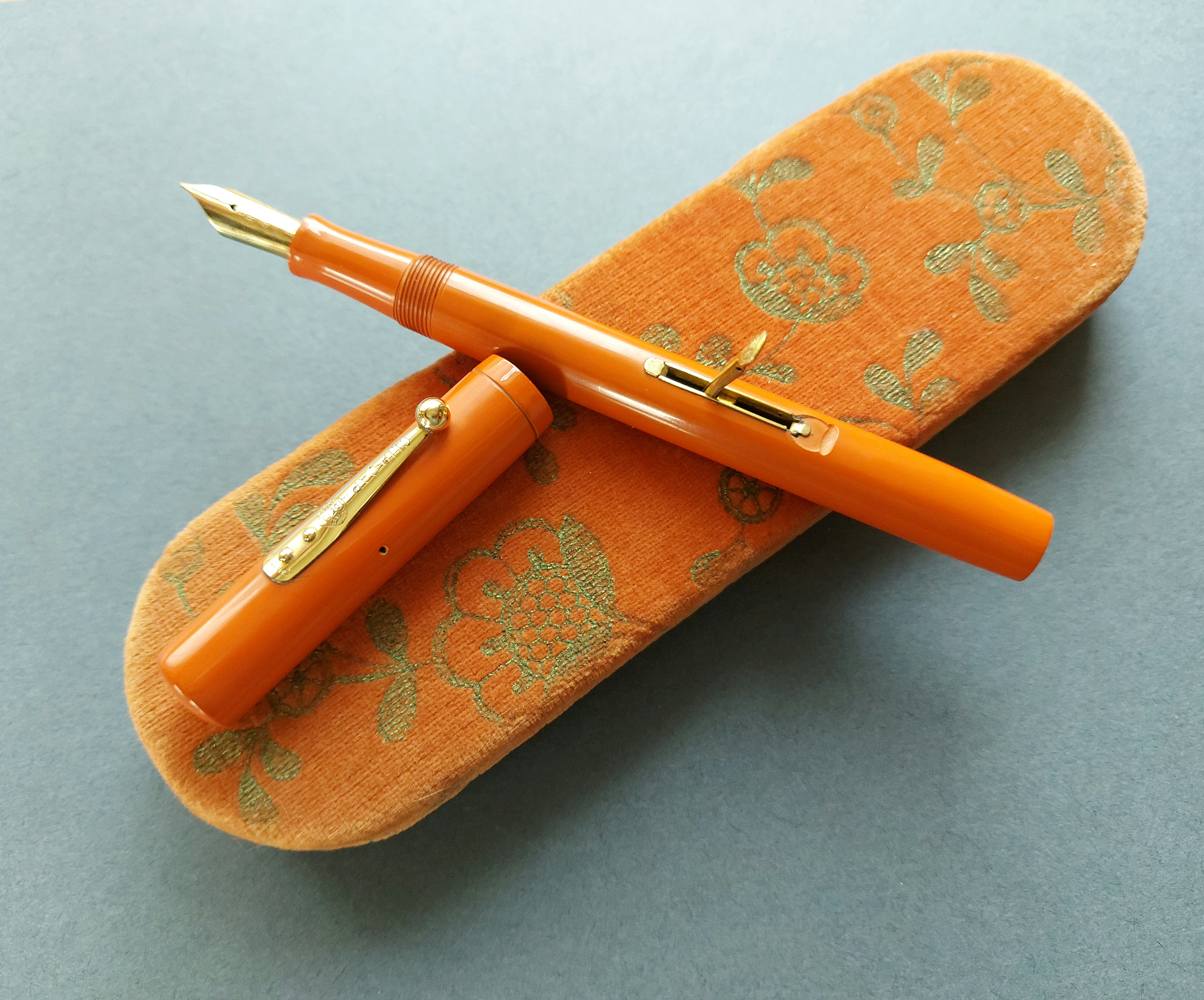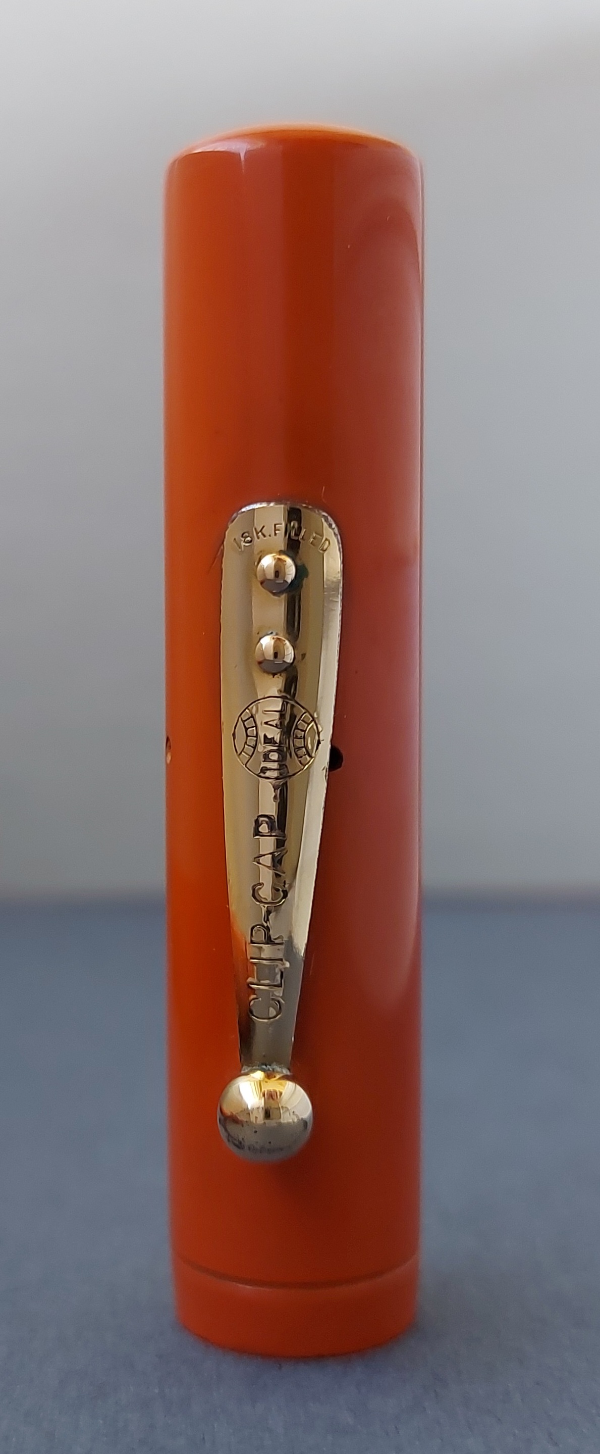 Nelle pubblicità Waterman’s si parla anche solo di colore “red” (che fosse ebanite era scontato, non essendo ancora giunto il tempo della celluloide che segnò nel giro di un lustro la fine della gomma vulcanizzata/hard rubber): in realtà, si tratta di un arancione!