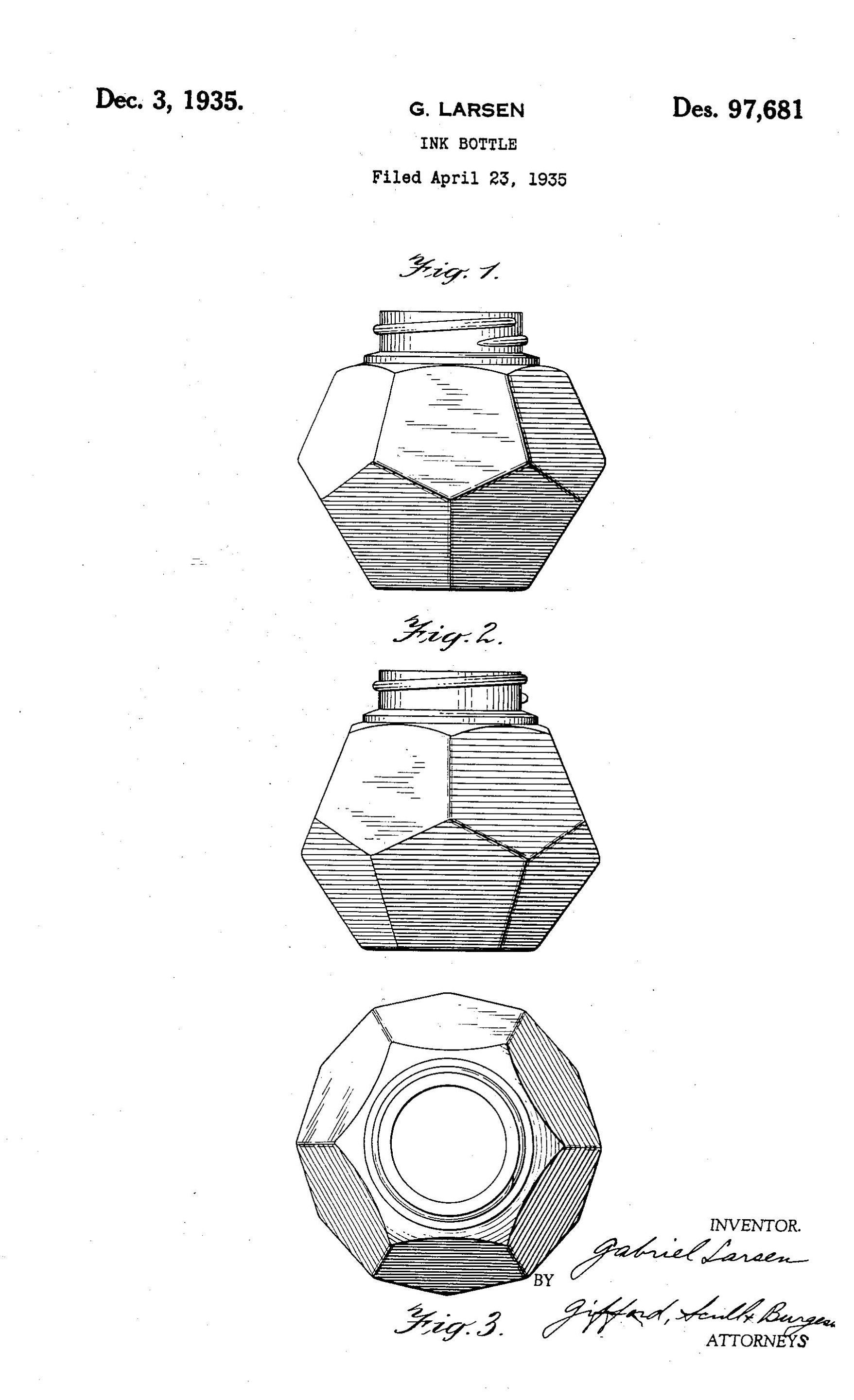 Il primo dei due flaconi “Tip-Fill” (numero 2 nel primo allegato), era stato progettato da uno dei massimi creatori di stilografiche di sempre, il designer Gabriel Larsen, lo stesso che aveva disegnato la Patrician, la #94, la Lady Patricia anche nella versione Ink-Vue… Questo calamaio era il più grande del gruppo con le sue 4 oz. di inchiostro (quindi con la capacità doppia rispetto agli altri), ed era venduto a 25cents.