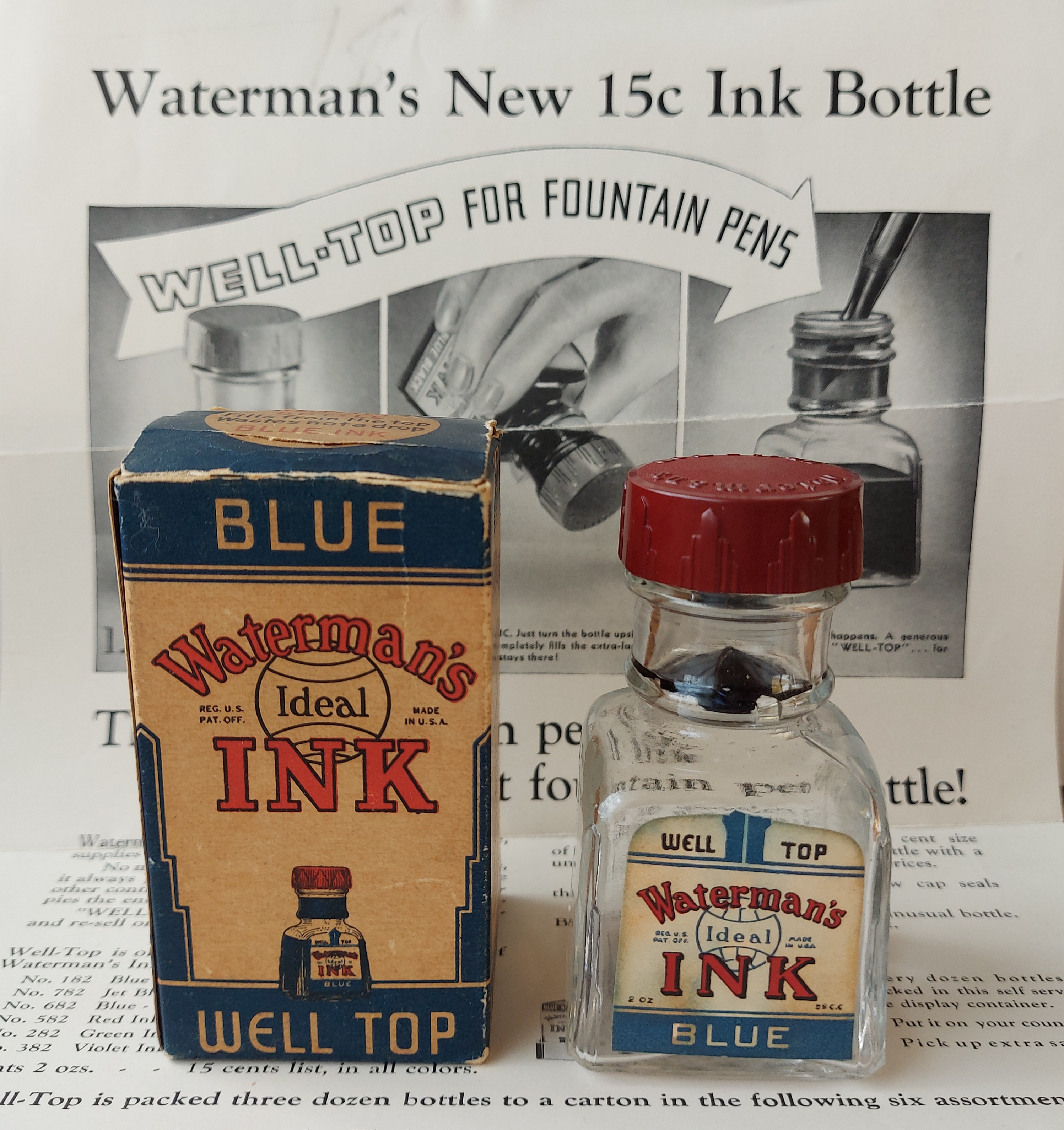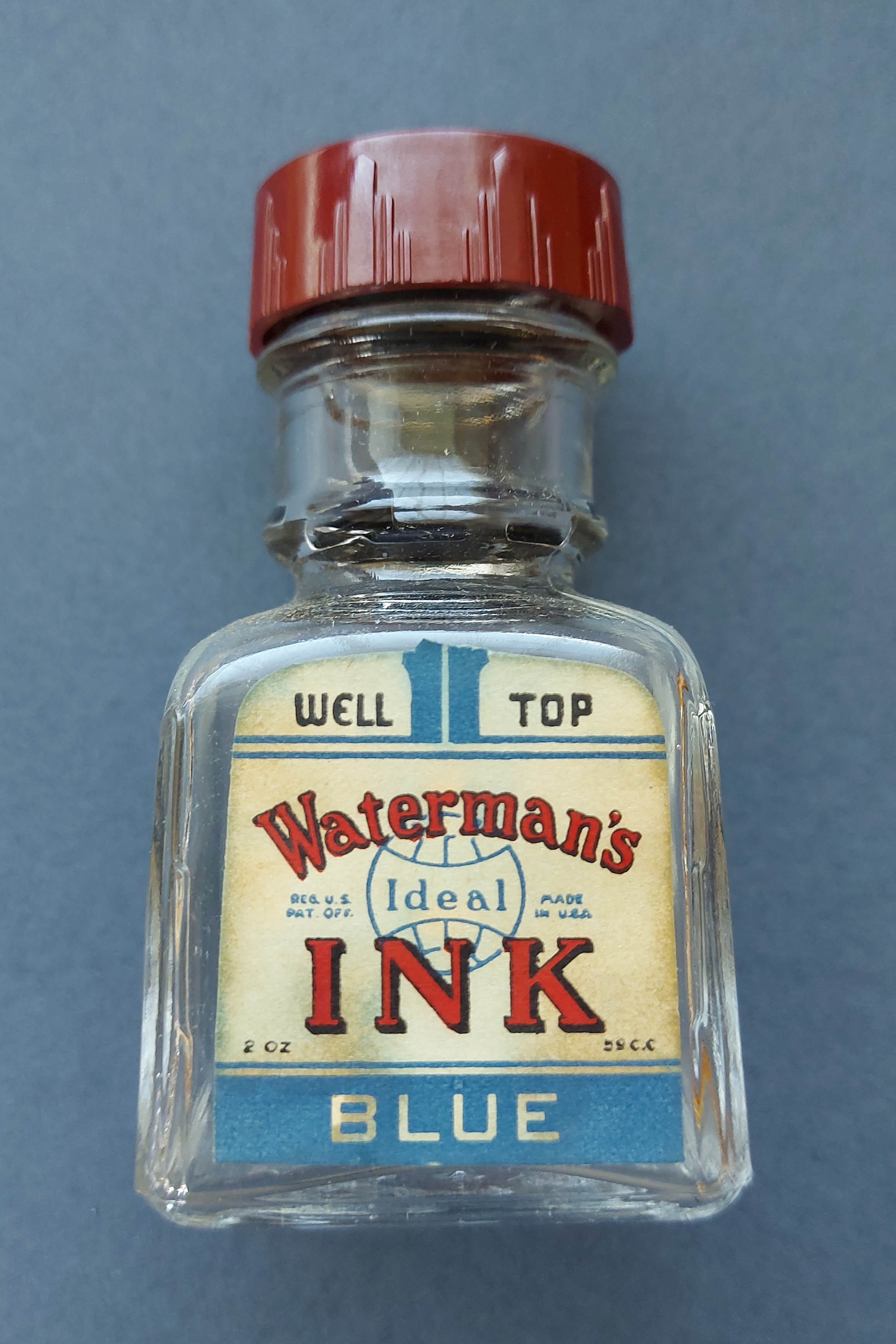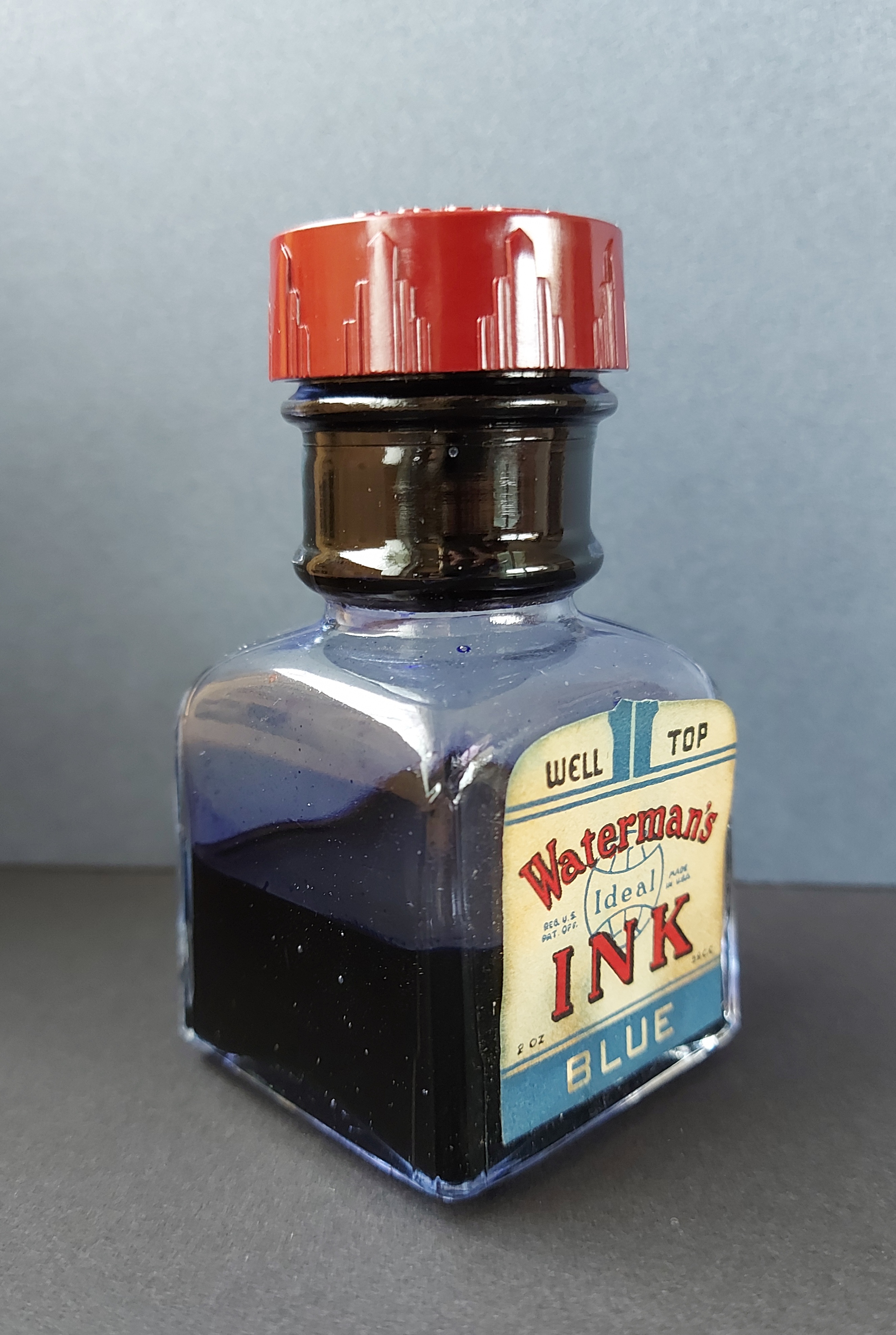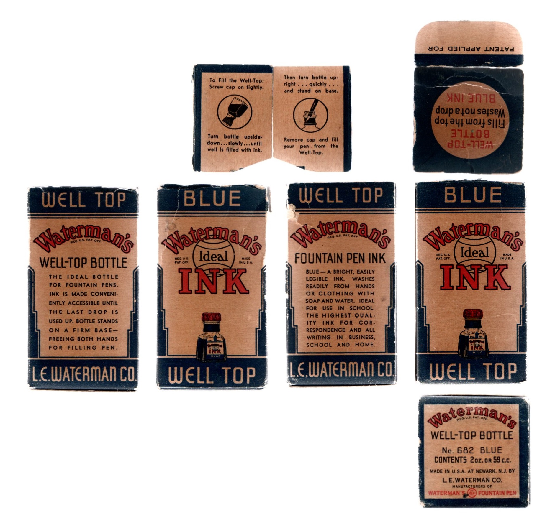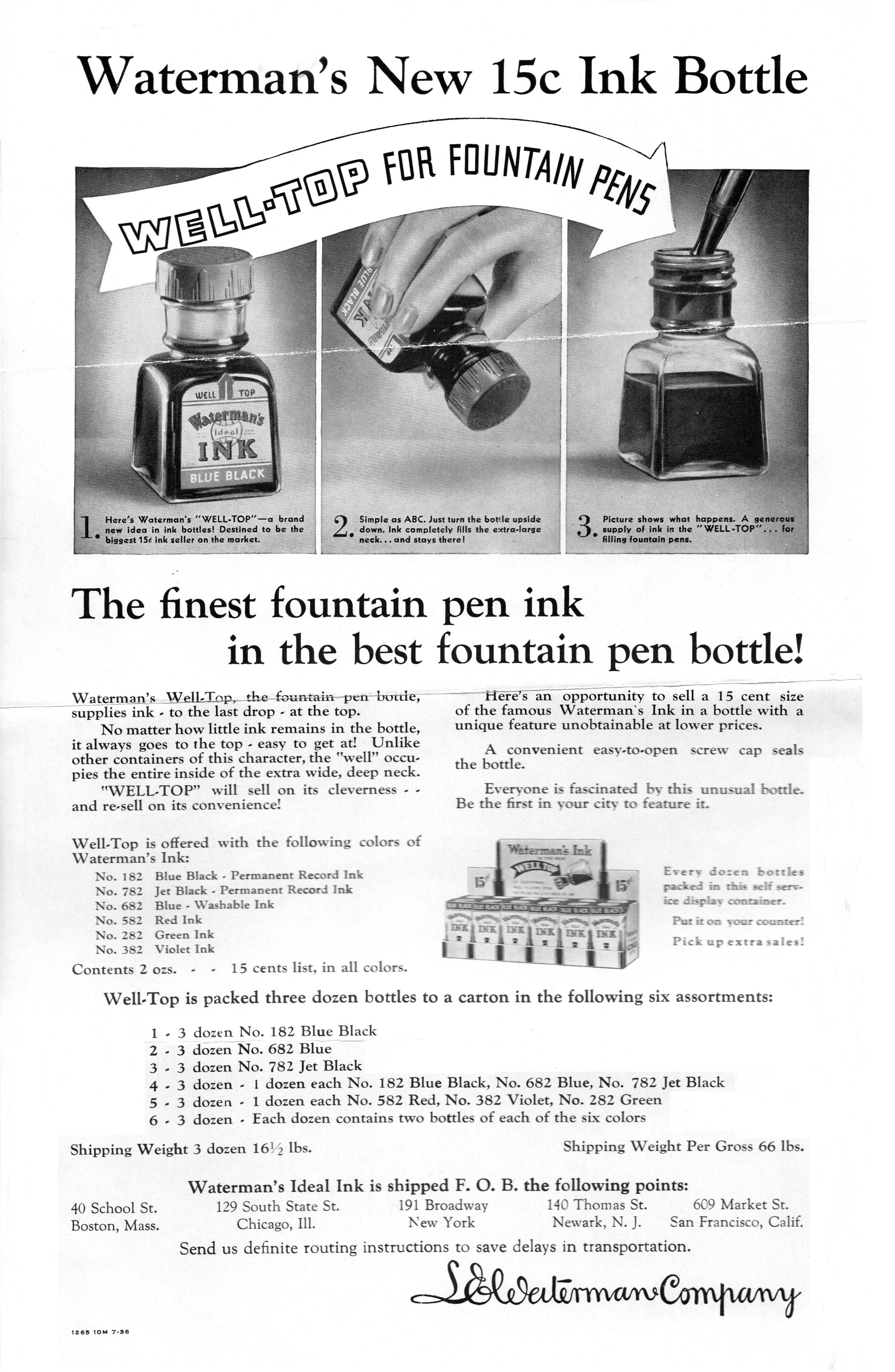L’abbinamento nelle pubblicità con l’alimentatore “Tip-Fill” (https://www.fountainpen.it/Tip-Fill), lanciato proprio in quel periodo sulle Waterman #7 in celluloide [@Simone: le prime Ads da me rinvenute sono del giugno 1933], non andò mai oltre al semplice accostamento (anzi, nelle immagini pubblicitarie ove sia presente anche una boccetta di inchiostro in silhouette per mostrare il pescaggio del pennino, la boccetta è sempre quella tradizionale cilindrica), e gli “inchiostri per la corrispondenza” rimasero tali nella loro nicchia di mercato sino alla dismissione (con la trasmigrazione dei loro nomi esotici sulle successive boccette "Tip-Fill" di seconda generazione).