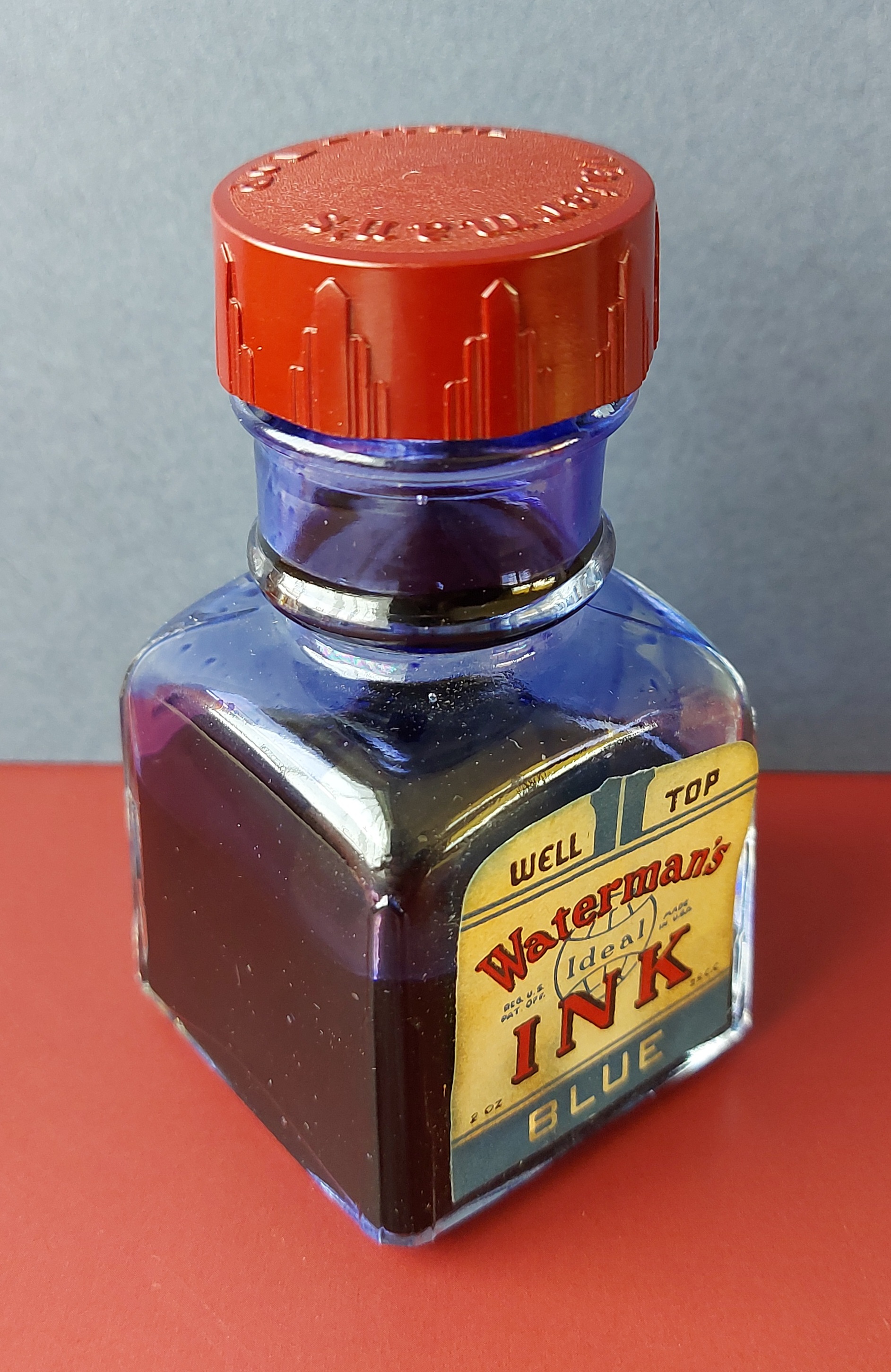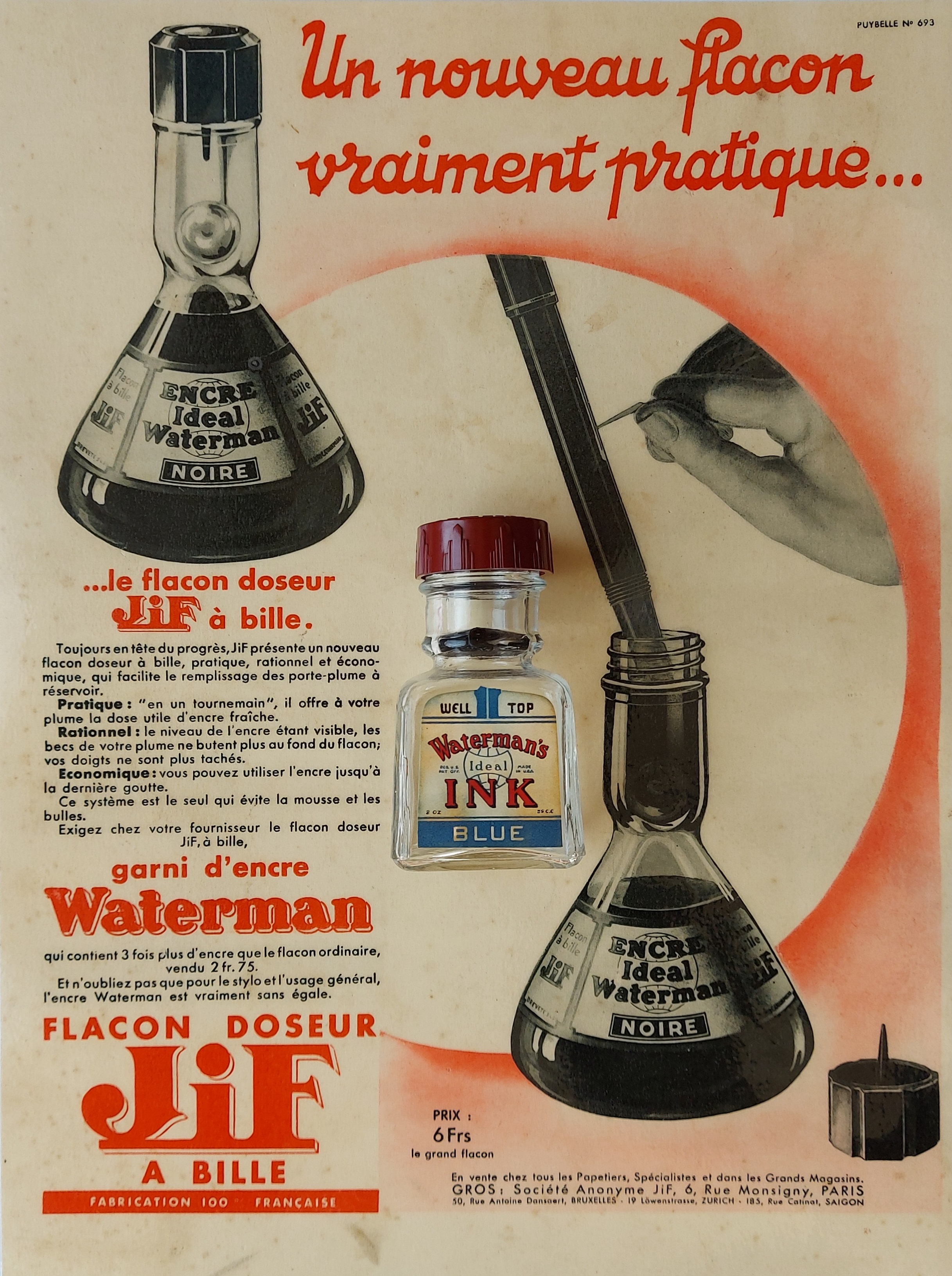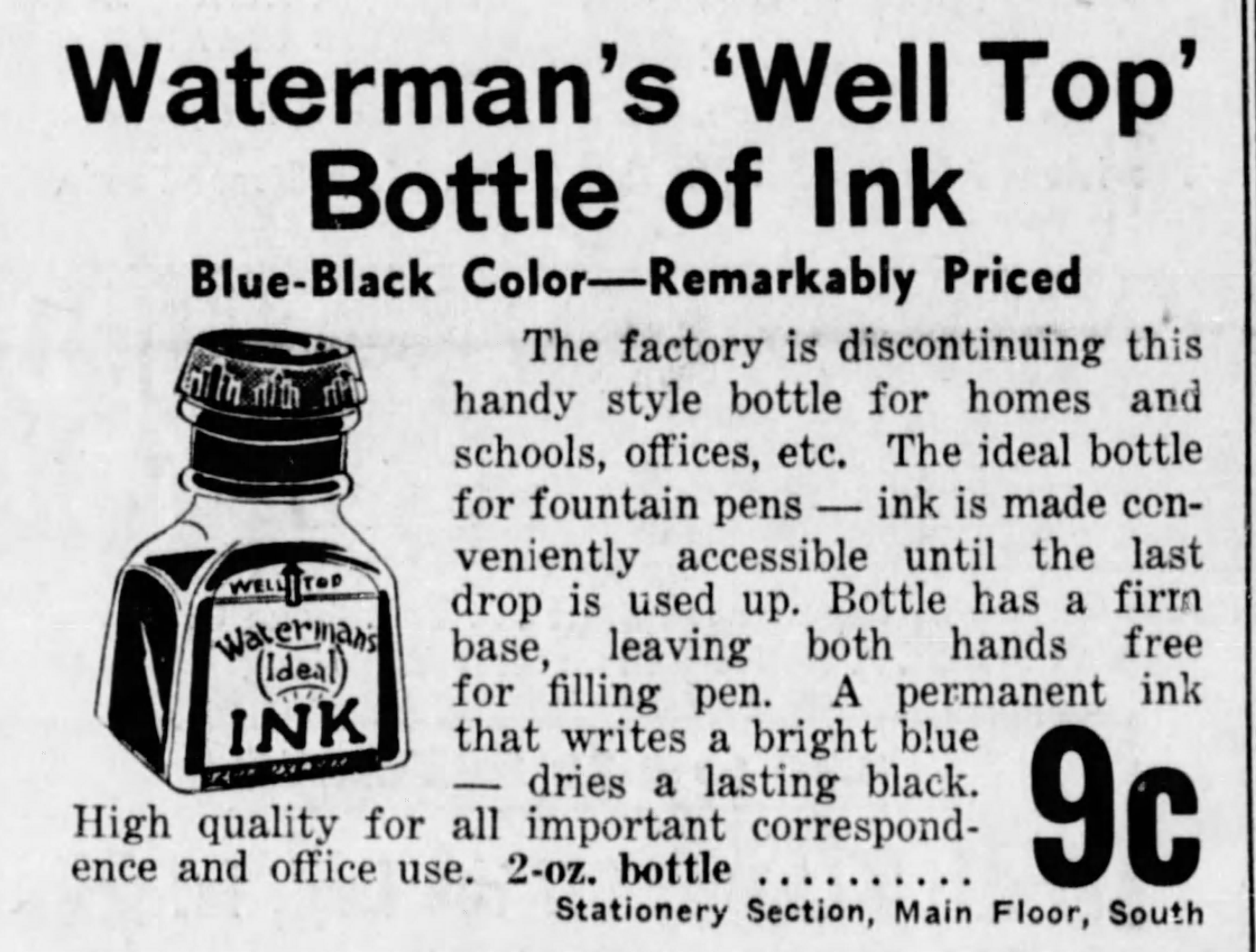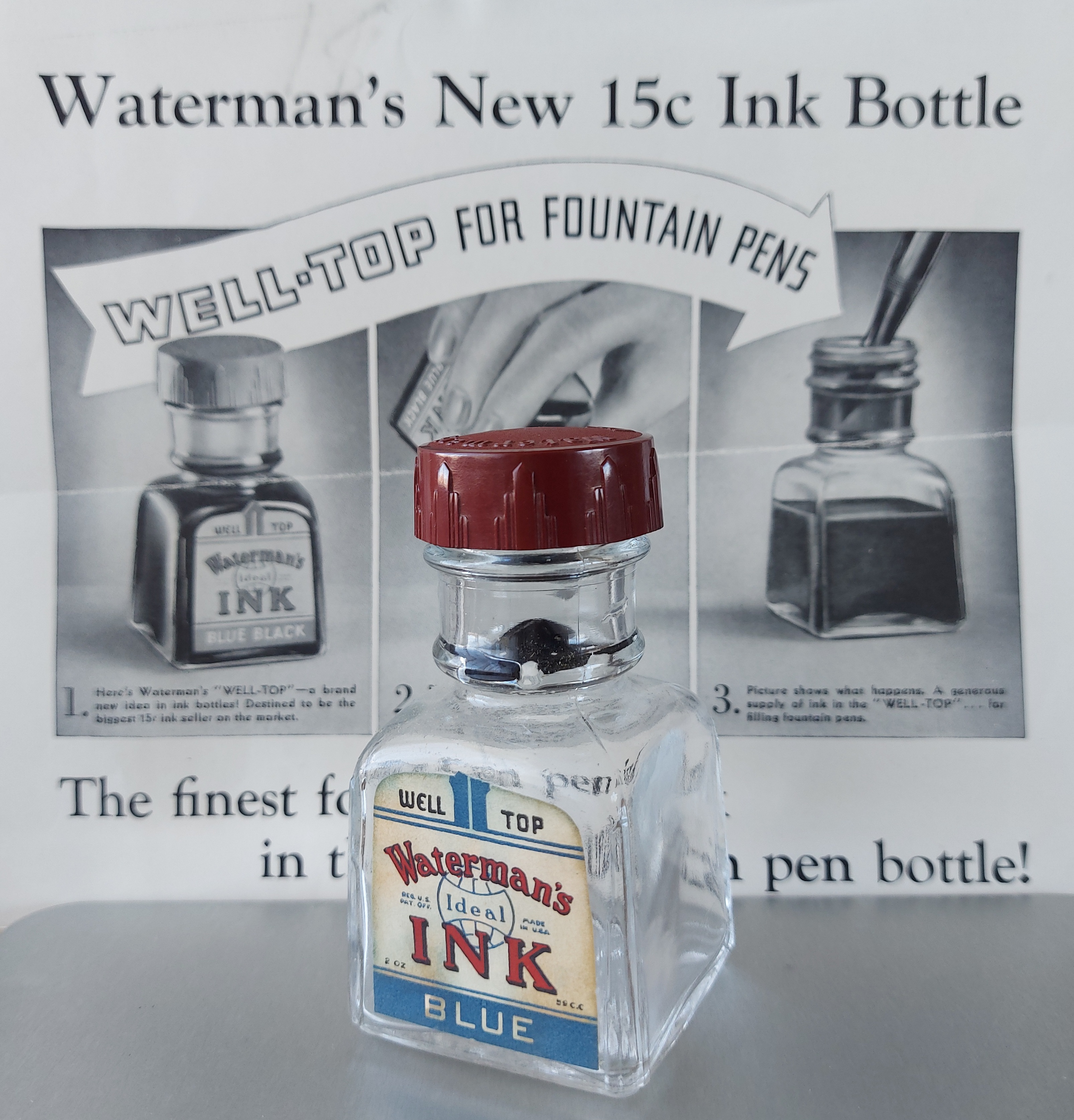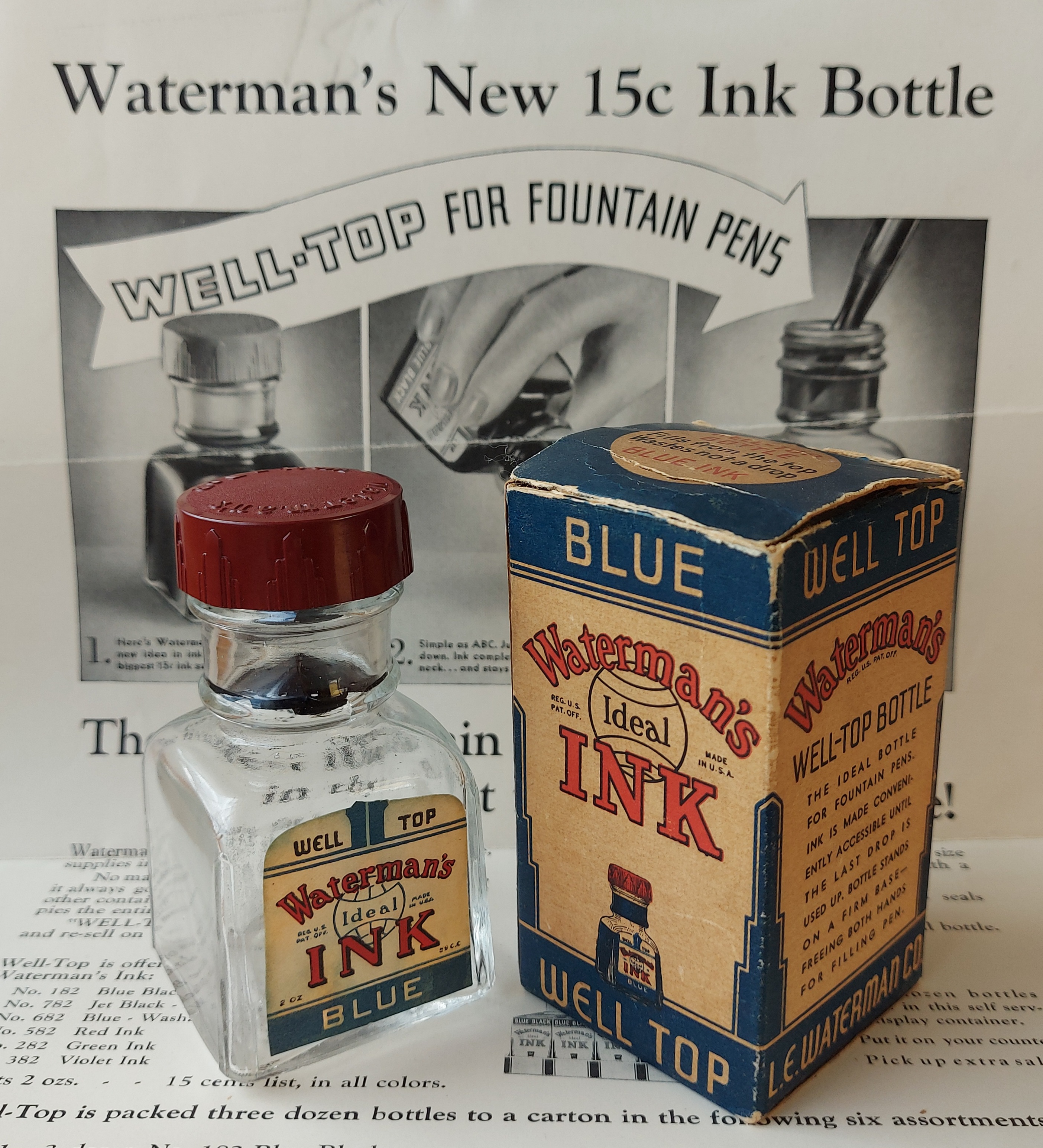 L’abbinamento nelle pubblicità con l’alimentatore “Tip-Fill” (https://www.fountainpen.it/Tip-Fill), lanciato proprio in quel periodo sulle Waterman #7 in celluloide [@Simone: le prime Ads da me rinvenute sono del giugno 1933], non andò mai oltre al semplice accostamento (anzi, nelle immagini pubblicitarie ove sia presente anche una boccetta di inchiostro in silhouette per mostrare il pescaggio del pennino, la boccetta è sempre quella tradizionale cilindrica), e gli “inchiostri per la corrispondenza” rimasero tali nella loro nicchia di mercato sino alla dismissione (con la trasmigrazione dei loro nomi esotici sulle successive boccette "Tip-Fill" di seconda generazione).