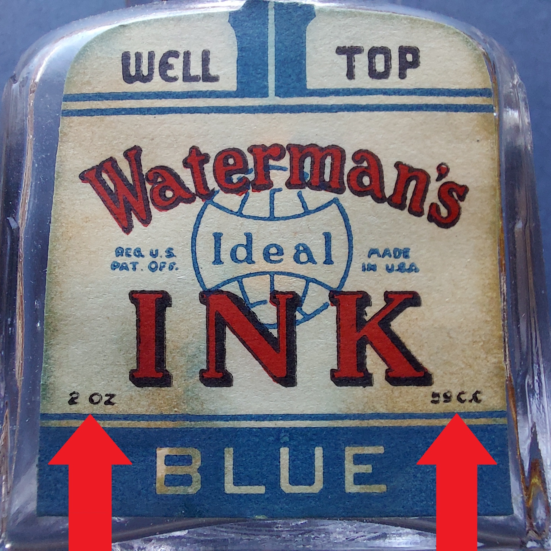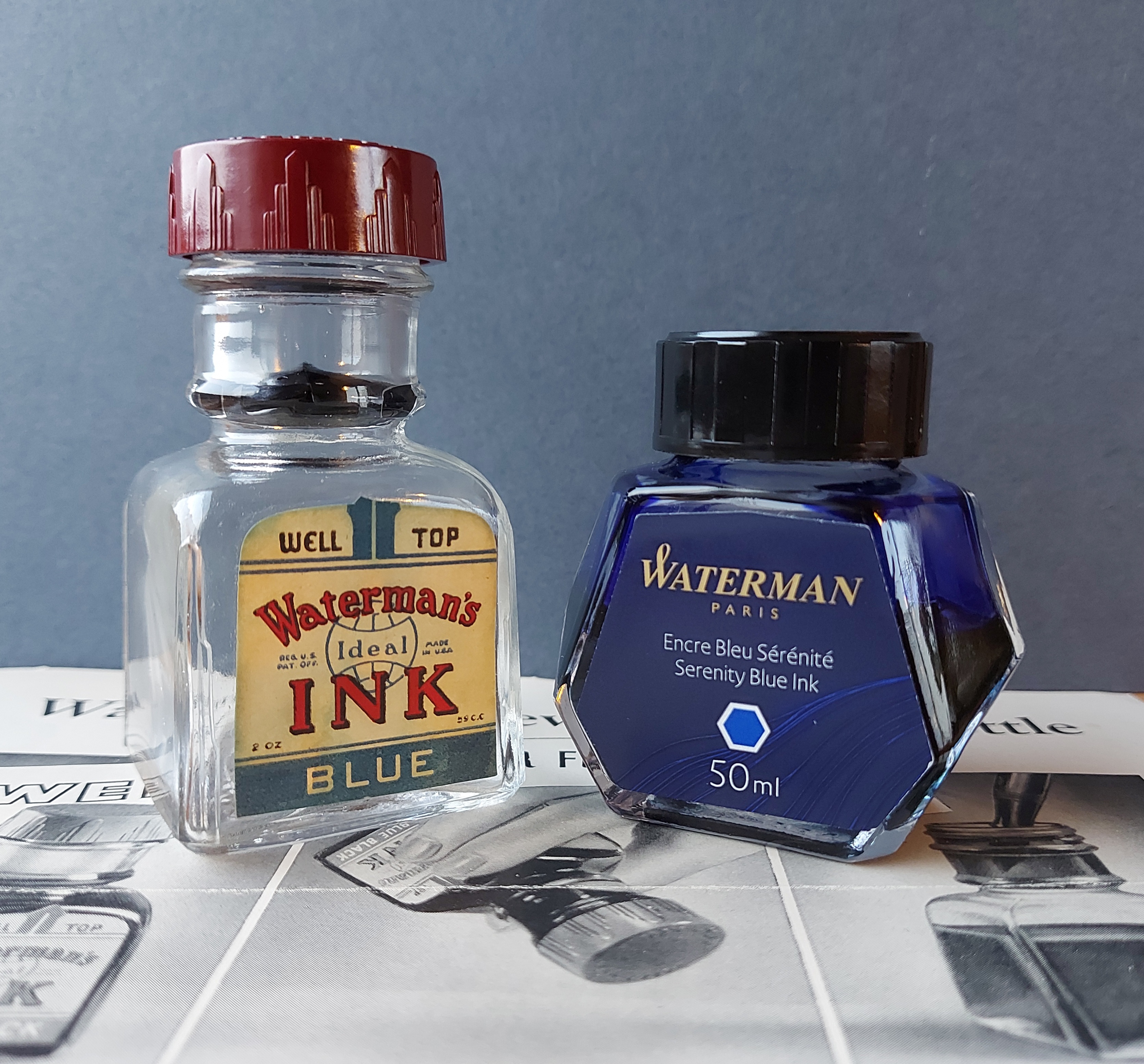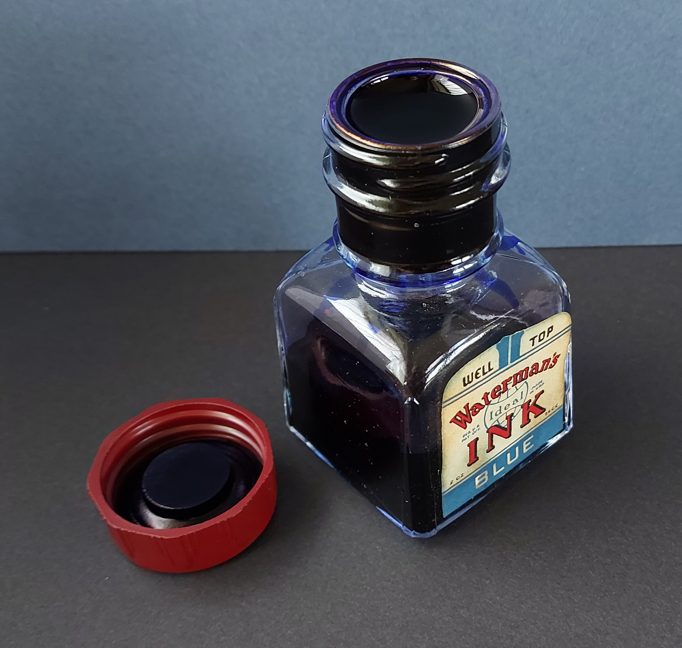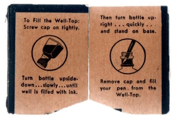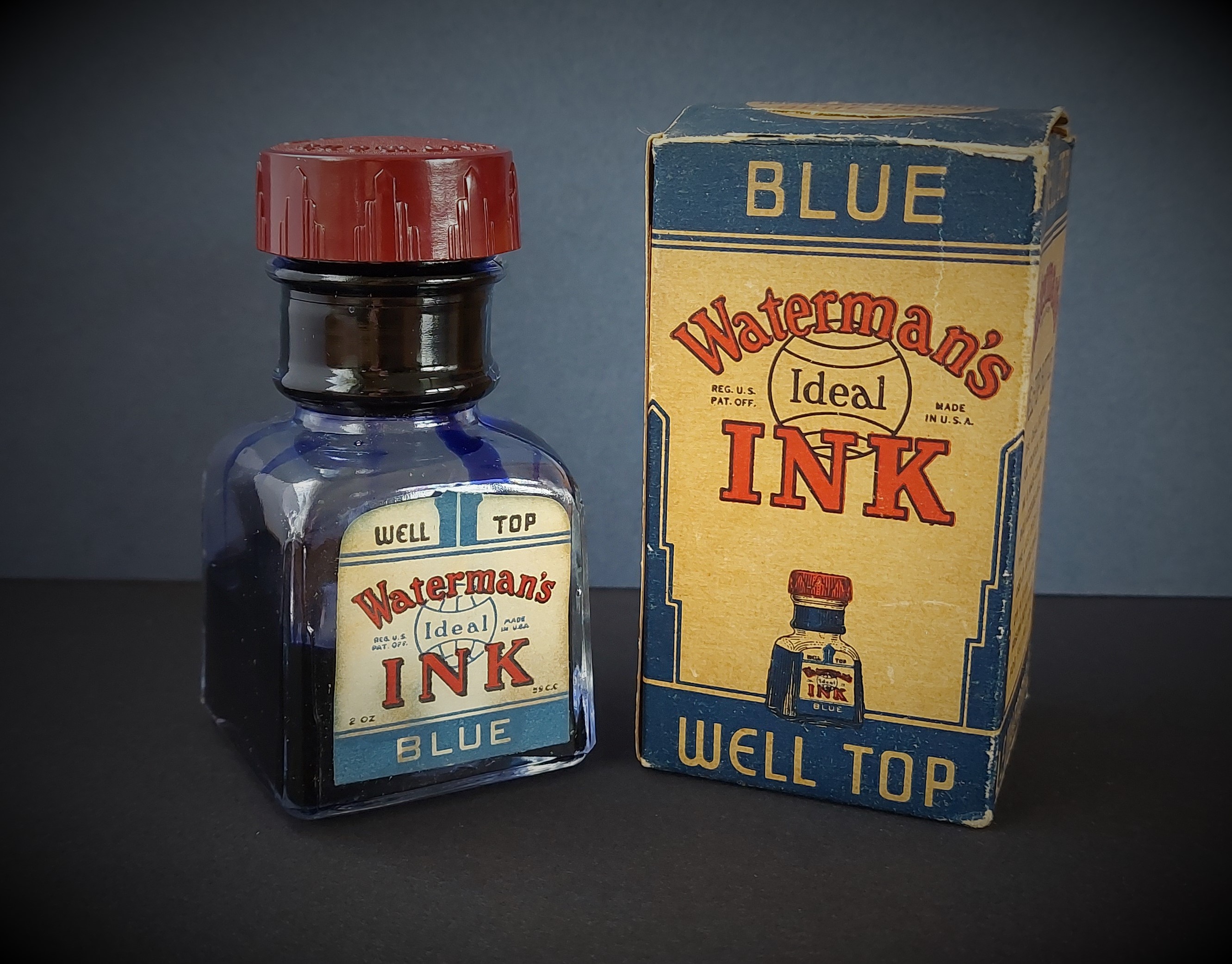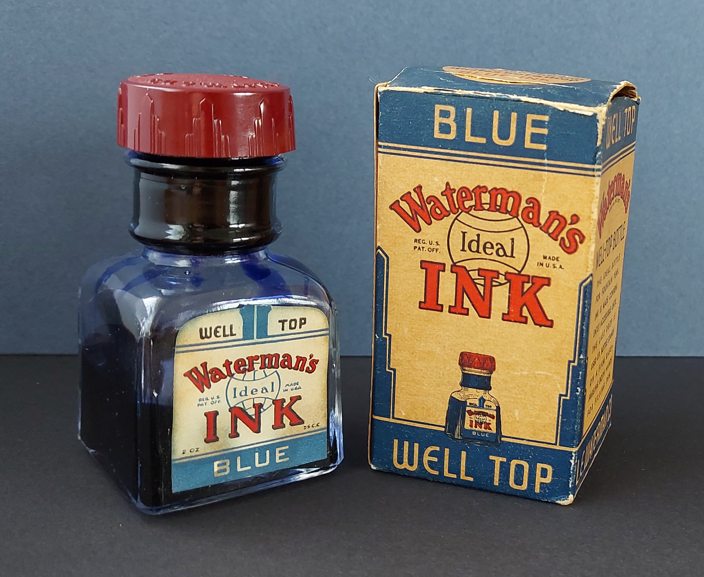 L’abbinamento nelle pubblicità con l’alimentatore “Tip-Fill” (https://www.fountainpen.it/Tip-Fill), lanciato proprio in quel periodo sulle Waterman #7 in celluloide [@Simone: le prime Ads da me rinvenute sono del giugno 1933], non andò mai oltre al semplice accostamento (anzi, nelle immagini pubblicitarie ove sia presente anche una boccetta di inchiostro in silhouette per mostrare il pescaggio del pennino, la boccetta è sempre quella tradizionale cilindrica), e gli “inchiostri per la corrispondenza” rimasero tali nella loro nicchia di mercato sino alla dismissione (con la trasmigrazione dei loro nomi esotici sulle successive boccette "Tip-Fill" di seconda generazione).