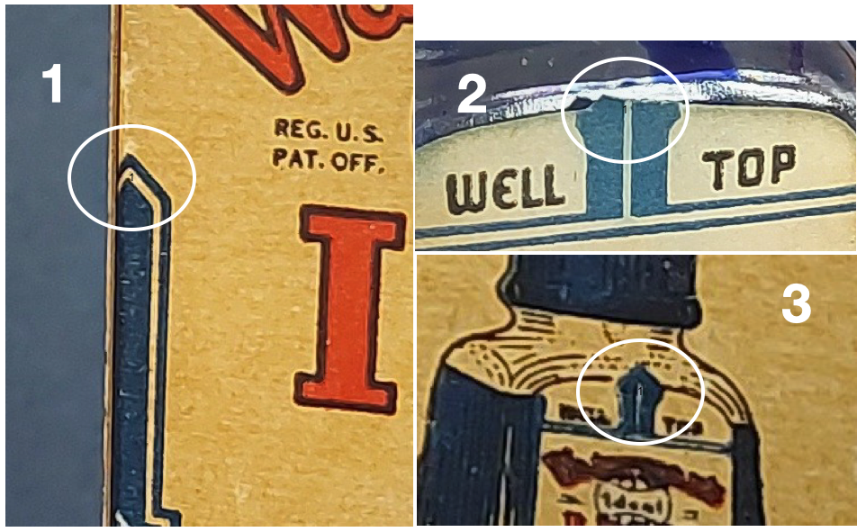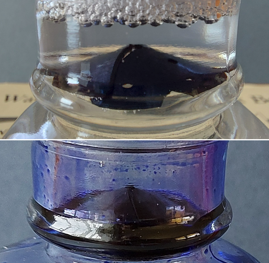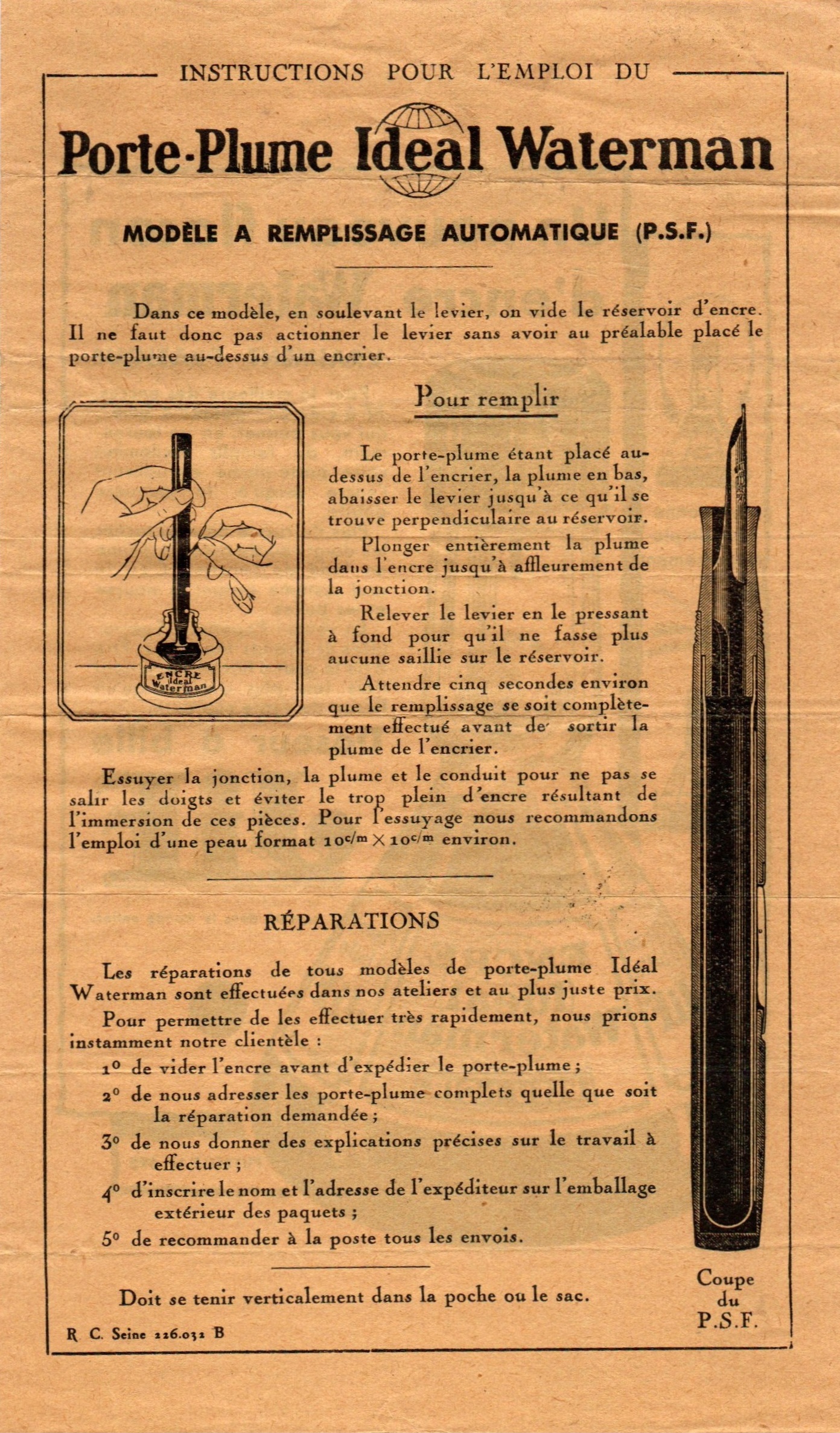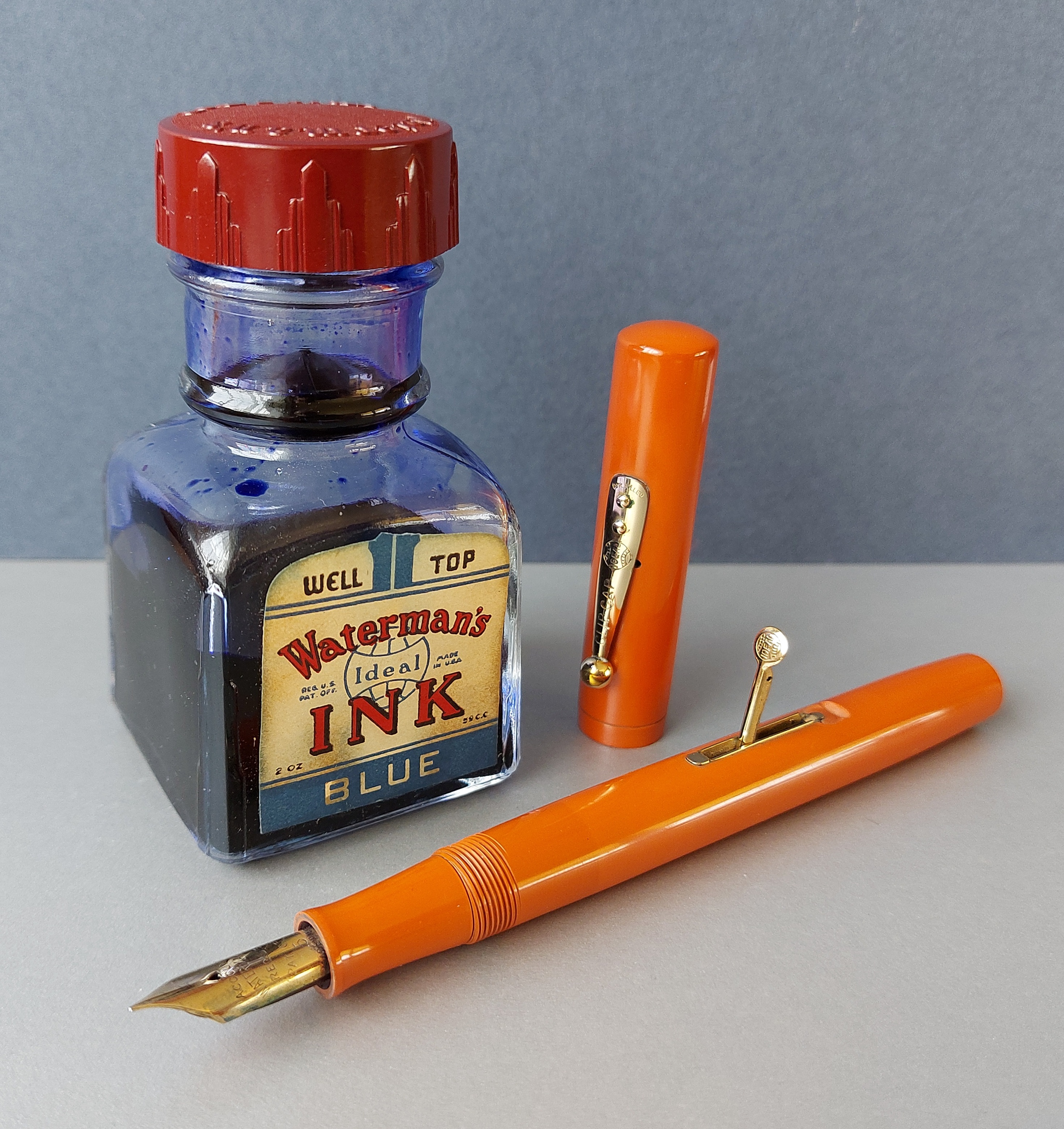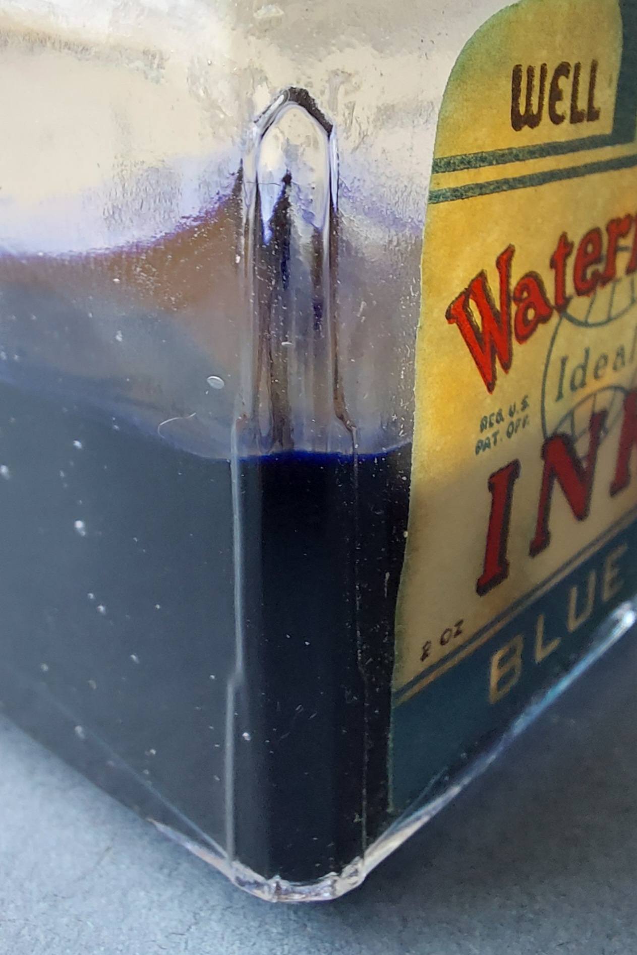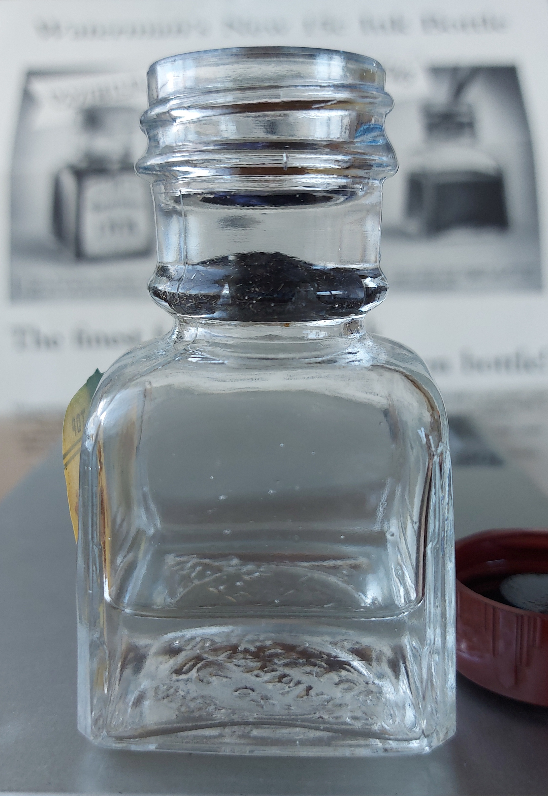 L’abbinamento nelle pubblicità con l’alimentatore “Tip-Fill” (https://www.fountainpen.it/Tip-Fill), lanciato proprio in quel periodo sulle Waterman #7 in celluloide [@Simone: le prime Ads da me rinvenute sono del giugno 1933], non andò mai oltre al semplice accostamento (anzi, nelle immagini pubblicitarie ove sia presente anche una boccetta di inchiostro in silhouette per mostrare il pescaggio del pennino, la boccetta è sempre quella tradizionale cilindrica), e gli “inchiostri per la corrispondenza” rimasero tali nella loro nicchia di mercato sino alla dismissione (con la trasmigrazione dei loro nomi esotici sulle successive boccette "Tip-Fill" di seconda generazione).