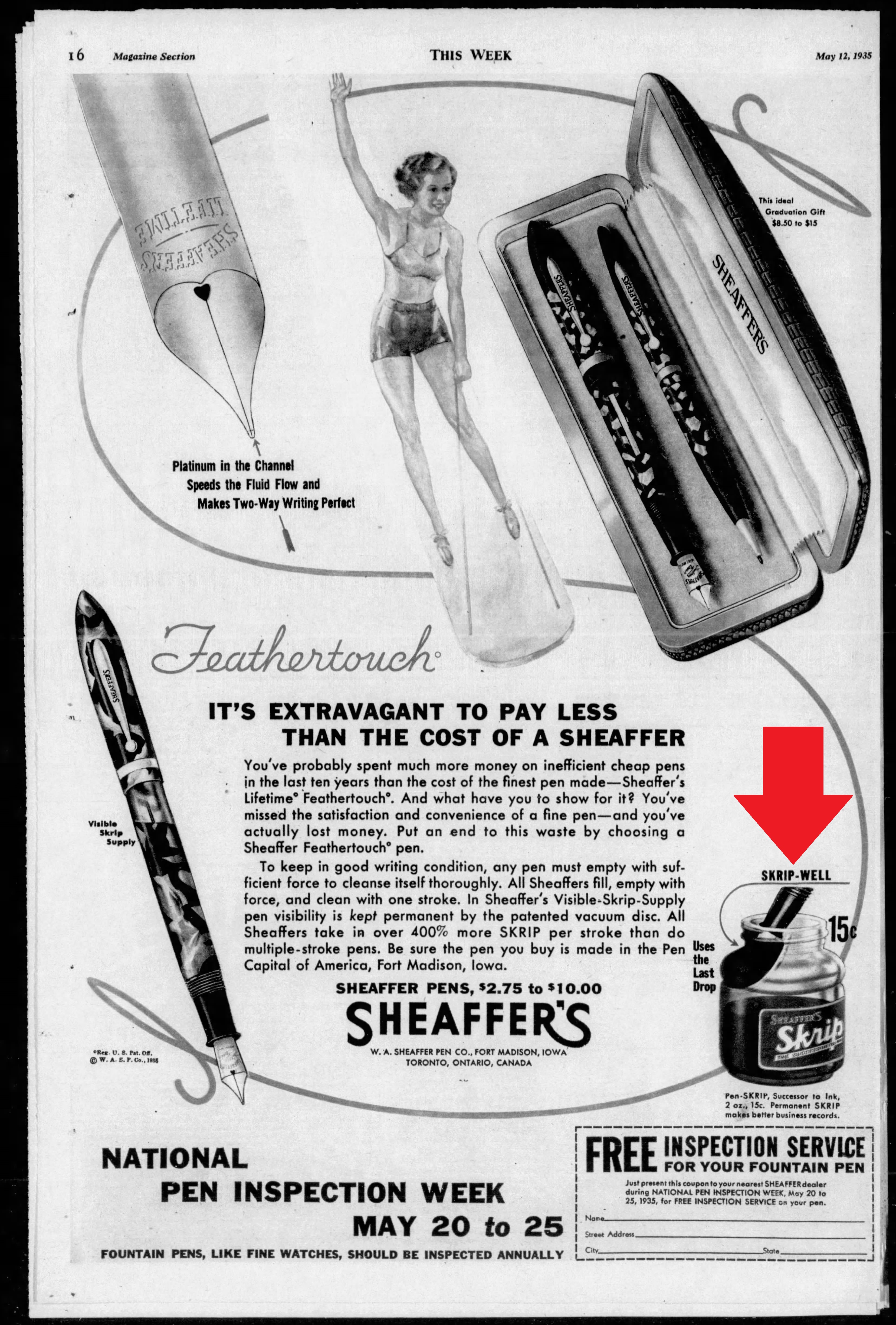 Molto interessante (si può leggere nel mio conferimento precedente) il riferimento ad altri “contenitori dello stesso genere” rispetto ai quali il “pozzo” (la parte superiore, cilindrica, del flacone) del Well-Top «occupa completamente l’interno del profondo collo, caratterizzato da un’imboccatura estremamente ampia». Il riferimento, ovviamente polemico!, è a mio avviso diretto alla soluzione quasi omonima sviluppata della concorrente Sheaffer, lo Skrip-Well (=il pozzo dello Skrip, dove Skrip era il nome commerciale dell’inchiostro Sheaffer’s) sul mercato già da oltre un anno [@Simone: come testimonia questa Ad del maggio 1935, che quindi conferma la tua ipotesi sul Wiki, ma le prime prove di mercato sono del marzo 1935 in California] https://www.fountainpen.it/Skrip-Well The_Baltimore_Sun_Sun__May_12__1935