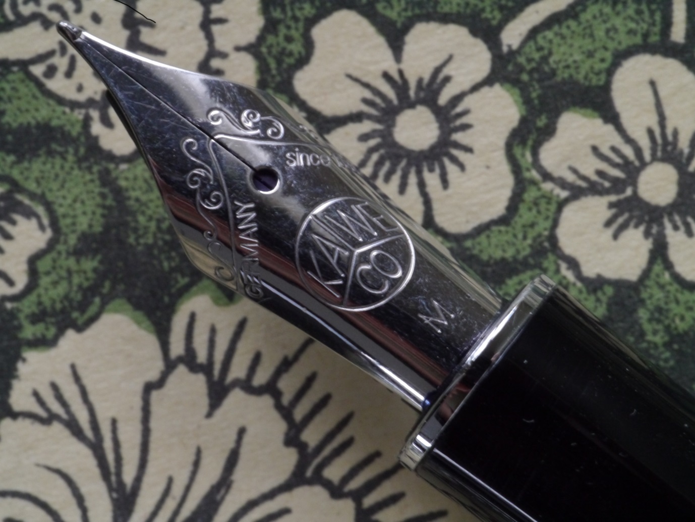 Il pennino è un buon Bock, size 6. Il mio è in acciaio, tratto M, che tuttavia è un M fine (si vede anche ad occhio che la punta è sottile), piacevole nell'uso, scorrevole, e come spesso per i Bock in acciaio, è appena morbido.
