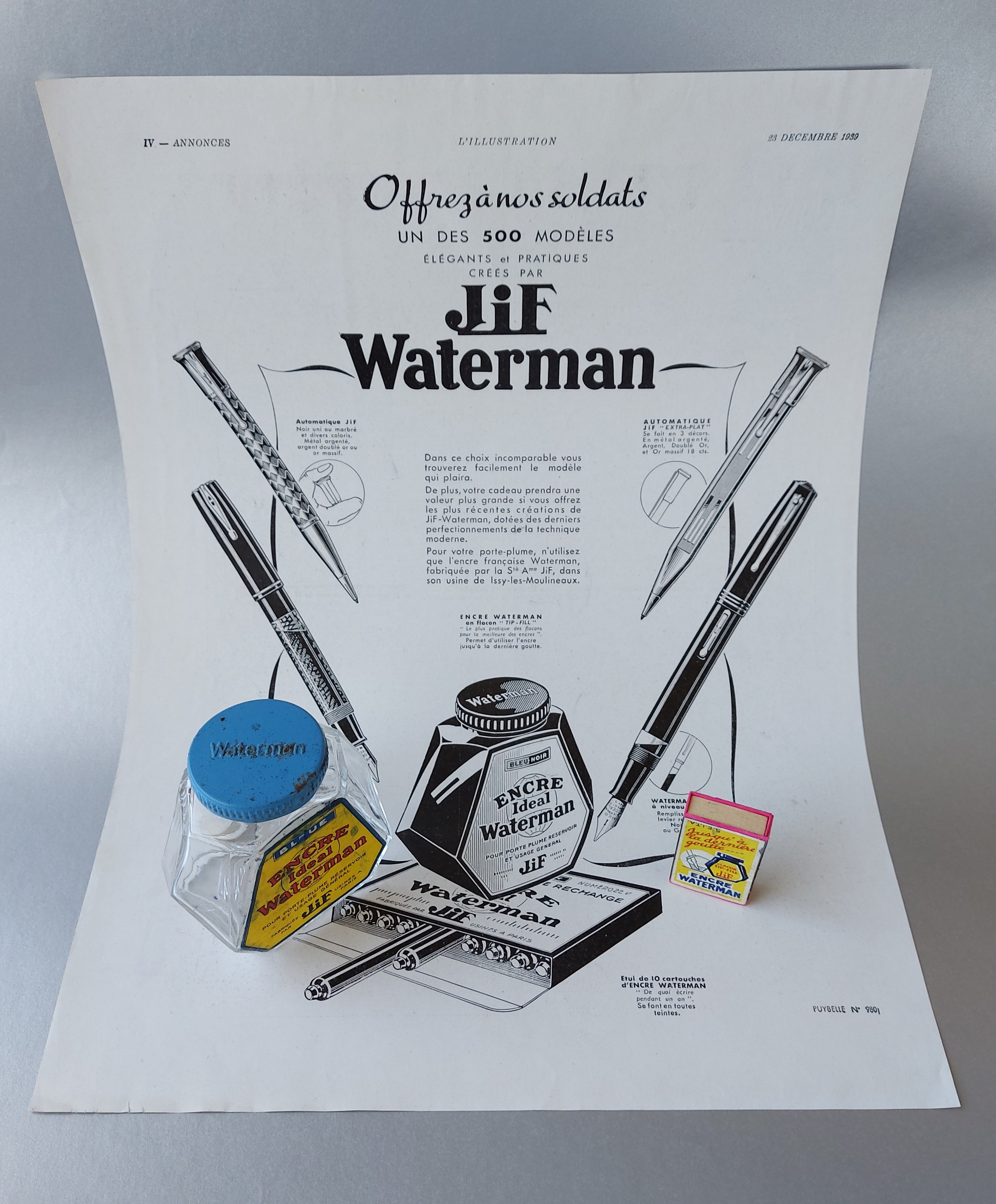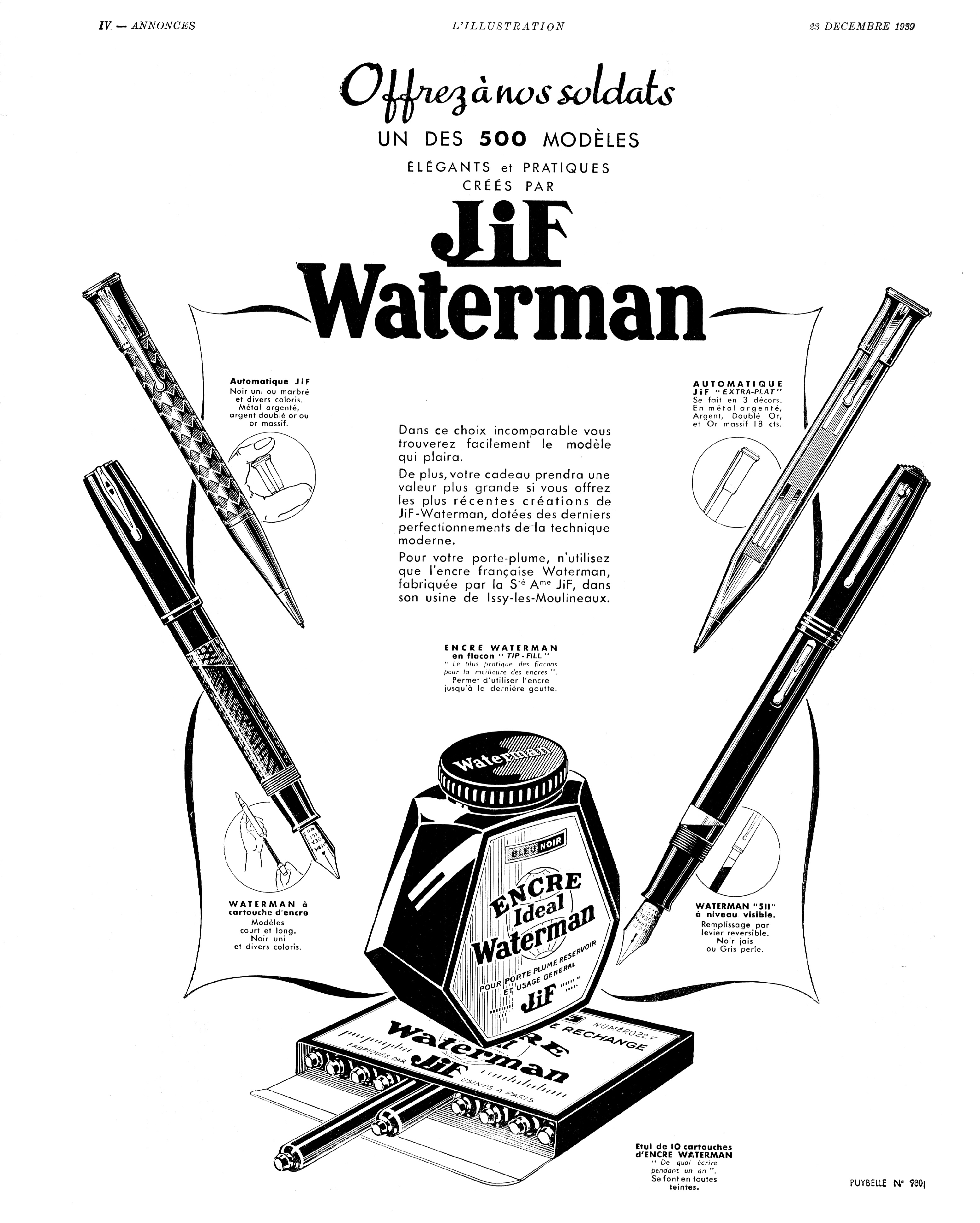 Ecco il mio secondo e ultimo conferimento originale per il nostro Wiki, che documenta il debutto del calamaio sul mercato transalpino alla fine del 1939, a Seconda Guerra Mondiale già iniziata come ben si evince dall’esortazione iniziale «Offrite ai nostri soldati…». WATERMAN - 1939.12.23 - #511, Ink cartridge short, Jif pencils. Flacon Tip-Fill. L'Illustration, pag.IV of advertisements
