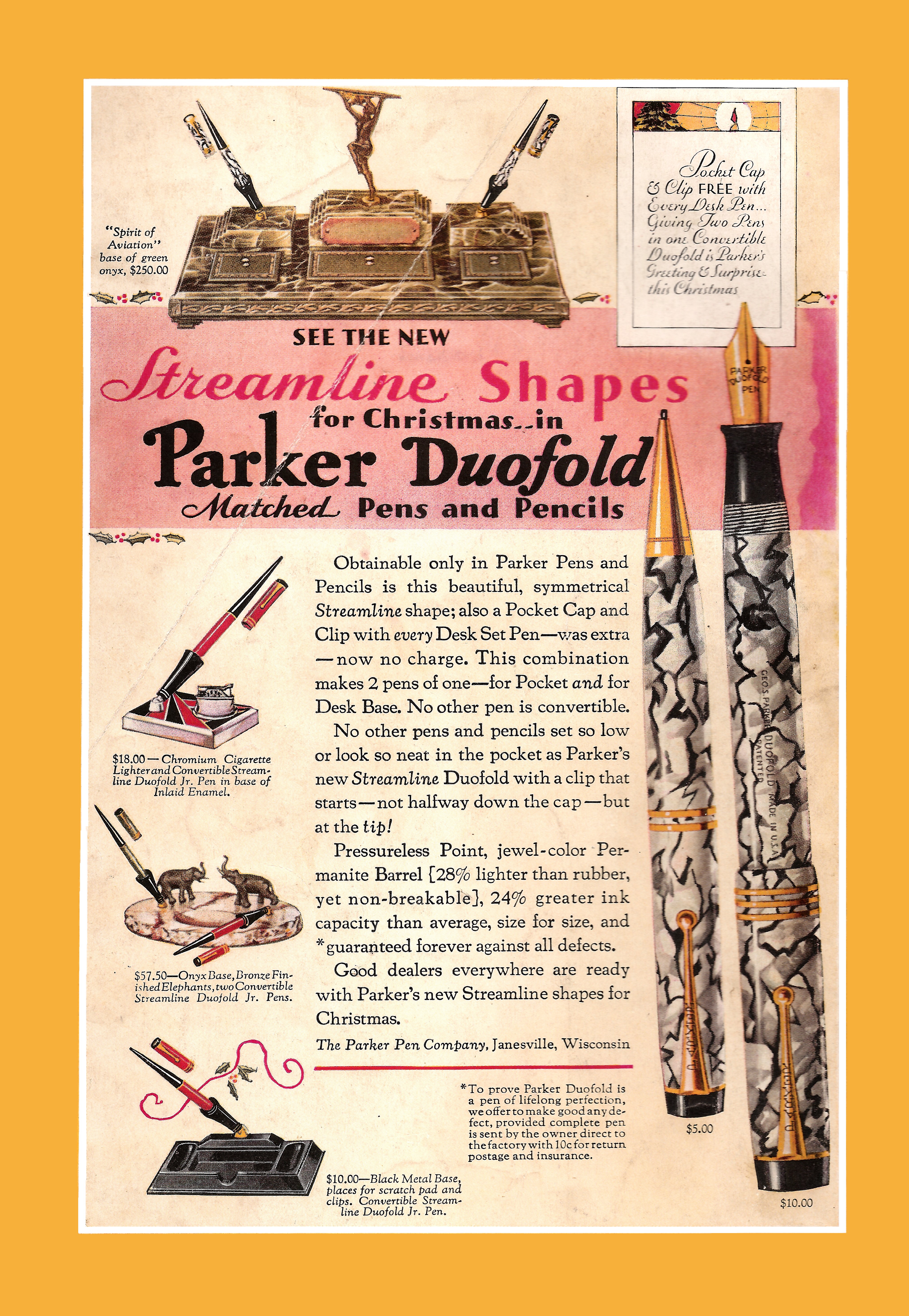venduto per la astronomica cifra di $250 quando una top di gamma Duofold “de luxe” ne costava 10 (come se oggi si moltiplicasse x25 il costo di una Montblanc 149). 1929-12. Parker-Duofold (dal Wiki)