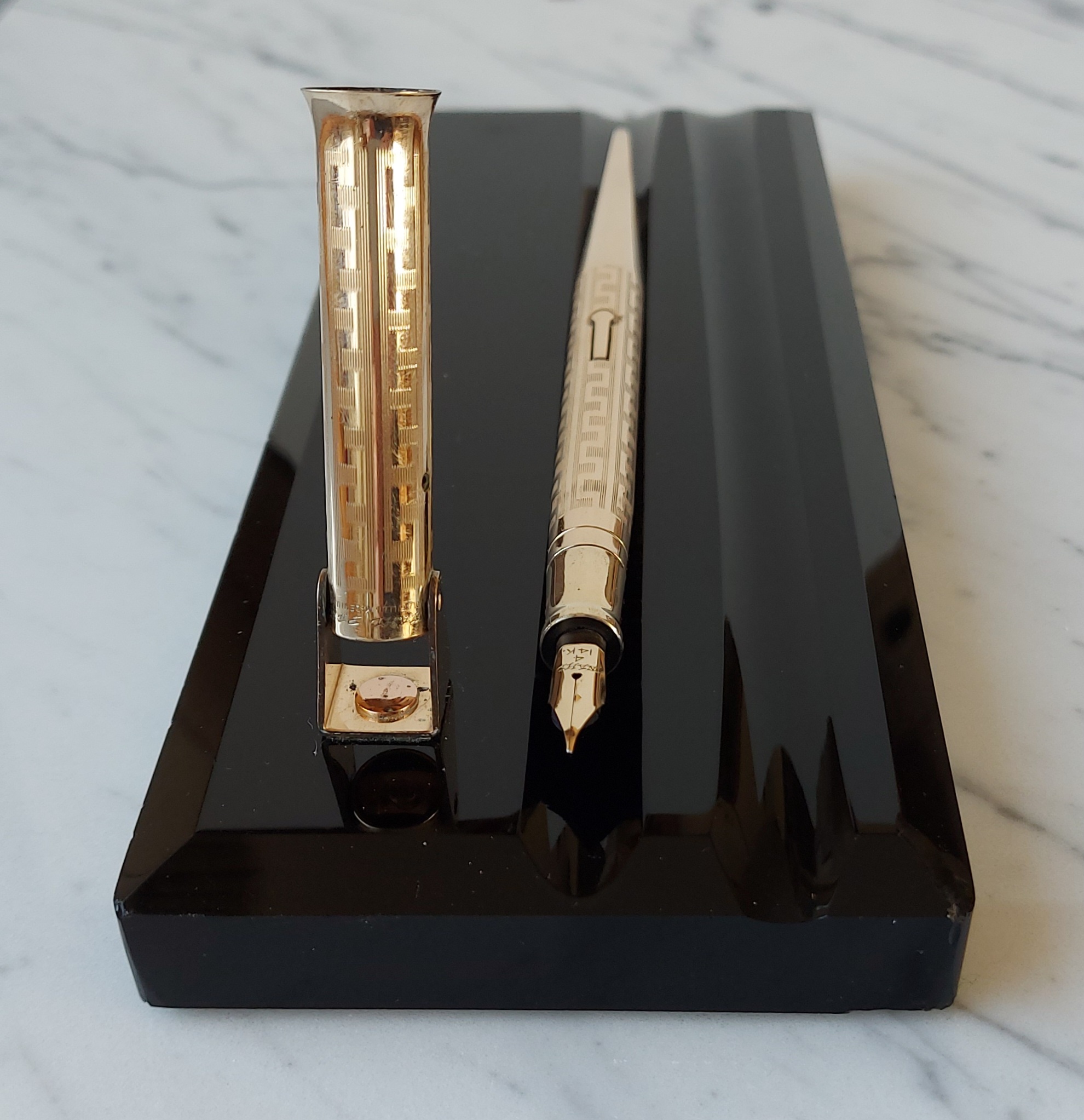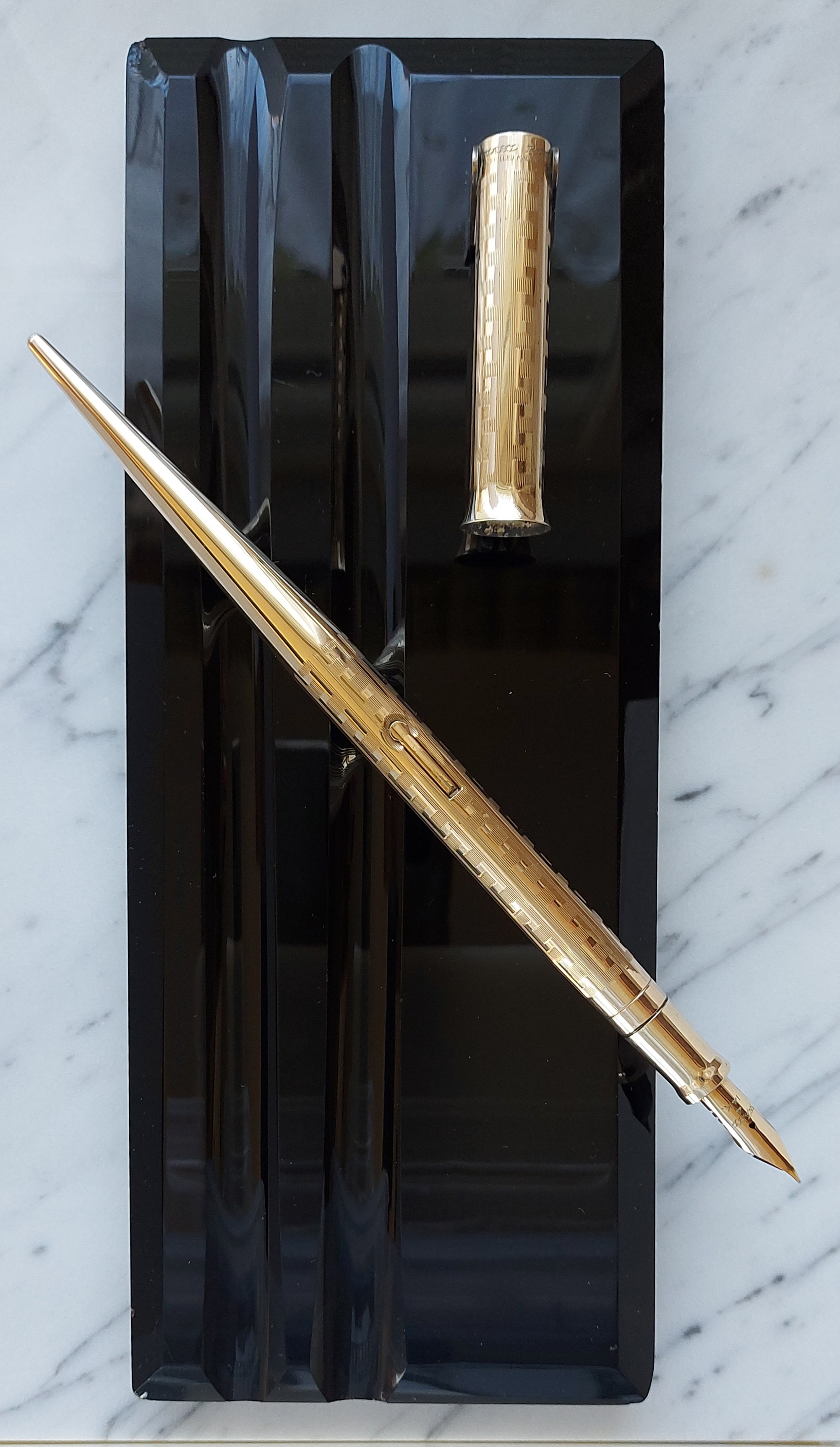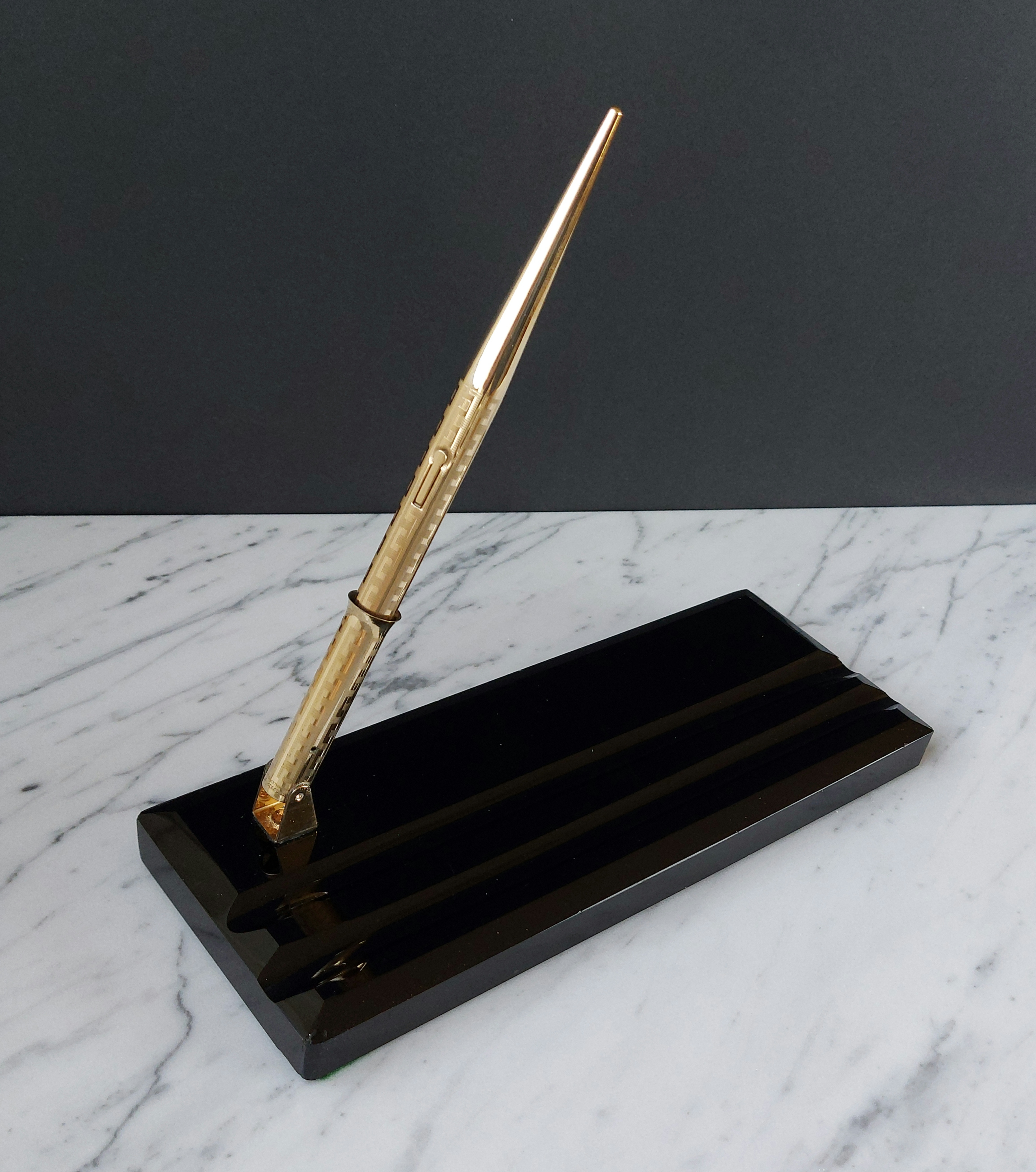 Pesante base in vetro nero, con due scanalature, smussata e lucidata, equipaggiata con un calice avvitato ed una stilografica tutti in metallo (all metal) laminati in oro giallo con decoro “Grecian Border”; stilografica con terminale rastremato (coda-le) in unico pezzo, corretto pennino WAHL #4 [F] Falcon in oro 14 carati con alimentatore “a pettine” in ebanite, caricamento a levetta, produzione U.S.A. anno 1925.
