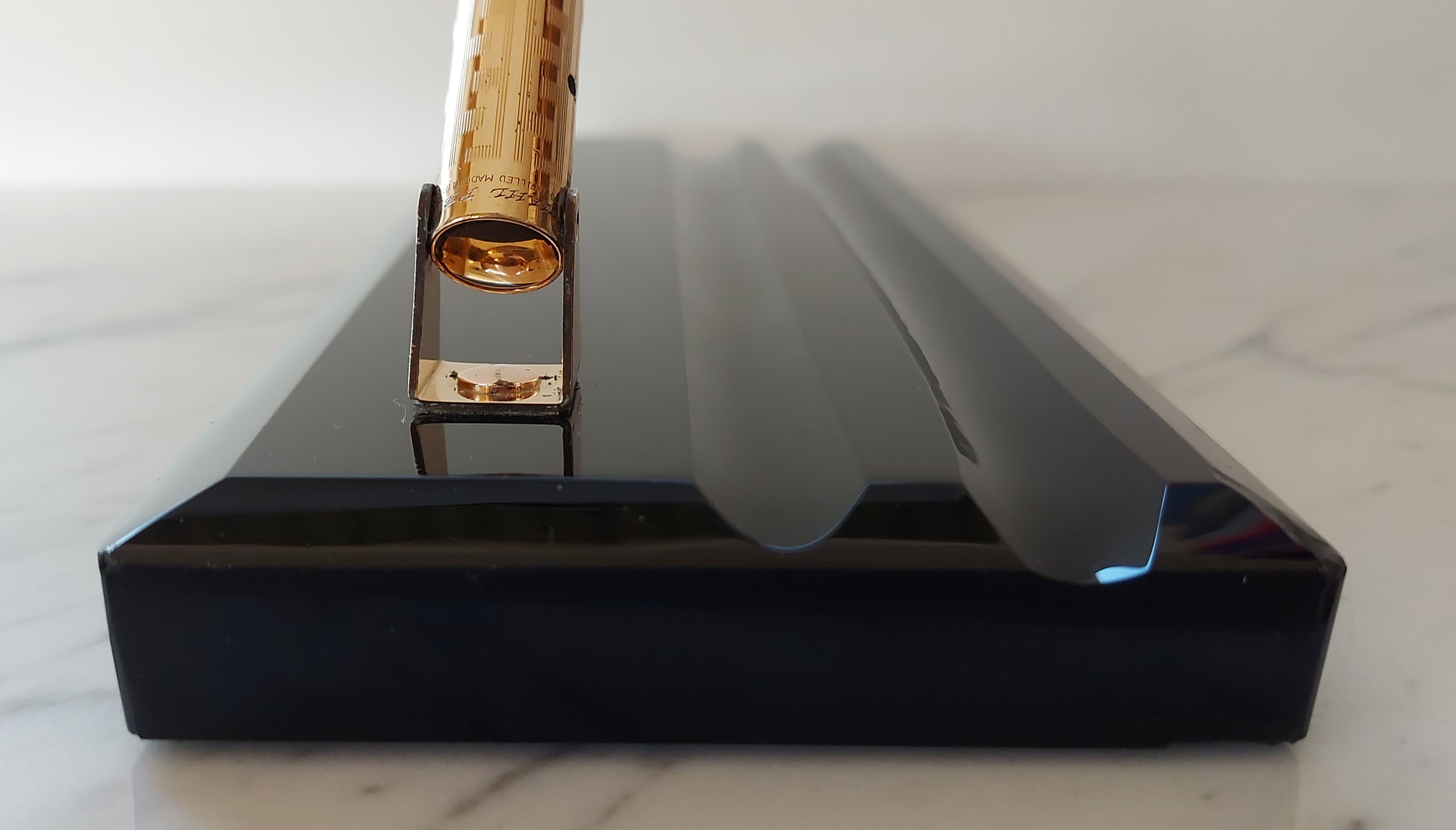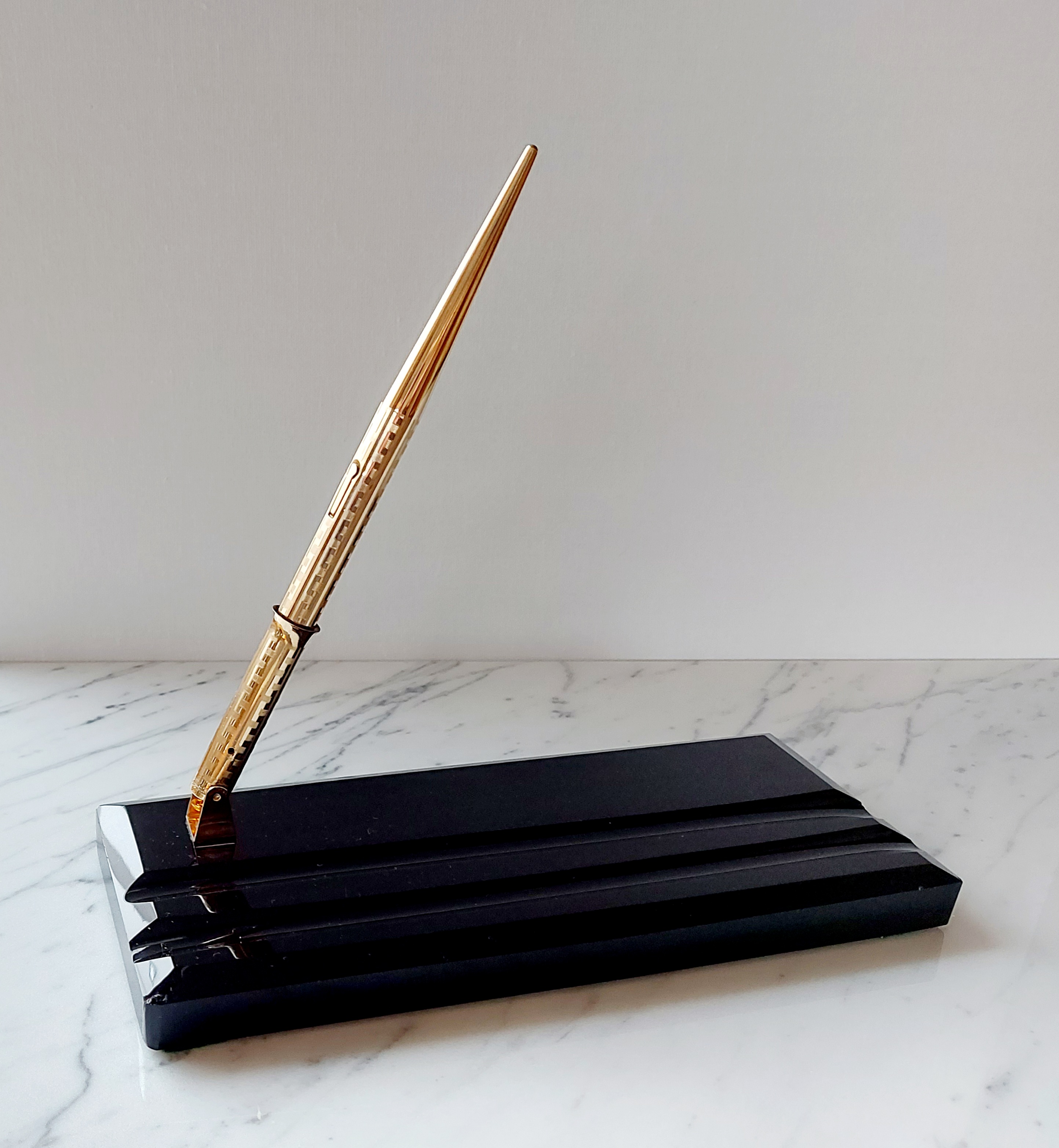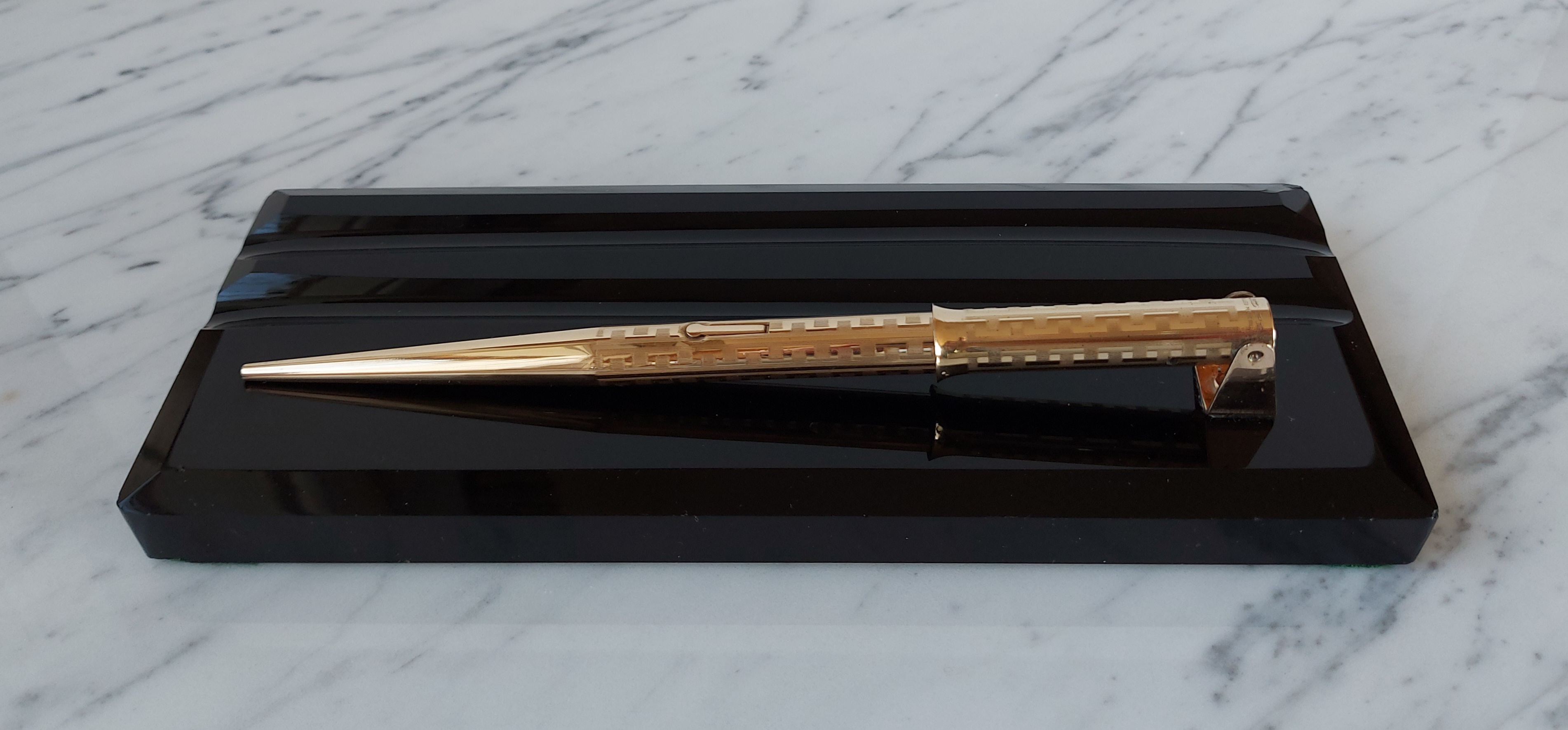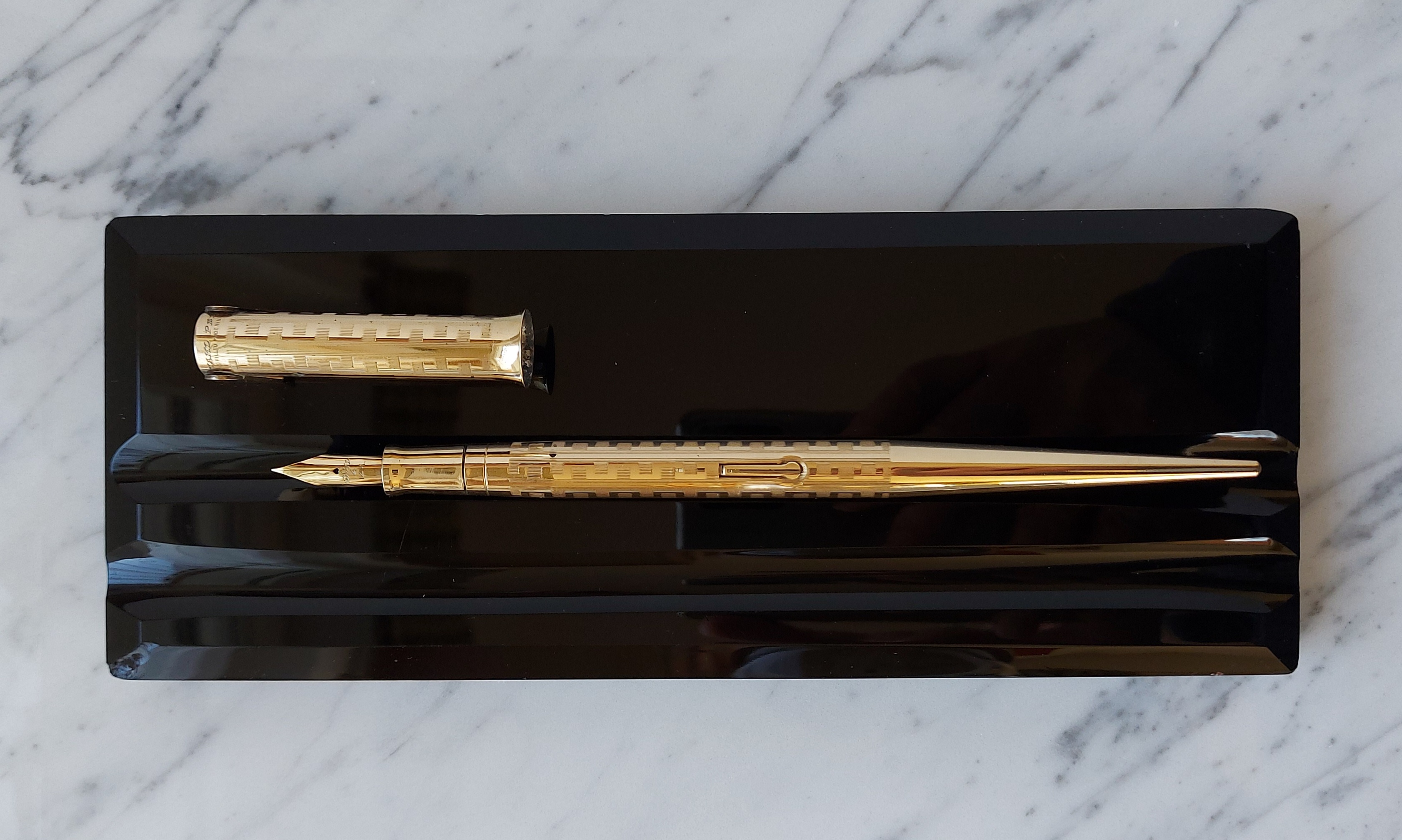 Pesante base in vetro nero, con due scanalature, smussata e lucidata, equipaggiata con un calice avvitato ed una stilografica tutti in metallo (all metal) laminati in oro giallo con decoro “Grecian Border”; stilografica con terminale rastremato (coda-le) in unico pezzo, corretto pennino WAHL #4 [F] Falcon in oro 14 carati con alimentatore “a pettine” in ebanite, caricamento a levetta, produzione U.S.A. anno 1925.