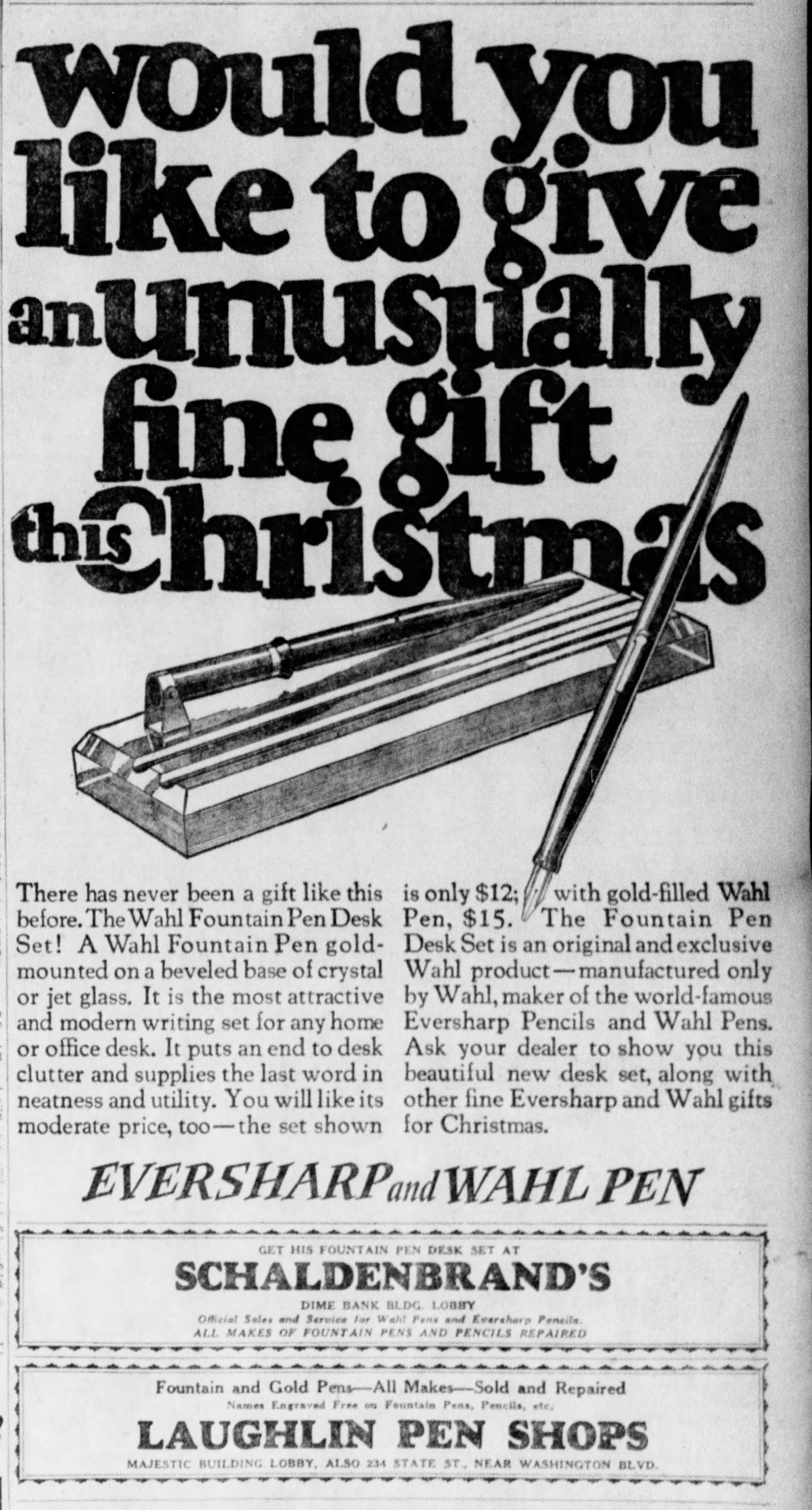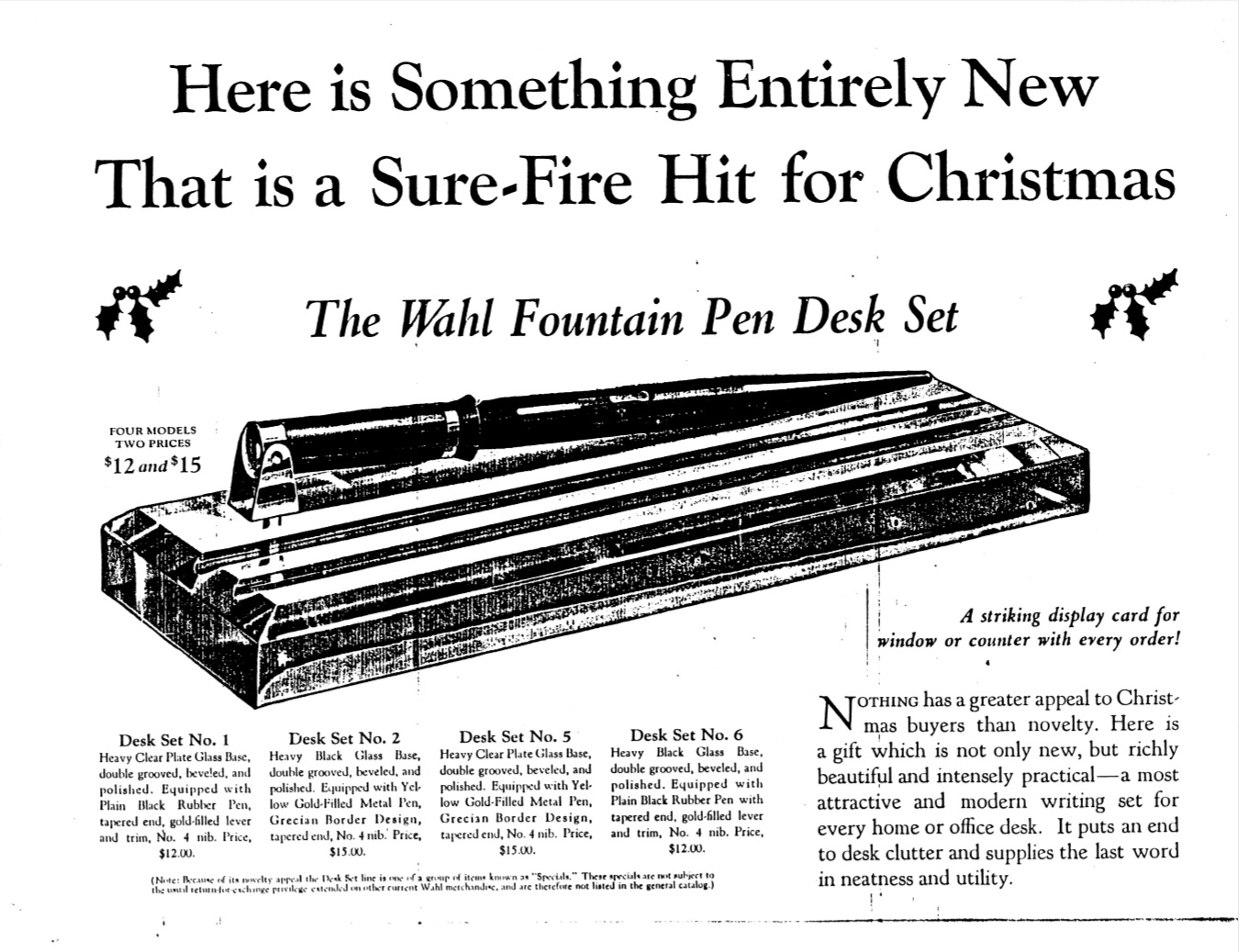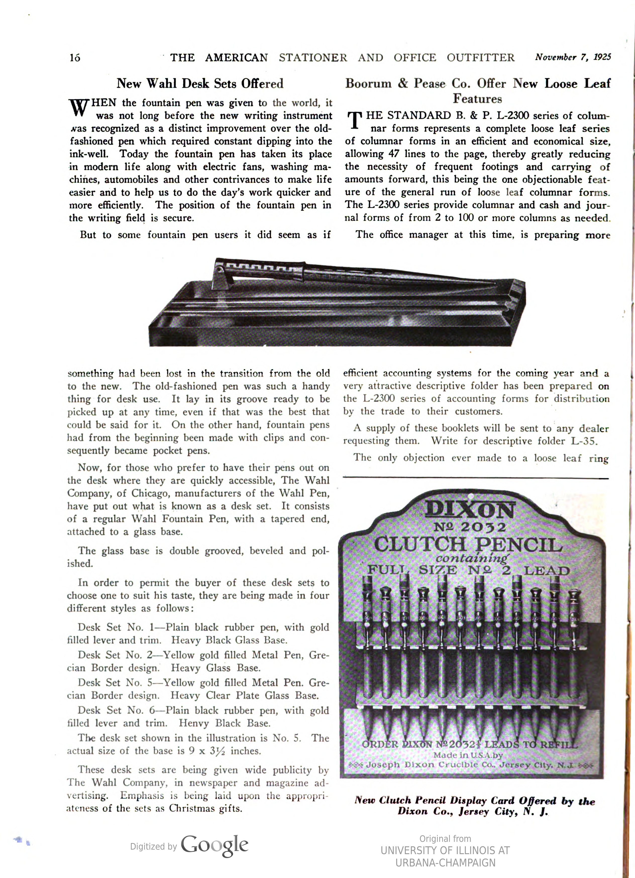 La Wahl-Eversharp era stata pioniera tra le Big Four nella produzione dei nuovissimi set da scrivania, con un prodotto già disponibile alla fine del 1925, uscito in contemporanea con la proposta di stiloforo della Sheaffer che però, a mio giudizio, risulta inferiore sia stilisticamente (nel confronto tra i top di gamma) che tecnicamente (non essendo orientabile). Sheaffer’s Desk Set - 1925.10. Geyer’s Stationer (fonte visibile direttamente)