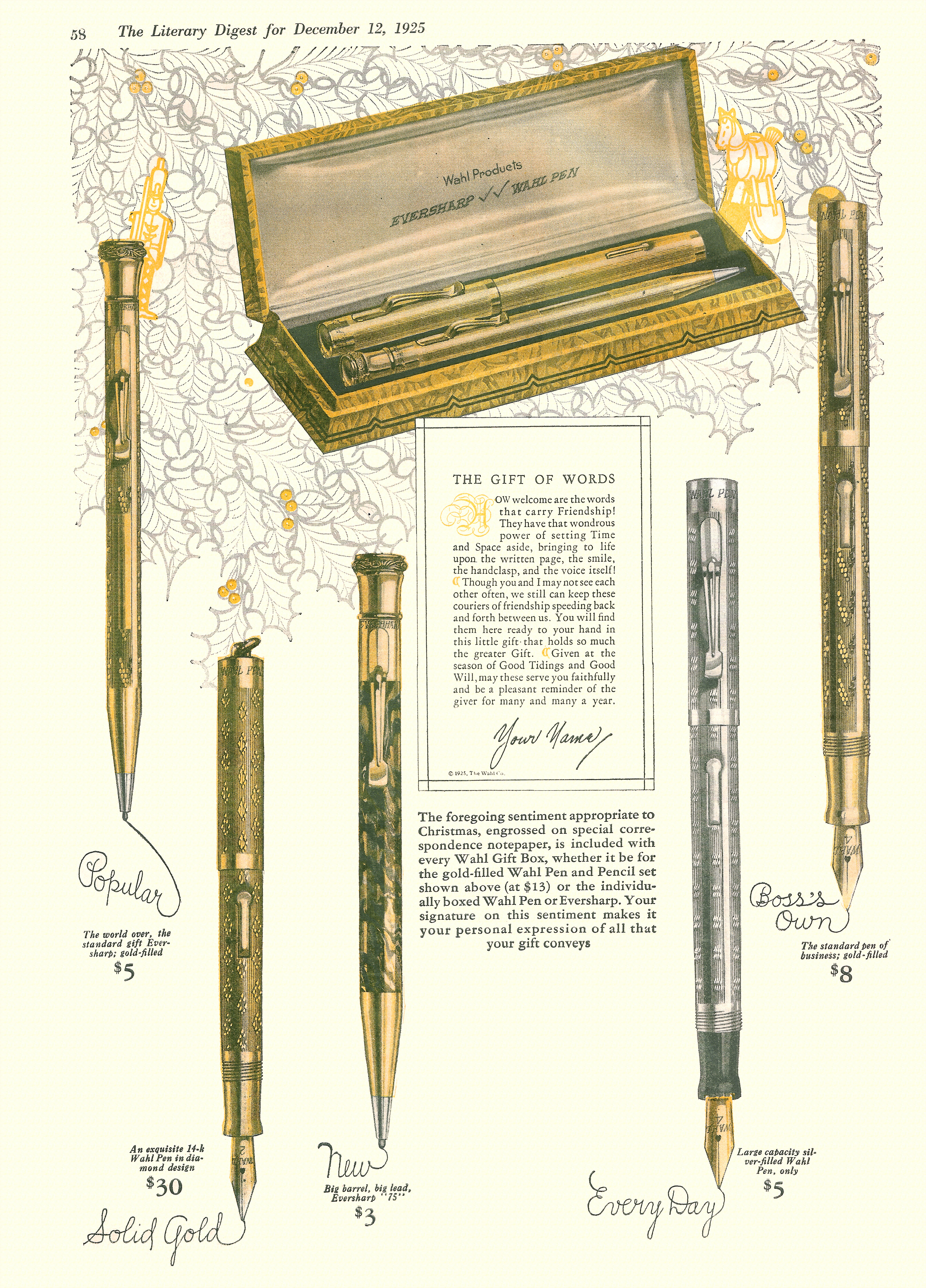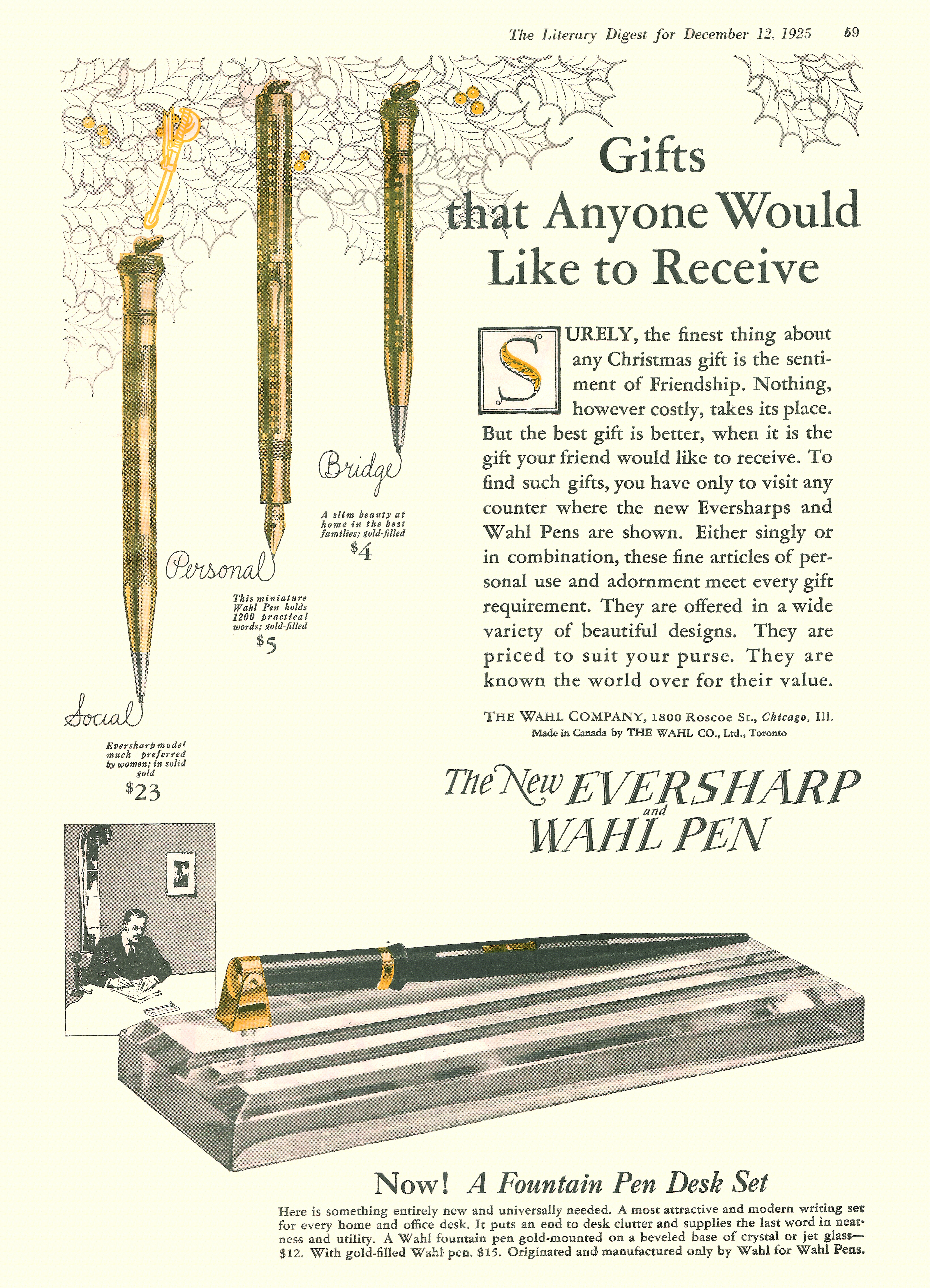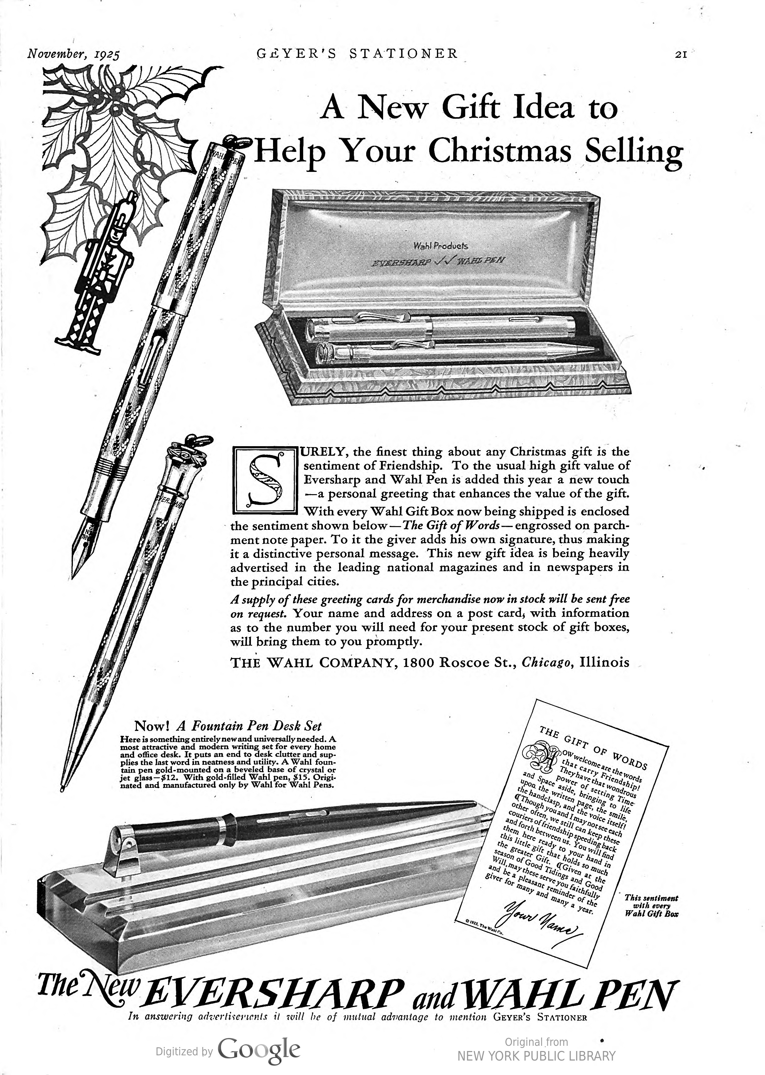 La Wahl-Eversharp era stata pioniera tra le Big Four nella produzione dei nuovissimi set da scrivania, con un prodotto già disponibile alla fine del 1925, uscito in contemporanea con la proposta di stiloforo della Sheaffer che però, a mio giudizio, risulta inferiore sia stilisticamente (nel confronto tra i top di gamma) che tecnicamente (non essendo orientabile). Sheaffer’s Desk Set - 1925.10. Geyer’s Stationer (fonte visibile direttamente)