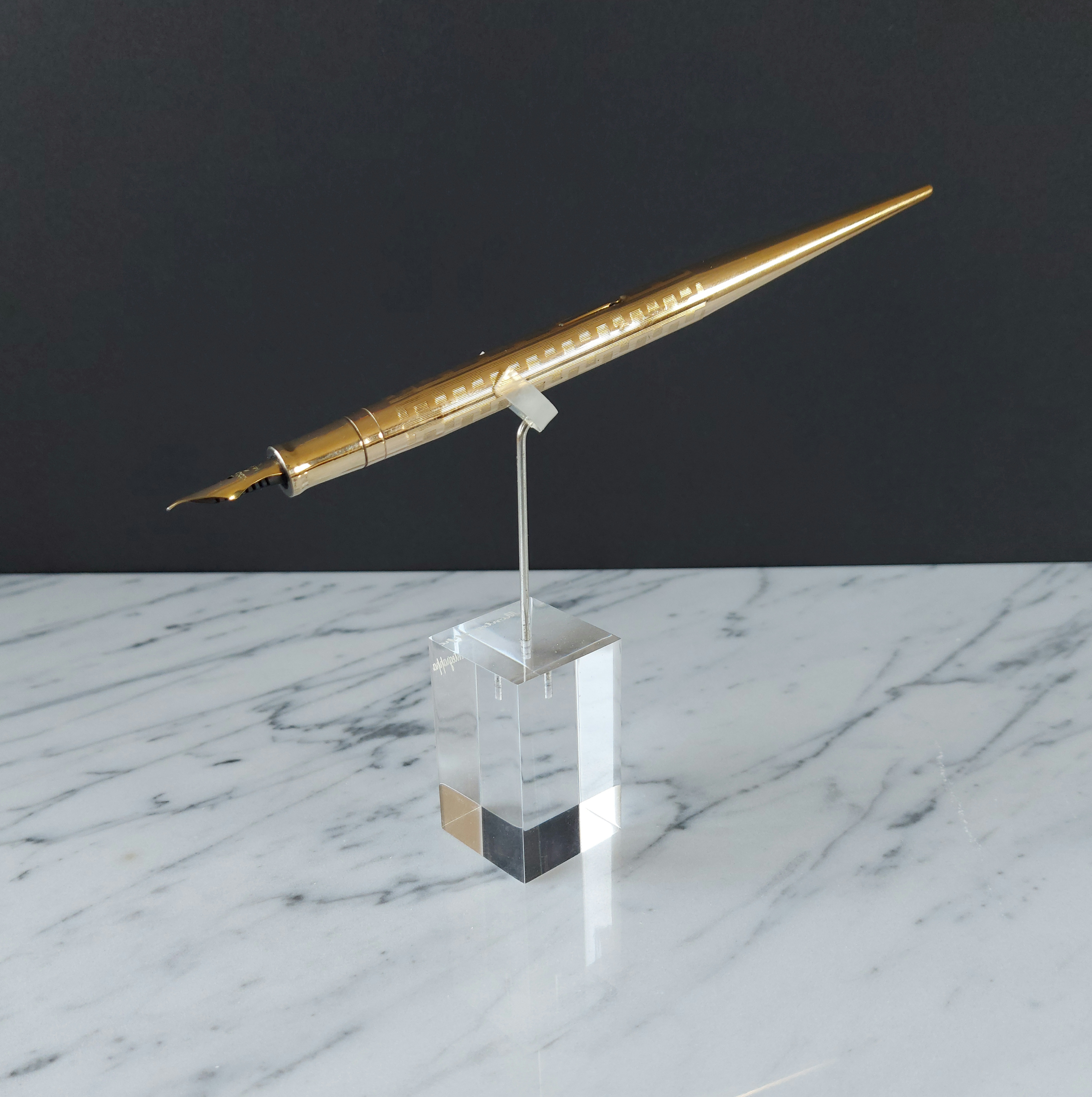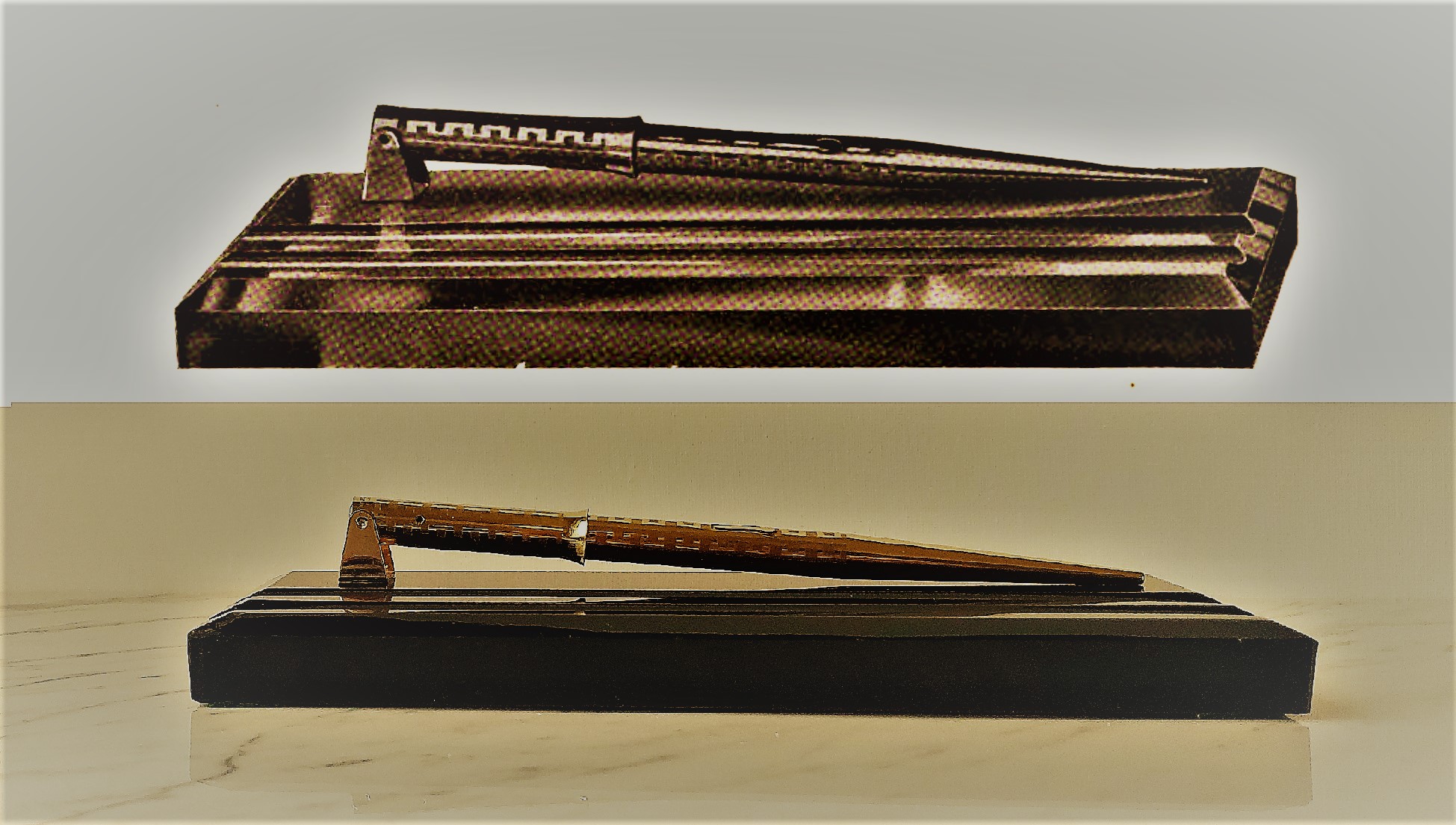 Il primo passo dei designer fu perciò quello di semplificare il più possibile la struttura, mettendo in primo piano la vera novità che veniva posta in vendita, che era l’autosufficienza della penna stilografica (grazie al serbatoio di inchiostro incorporato), penna che a riposo sarebbe rimasta sempre in piena e bella vista sulla scrivania, magari mostrando lo scintillante rivestimento dell’oro che ricopriva l’intero strumento (come nello splendido “prototipo” in presentazione).