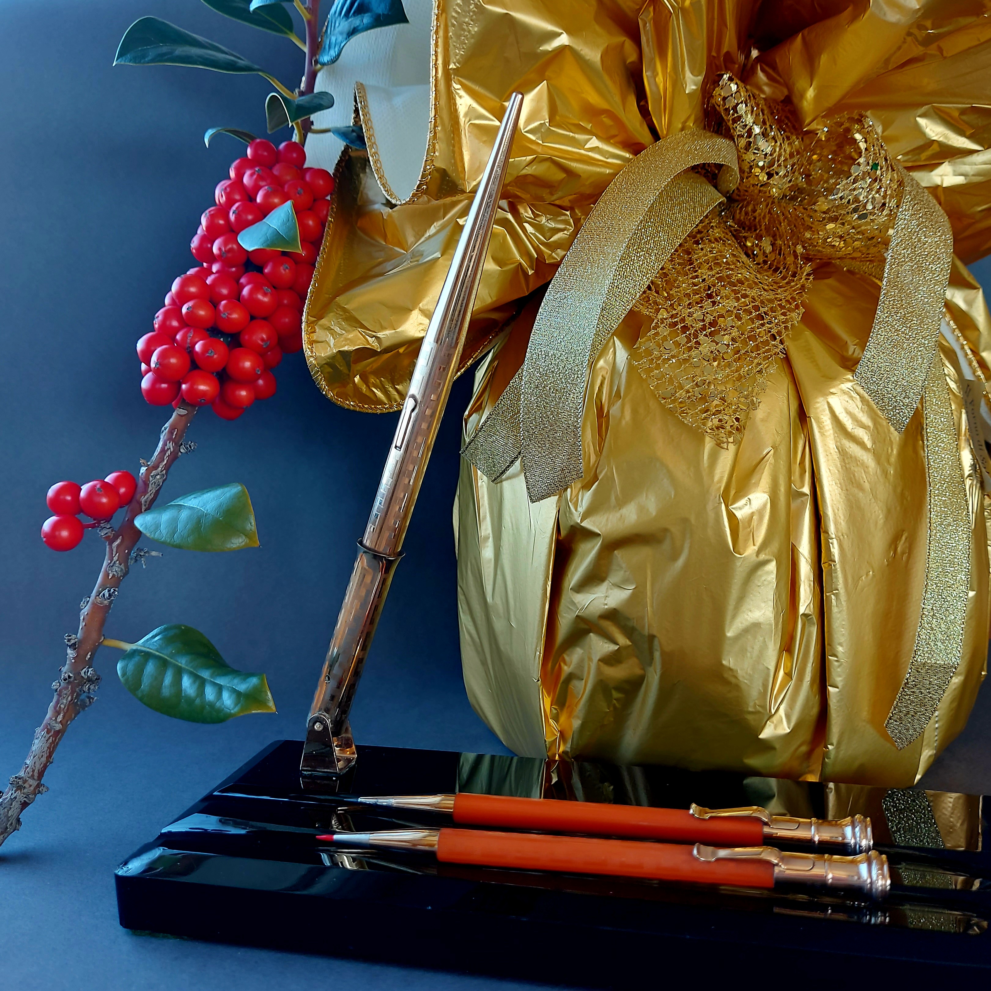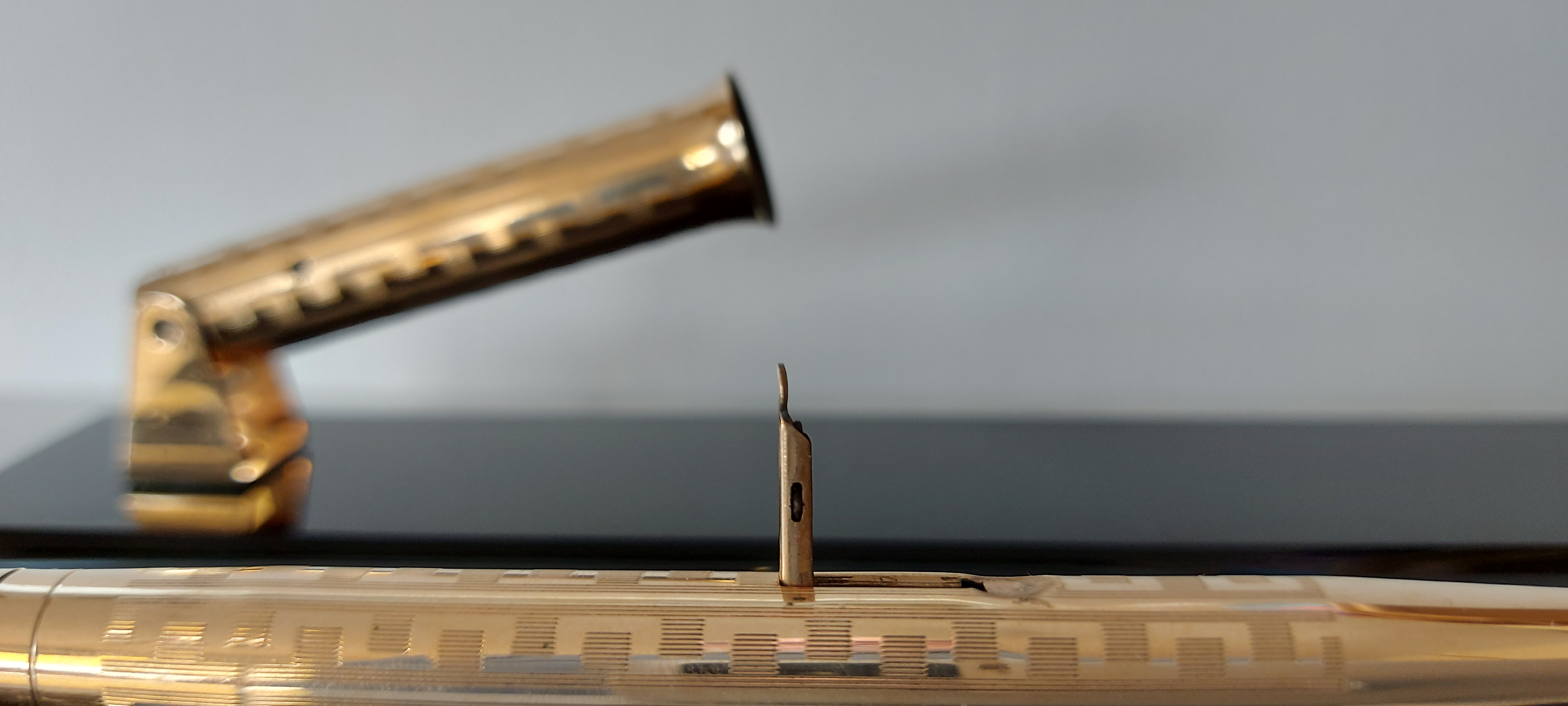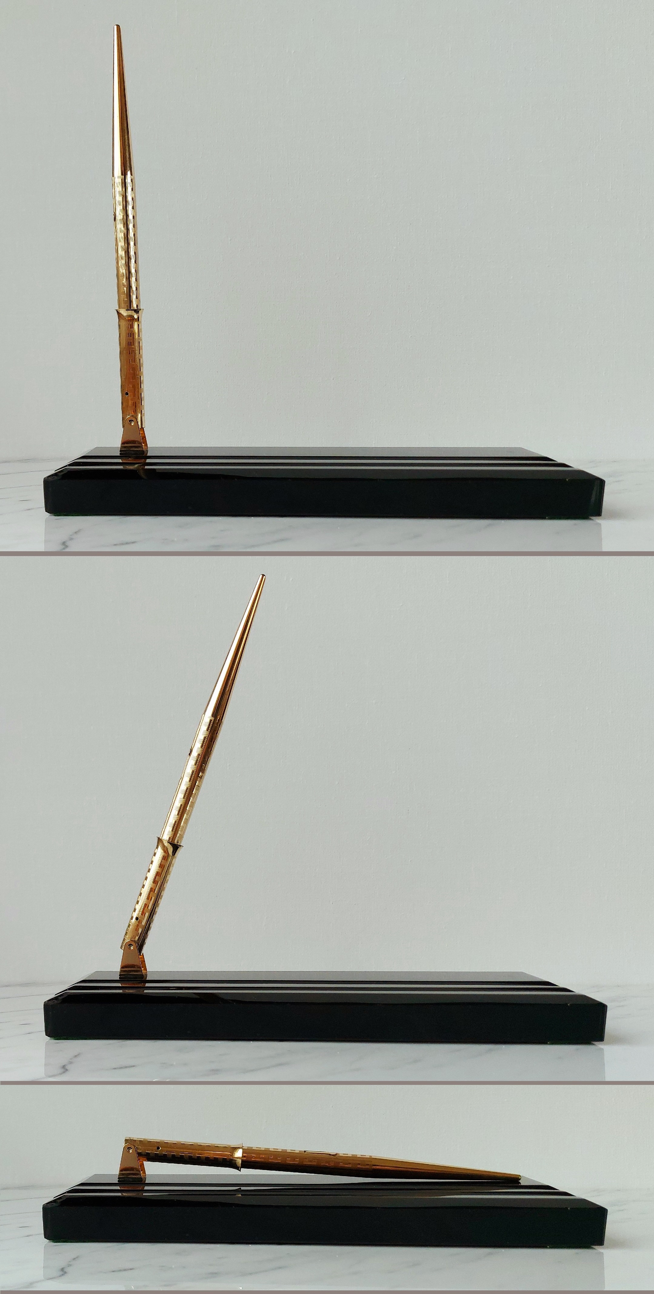 • tecnicamente rispondeva anche all’esigenza di orientare facilmente il gruppo calice/penna in ogni direzione sfruttando il principio della leva, evitando nel contempo di causare danni quando la penna veniva urtata accidentalmente in quanto, per lo stesso principio, la coda si sarebbe spostata senza causare il movimento solidale dell’intera base dello stiloforo; la possibilità (pubblicizzata) di chiudere il tutto sotto chiave in un basso cassetto a fine giornata va appena menzionata…