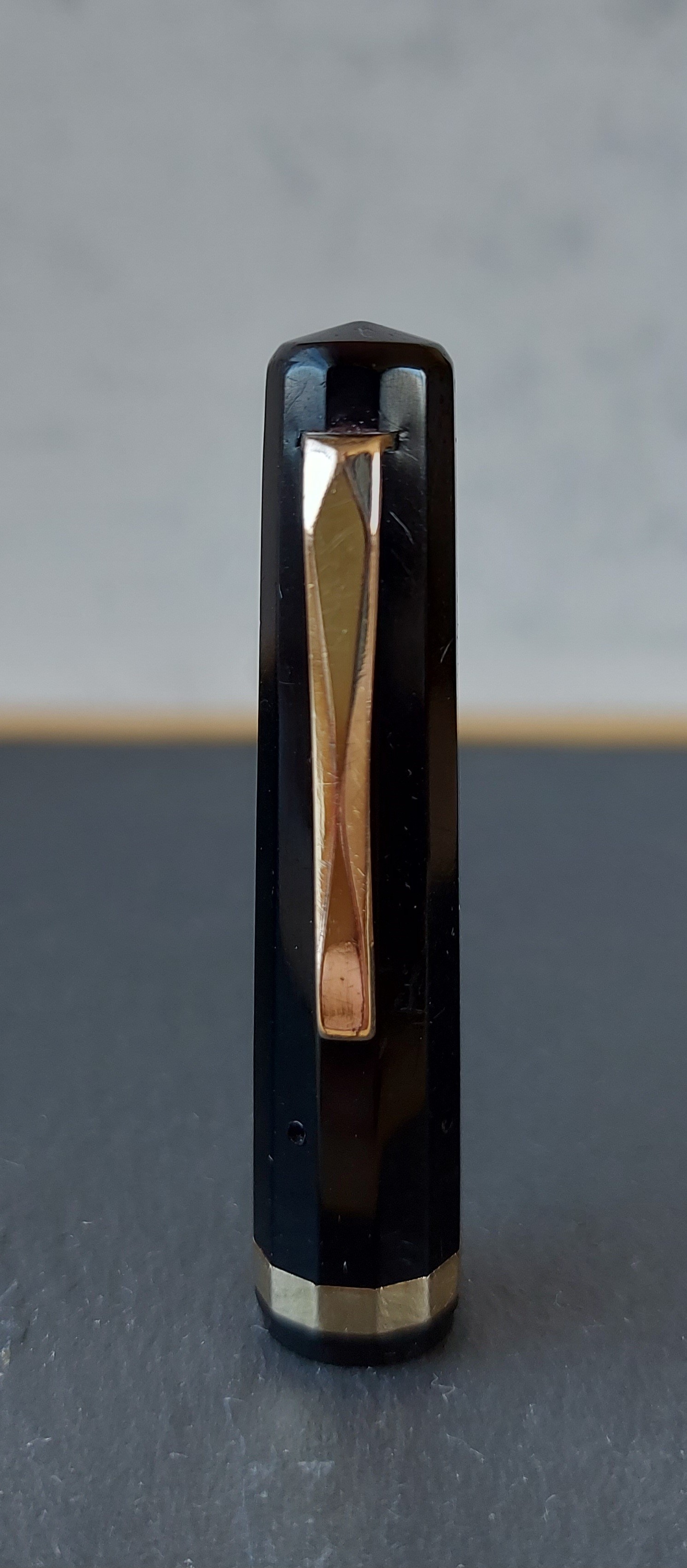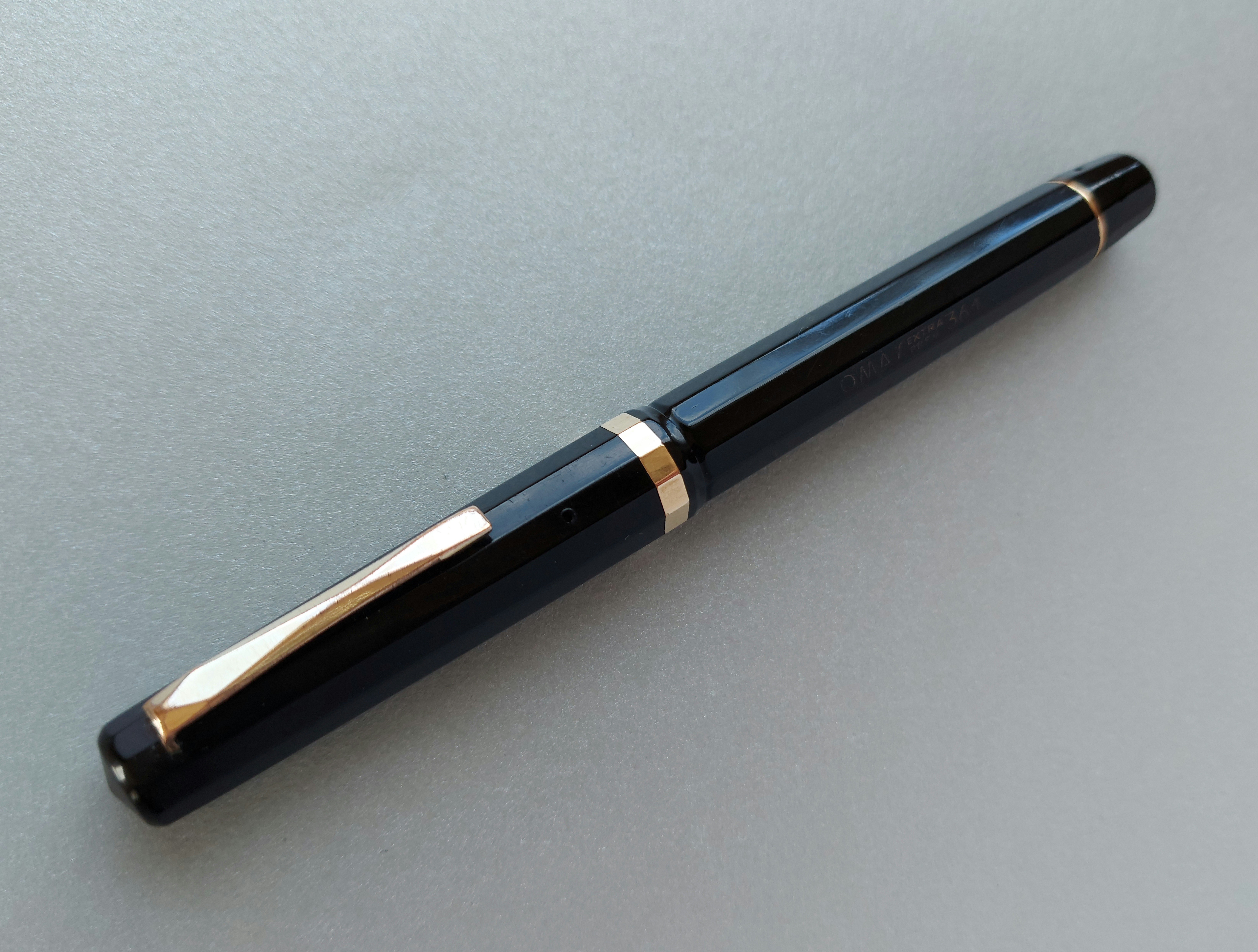 OMAS EXTRA 361 [F] misura standard (media) in celluloide nera faccettata (12 facce) tornita dal pieno, parti metalliche a vista laminate oro, cappuccio a vite, pennino centrale corazzato Omas in oro 14 carati, con sistema di doppia scrittura rigida/flessibile, caricamento a pistone, produzione Italia, anno 1948.