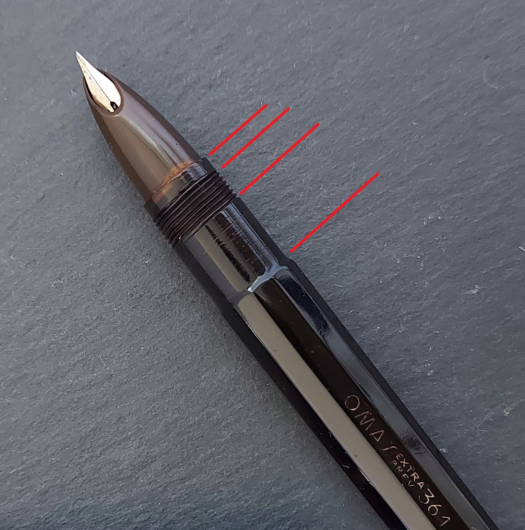 Aggiungo una immagine della mia 361, piuttosto vissuta, con i cerchietti indicatori che hanno perso la doratura. Eppure la penna è perfettamente efficiente e pronta all'uso.