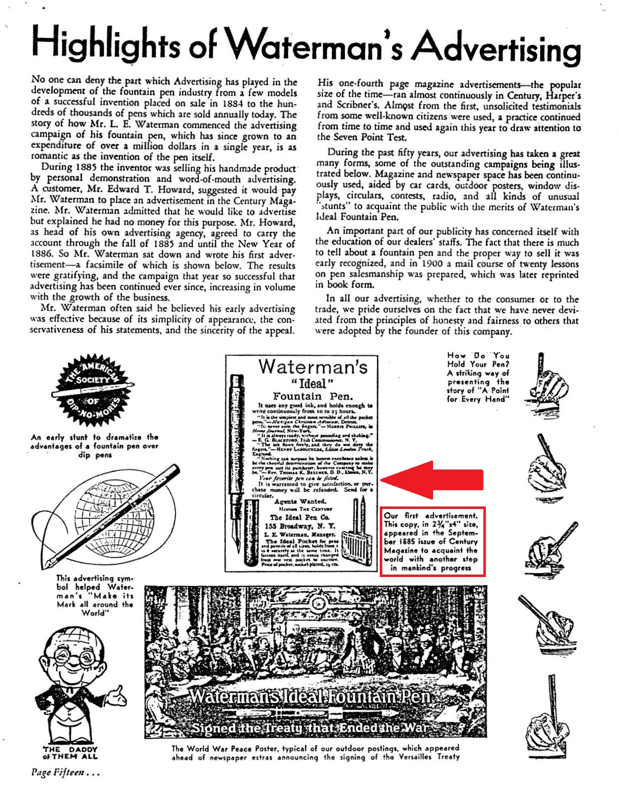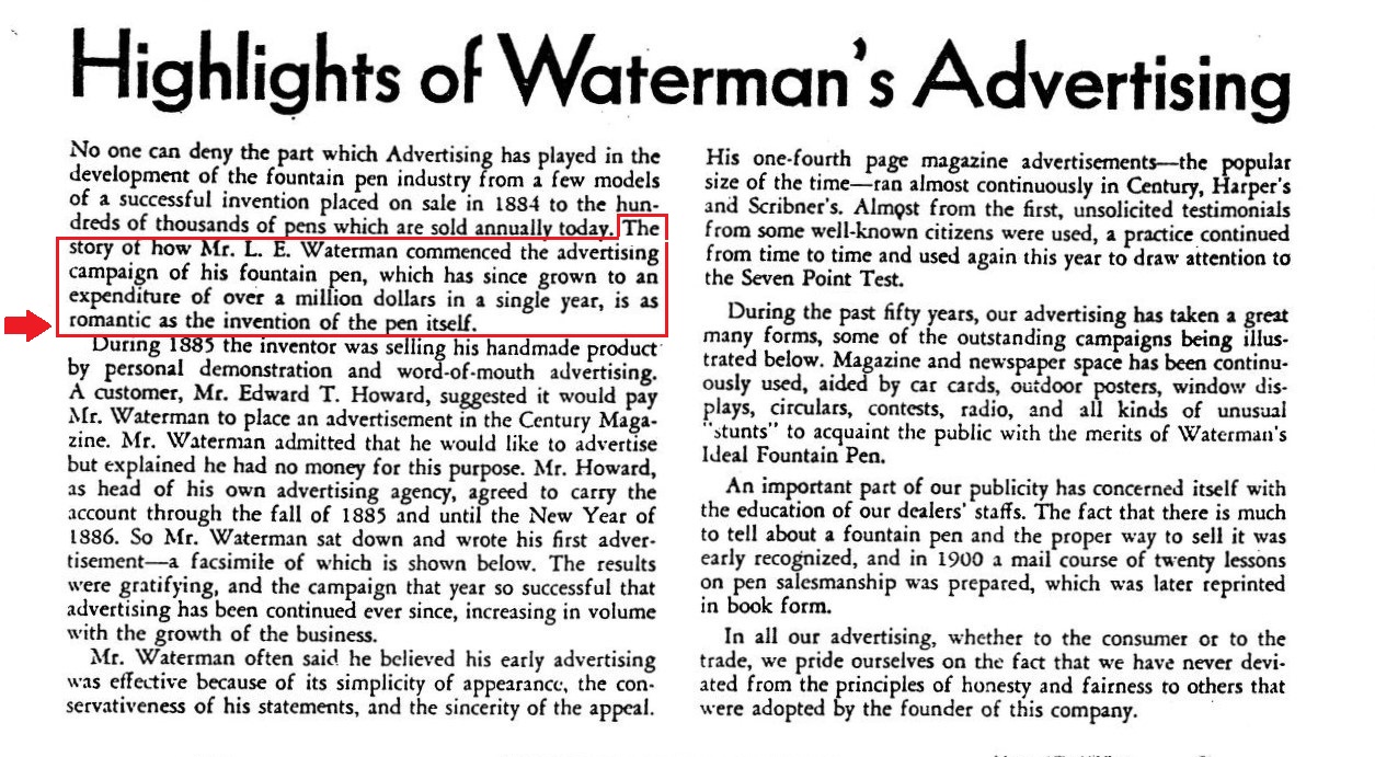 Questa ricostruzione, molto articolata (proprio come quella della macchia di inchiostro sul contratto assicurativo), descrive un Lewis Edson Waterman che nel 1885 non poteva ancora permettersi il lusso delle inserzioni pubblicitarie su una rivista a diffusione nazionale, ma che fu convinto da un agente che se ne assunse temporaneamente gli oneri sicuro del risultato sulle vendite, dando così l'avvio al più straordinario utilizzo dei media pubblicitari nella storia degli strumenti di scrittura...