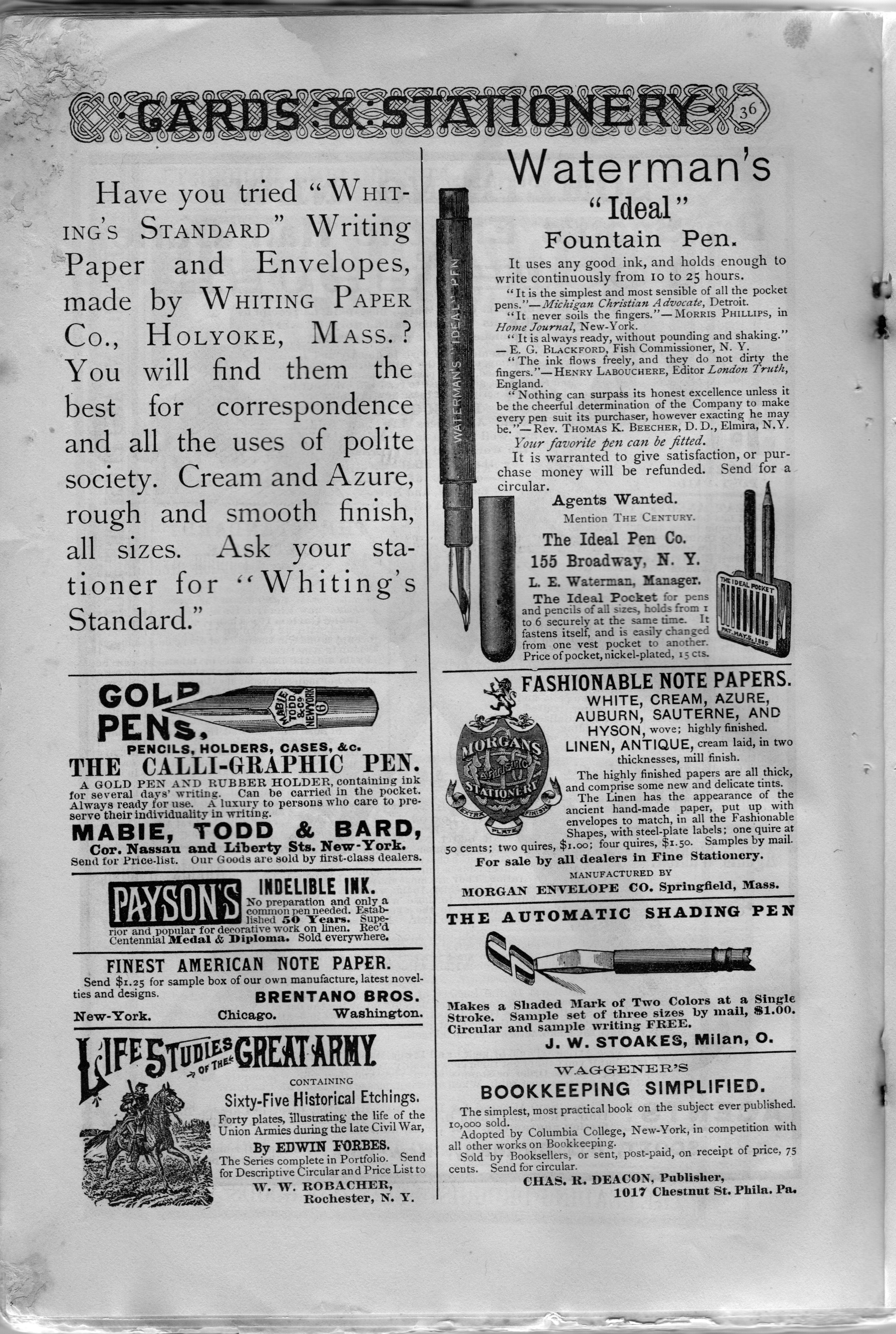 6. WATERMAN’S - First Ad. 1885-09. «The Century Illustrated Monthly Magazine» Vol.XXX n.5, pag.37 (delle Ad) - Copia.jpg