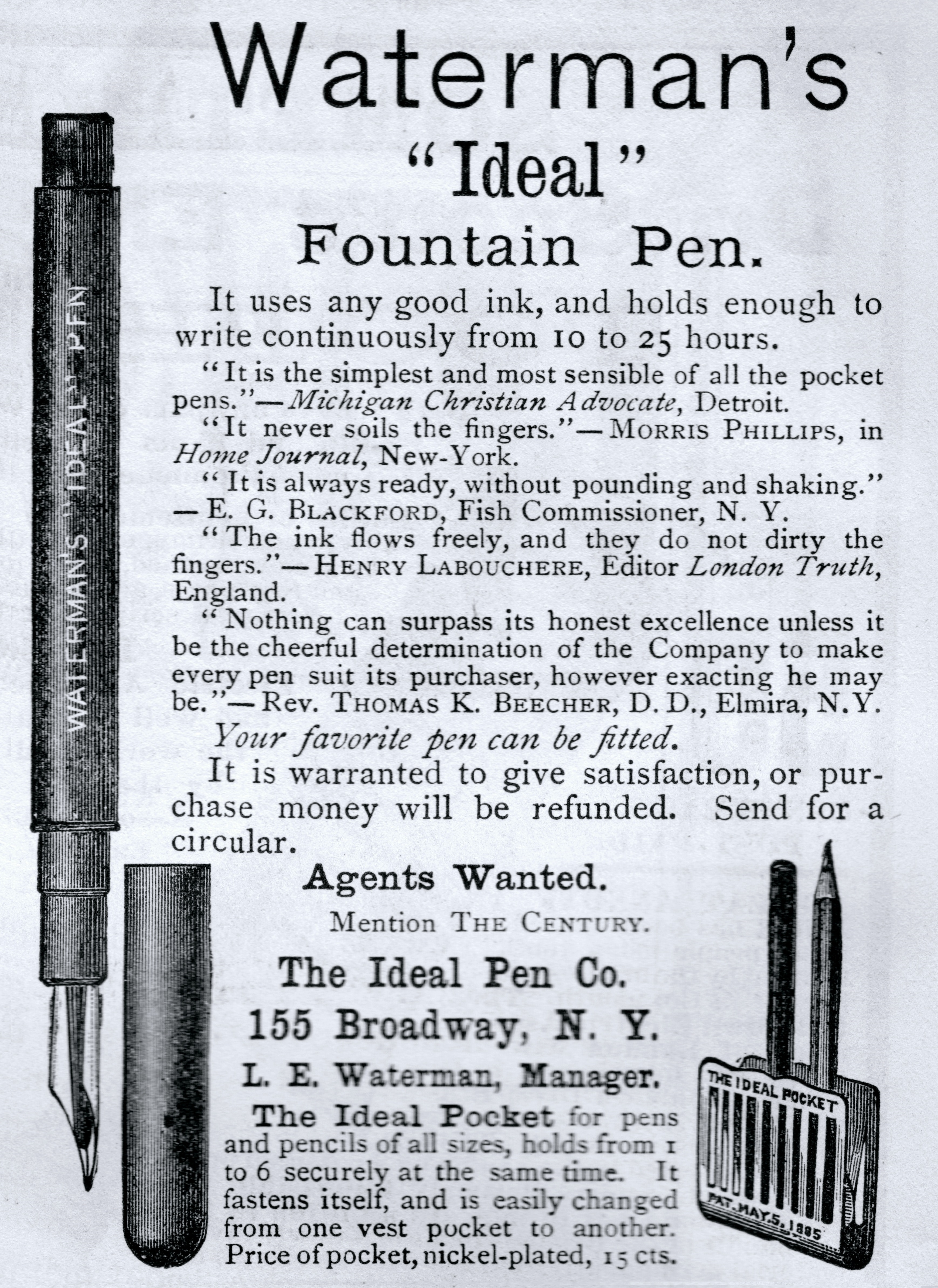 WATERMAN’S – Ideal Fountain Pen. 1885-09. «The Century Illustrated Monthly Magazine» Vol.XXX n.5, pag.37 (delle Ad)