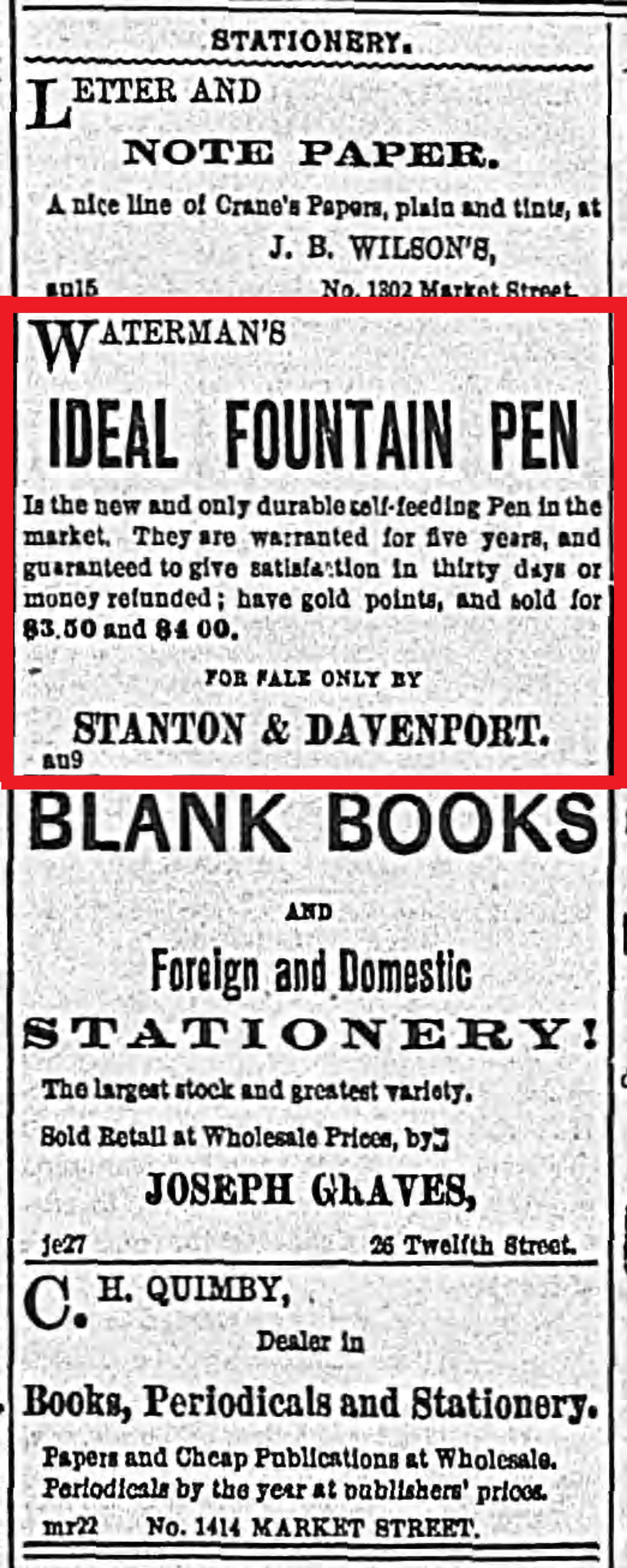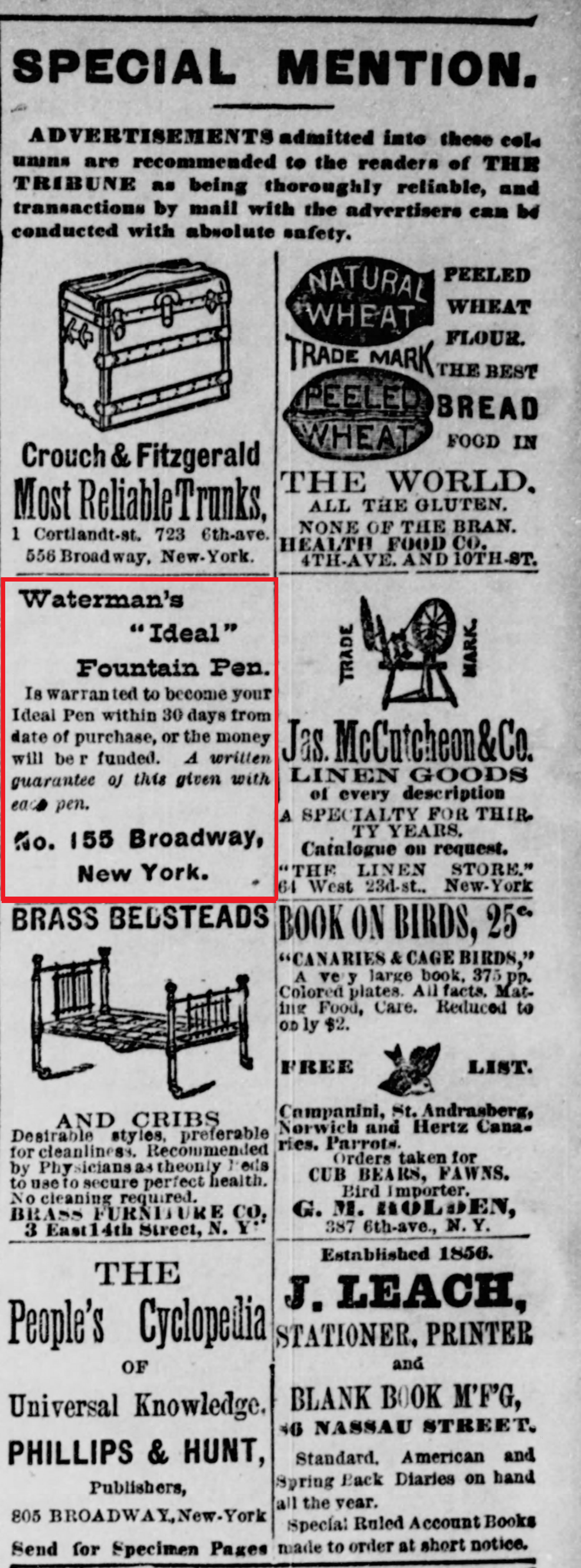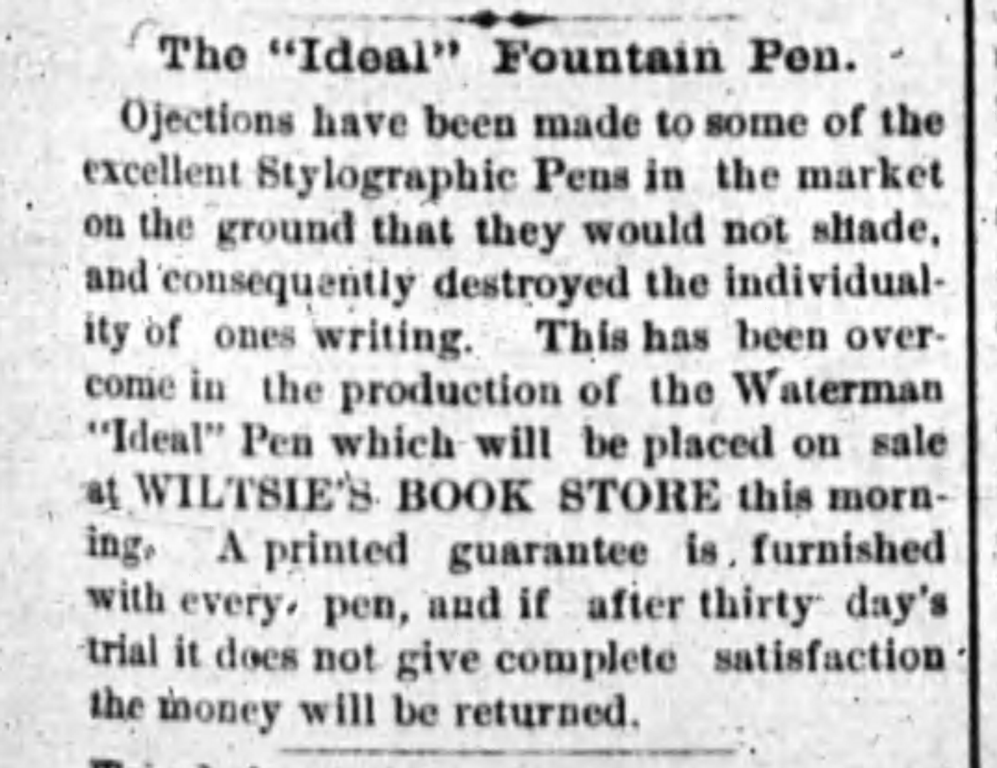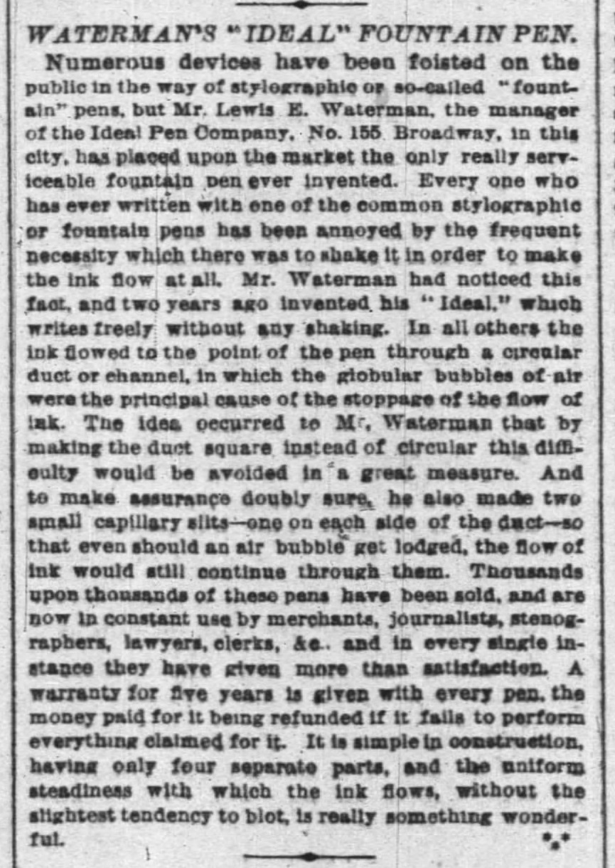 La prima citazione in assoluto del marchio “Waterman’s” precede di oltre un anno la “famosa” pubblicità che ho allegato, ma è posteriore di alcuni mesi rispetto alla Ad presente sulla rivista legale citata da Nishimura: era il maggio del 1884 e in una inserzione isolata (non appartenente ad alcuna “campagna”, né locale né, tanto meno, nazionale) si proponeva l’acquisto di una stilografica Waterman’s “Ideal” usufruendo della clausola “soddisfatti o rimborsati”, dopo un periodo di prova di 30 giorni.