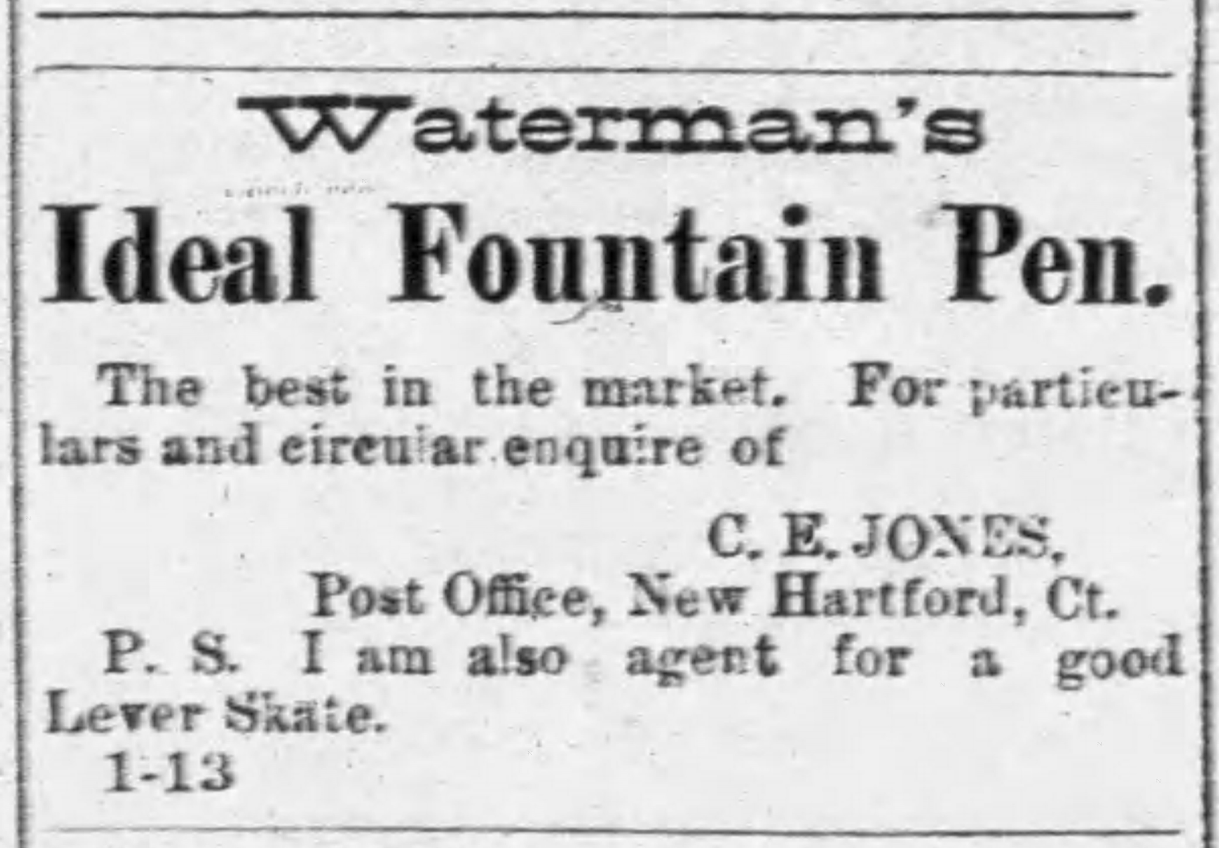Nel dicembre del 1884 (in tempo per i regali di Natale) una manciata di pubblicità generiche di singoli negozi, delle quali l’unica minimamente dettagliata è la seguente, dal Connecticut, in cui l’agente delle stilografiche Waterman’s dichiara di essere nel contempo anche agente di buoni “pattini” [da ghiaccio], giusto in caso di indecisioni sui regali dell’ultimo minuto... :mrgreen:
