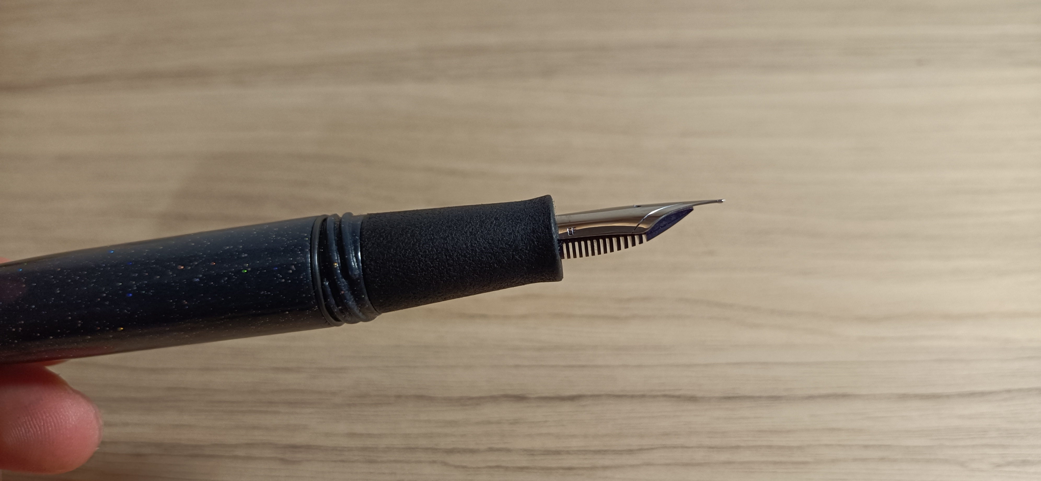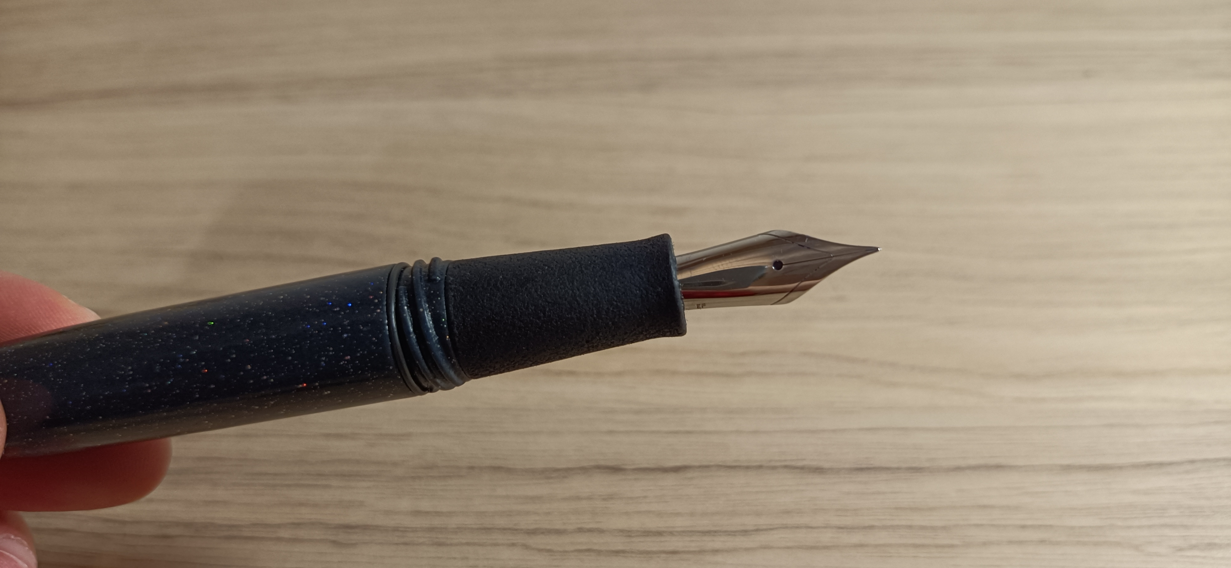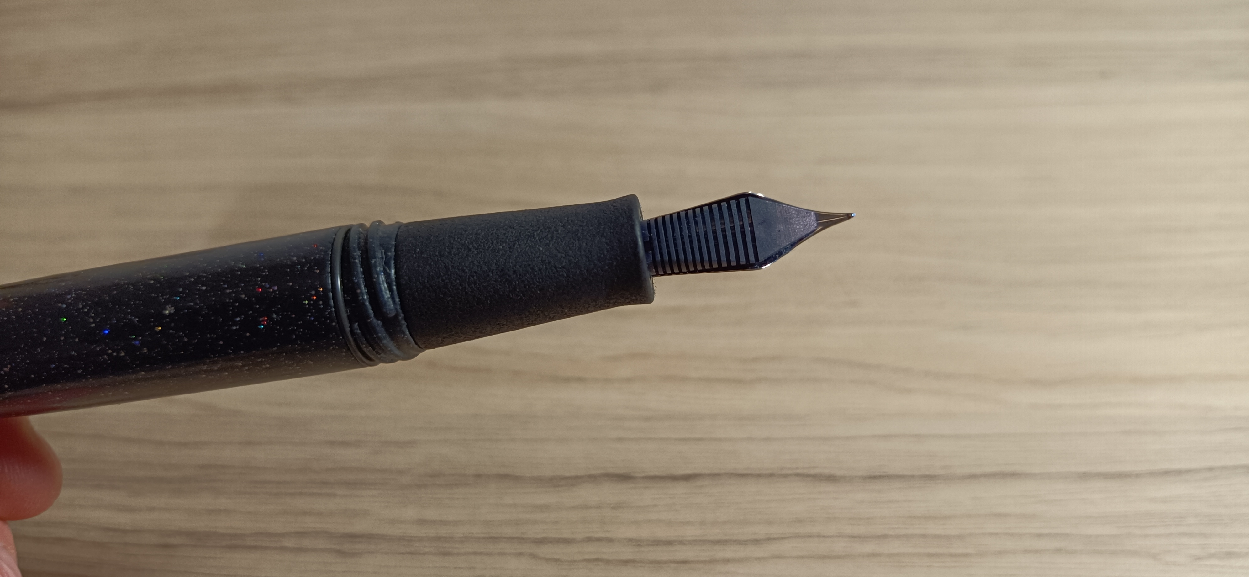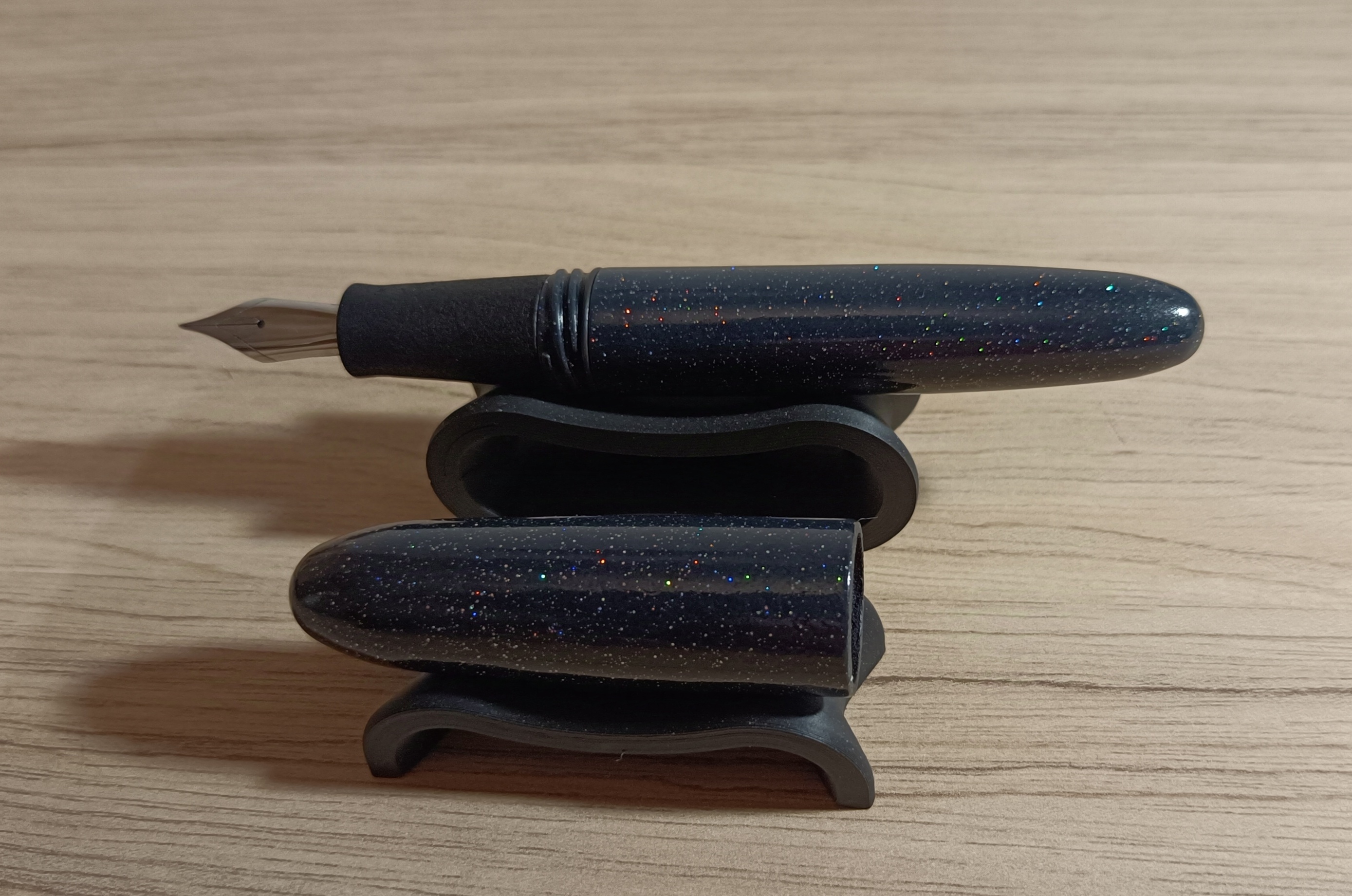 Andiamo ora alla descrizione esteriore della penna: si tratta di una penna realizzata interamente in resina (precisamente nylon 12) stampata in 3D, senza clip né alcun elemento metallico. Le dimensioni sono: 136 mm chiusa, 125 mm aperta, la forma è a sigaro e il corpo e il cappuccio sono ricoperti di vernice semilucida glitterata (il venditore al Penshow mi ha assicurato che è molto resistete e difficile da graffiare). Svitando il cappuccio viene rivelata una sezione in resina nera dalla finitura ruvida, “sabbiata”, piuttosto lunga, e un pennino Jowo numero 6. Interessante è la filettatura a tre principi che permette la chiusura/apertura con solo mezzo giro e tiene perfettamente (ho fatto il test delle 72 ore senza scrivere a testa in su nel portapenne ed è ripartita senza fare una piega) forse anche grazie all’o-ring posto alla fine della filettatura. Non è presente alcun segno dello stampo, tutto è stato pulito alla perfezione. La sensazione al tatto è molto piacevole, sia della parte laccata che della parte nuda dell’impugnatura. La penna è molto leggera: pesa 19 grammi con il cappuccio e 13 senza (converter e inchiostro inclusi). Il pennino è un semplice Jowo numero 6 in acciaio, senza marchi o fregi, con alimentatore in ABS.