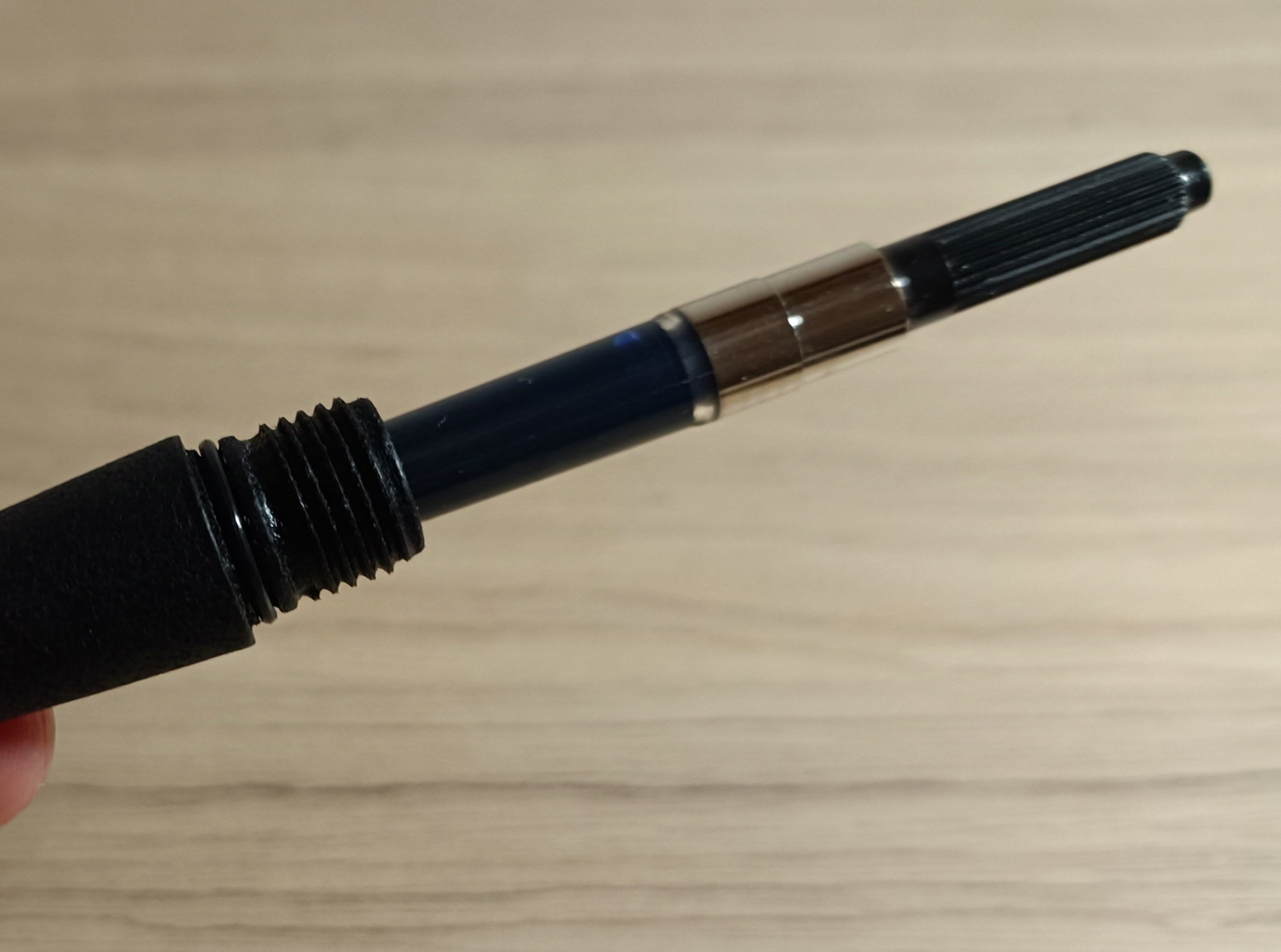 Il sistema di caricamento è il classico cartuccia/converter ad attacco standard, la penna viene fornita con un converter Schmidt filettato che si avvita nella sezione. Il fusto si avvita sulla sezione tramite una lunga filettatura che presenta alla fine un o-ring, indice che la penna è pensata per essere convertita al caricamento a contagocce (cosa che non mi sogno minimamente di fare; ho visto comunque modelli in resina trasparente convertiti a contagocce con l’inchiostro a vista, davvero un bell’effetto). Il caricamento con il converter è avvenuto alla perfezione, con l’innesto a vite non c’è assolutamente il timore che la sezione cada nel calamaio.