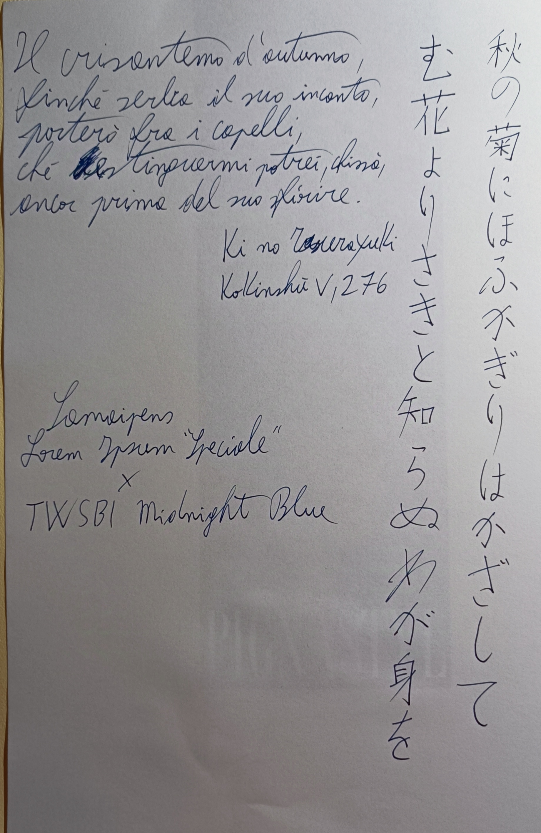 Passiamo dunque alle prestazioni di scrittura: il pennino fa il suo lavoro decisamente bene, il produttore mi ha detto che testa tutti i pennini singolarmente prima della spedizione insieme con il converter (e infatti ho trovato il pennino e il converter leggermente umidi, residuo del lavaggio post-test), e ciò sembra aver portato i suoi frutti. Il tratto è un EF, per i miei gusti è anche troppo scorrevole, infatti ho combinato un pasticcio scrivendo su carta Rhodia, meglio che mi tenga sulle carte più porose con questo pennino. Avevo comprato la penna pensando già di cambiare pennino mettendone uno con una punta speciale, ma devo dire che questo non va per niente male. Il tratto è ovviamente più largo di un extrafine giapponese, ma poco male.