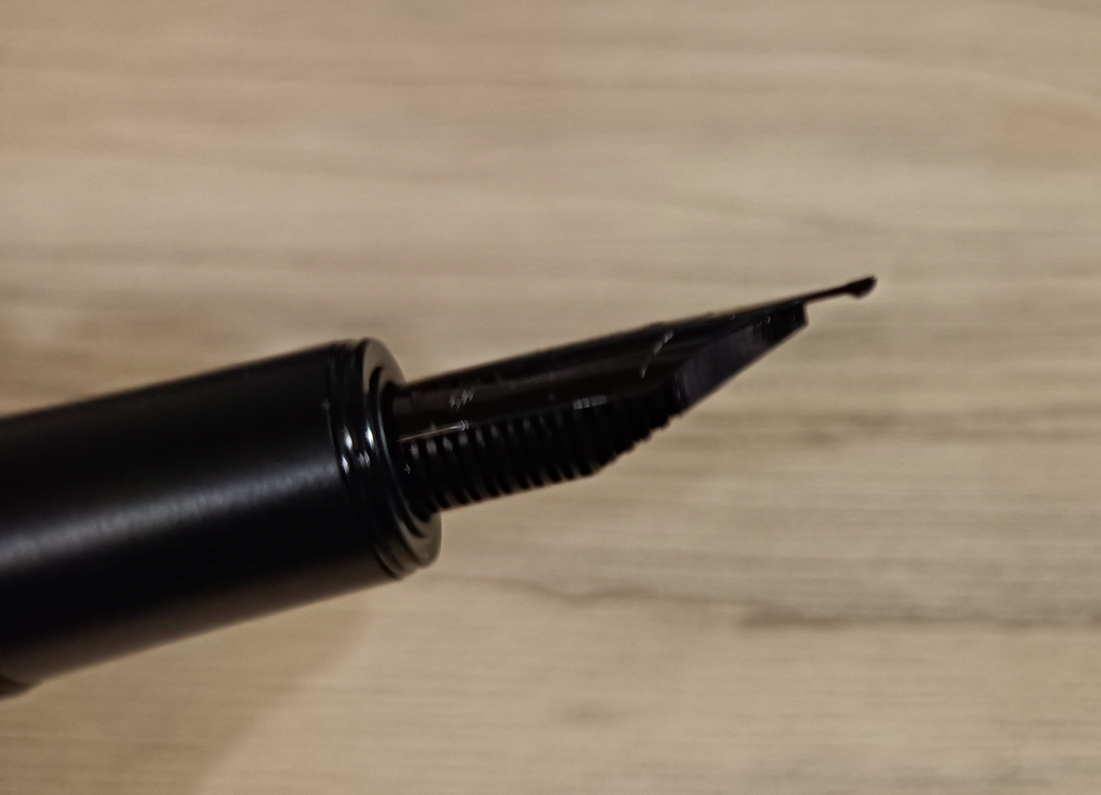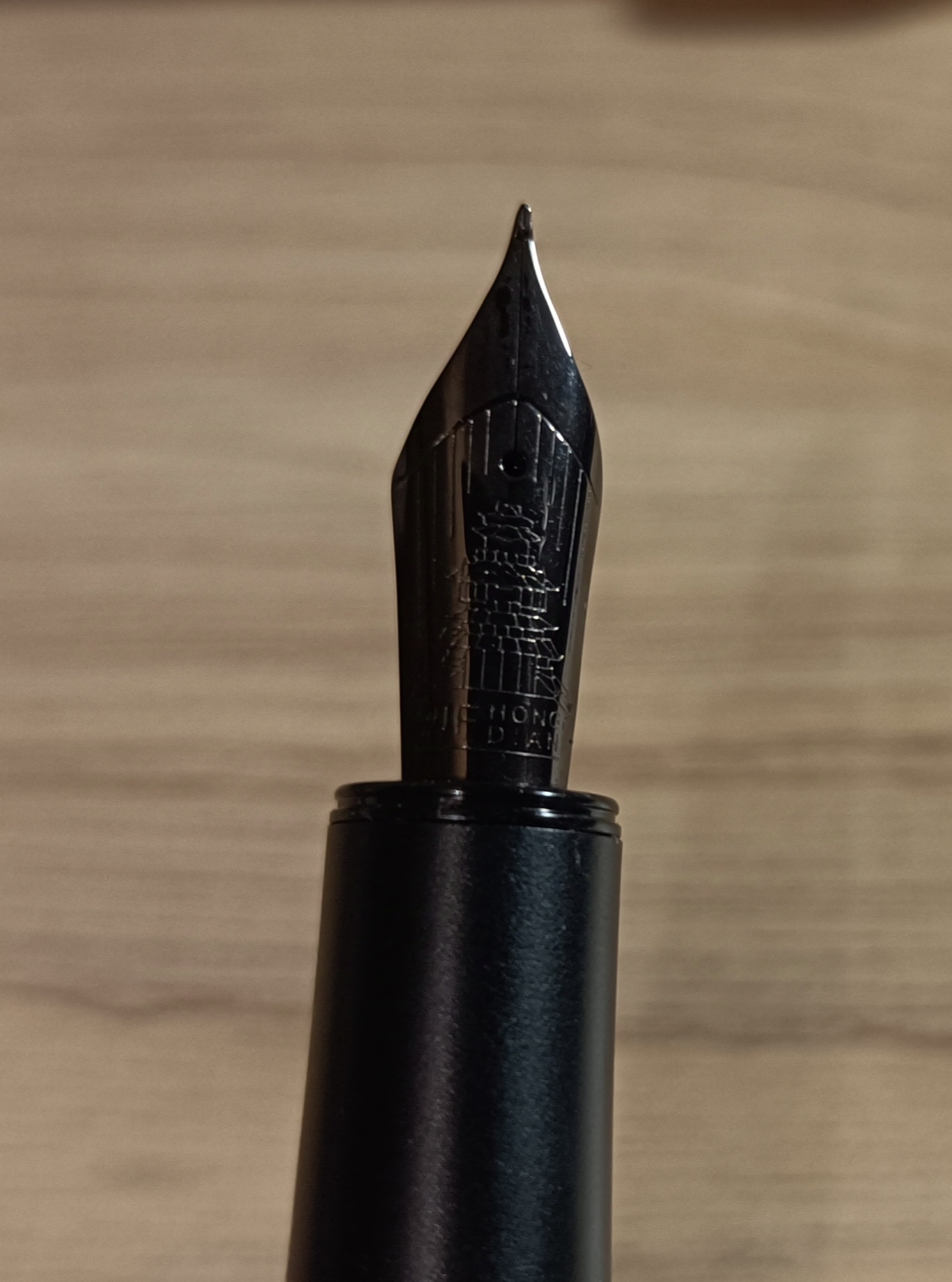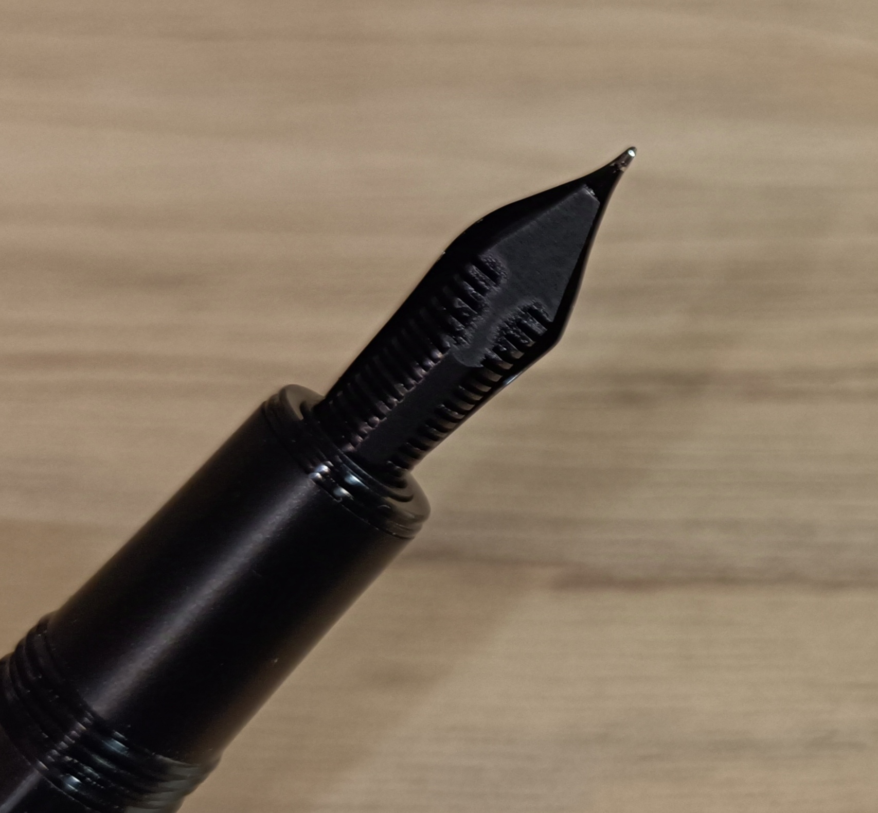 Svitando il cappuccio si scopre una finestra di ispezione in plastica fumé posta subito prima della filettatura, una sezione di scrittura dello stesso materiale e finitura del fusto (metallo anodizzato nero opaco) e il suo bel pennino in acciaio interamente brunito. Si tratta di un pennino equiparabile a uno di misura 6, presenta delle decorazioni di linee verticali tra le quali è incisa una pagoda, sotto di esse c’è l’incisione con il tratto in questo caso “刃 F”, e il nome del marchio. Al di sotto del pennino troviamo un bell’alimentatore in ebanite.