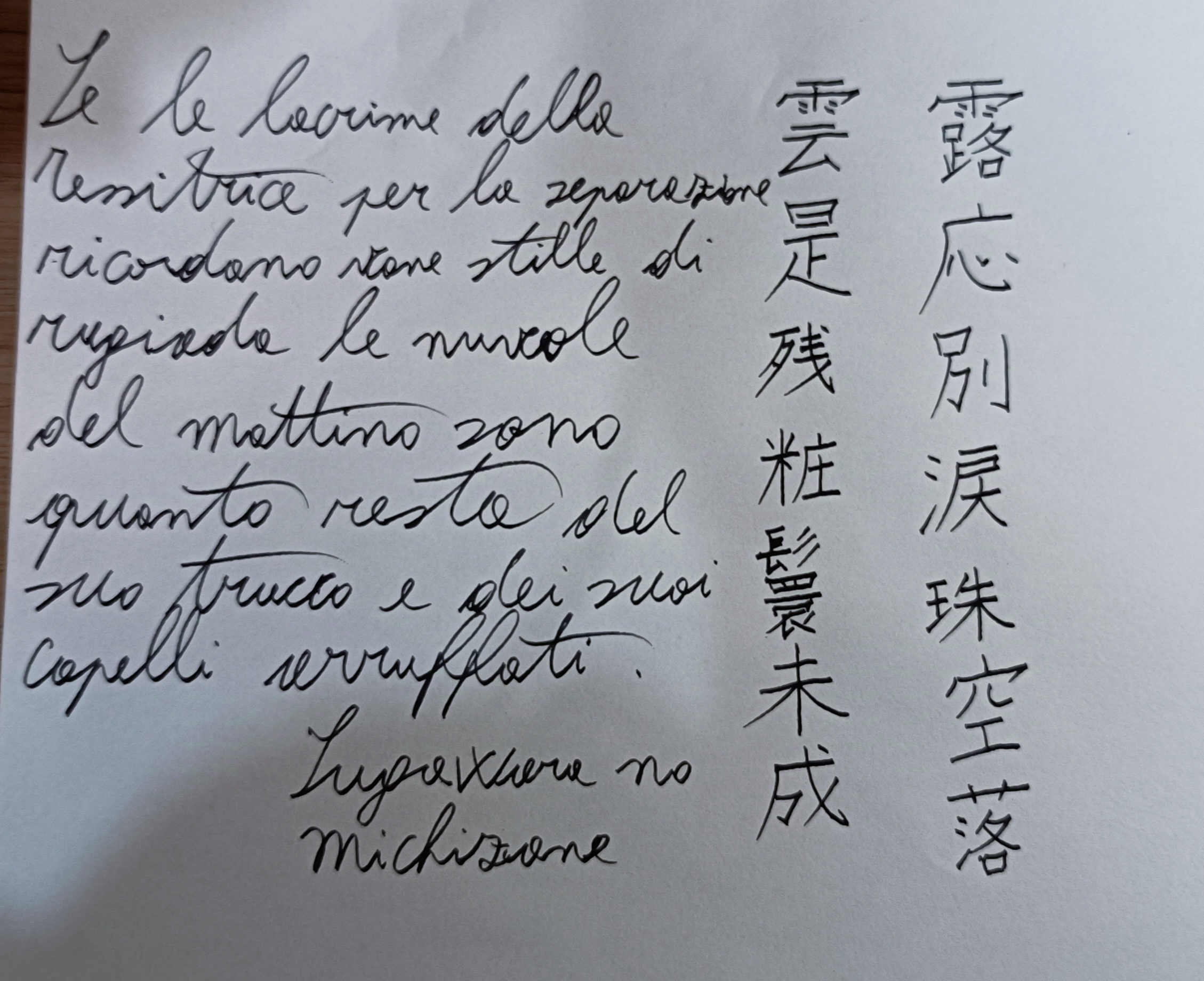 Per quanto riguarda la scrittura, ho già spiegato cosa intendono i cinesi con “刃” nella recensione dell’altra Hongdian in mio possesso, la N9 (viewtopic.php?p=417039#p417039), in questo caso però la base non è un M bensì in F, vediamo cosa comporta in termini di scrittura. Si tratta di un pennino con una bella variazione di tipo architect (tratti verticali come un F, tratti orizzontali come un M) e con un gradiente, cioè il tratto diviene più sottile all’aumentare dell’angolo di attacco con la carta (più la penna si tiene in verticale, più il tratto è sottile). Rispetto all’M sulla N9 la differenza di tratto è più marcata e anche a livello di scorrevolezza si nota che il pennino è più “croccante”, mentre l’M non ha praticamente spigoli. Quando mi è arrivato il pennino grattava un po’ da sinistra verso destra, ho verificato con la lente e i rebbi erano leggermente disallineati, niente di catastrofico, successo pure con penne molto più importanti e risolto sempre solo con le dita. Si tratta di un pennino veramente piacevole e divertente da usare, credo che i caratteri vengano ancora meglio che con il 刃 M della N9. Vi lascio una prova di scrittura con una poesia in cinese classico di Sugawara no Michizane.