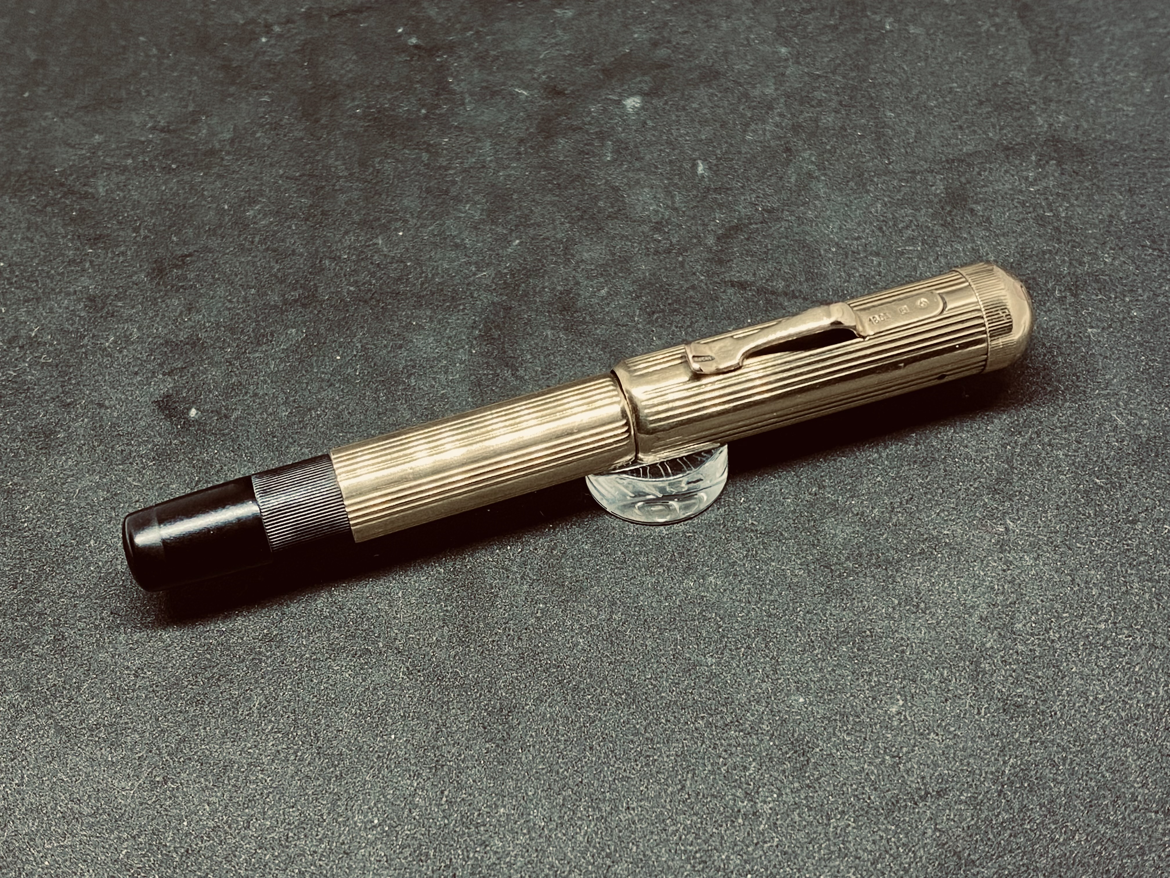 Che sia in oro massiccio lo si capisce dalla incisione sulla sommità della clip: 18ct con dei piccoli simboli che indicano il produttore del rivestimento. Tanto bastava all’epoca per indicare che l’intera penna era rivestita in oro massiccio. Purtroppo non sono riuscito a identificare il significato dei simboli, se qualcuno (Esmeeeee) riesce a fare luce gliene sarei grato.