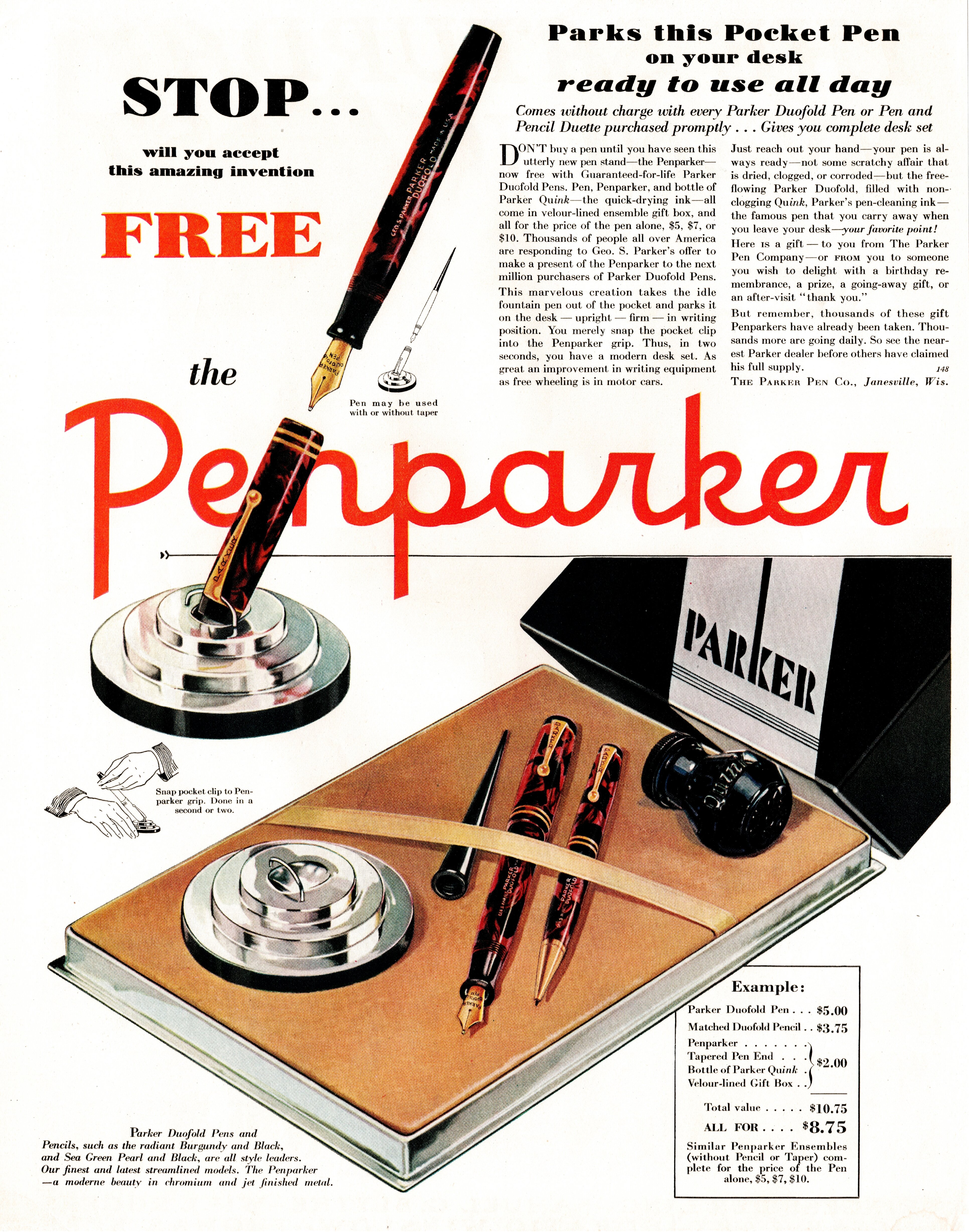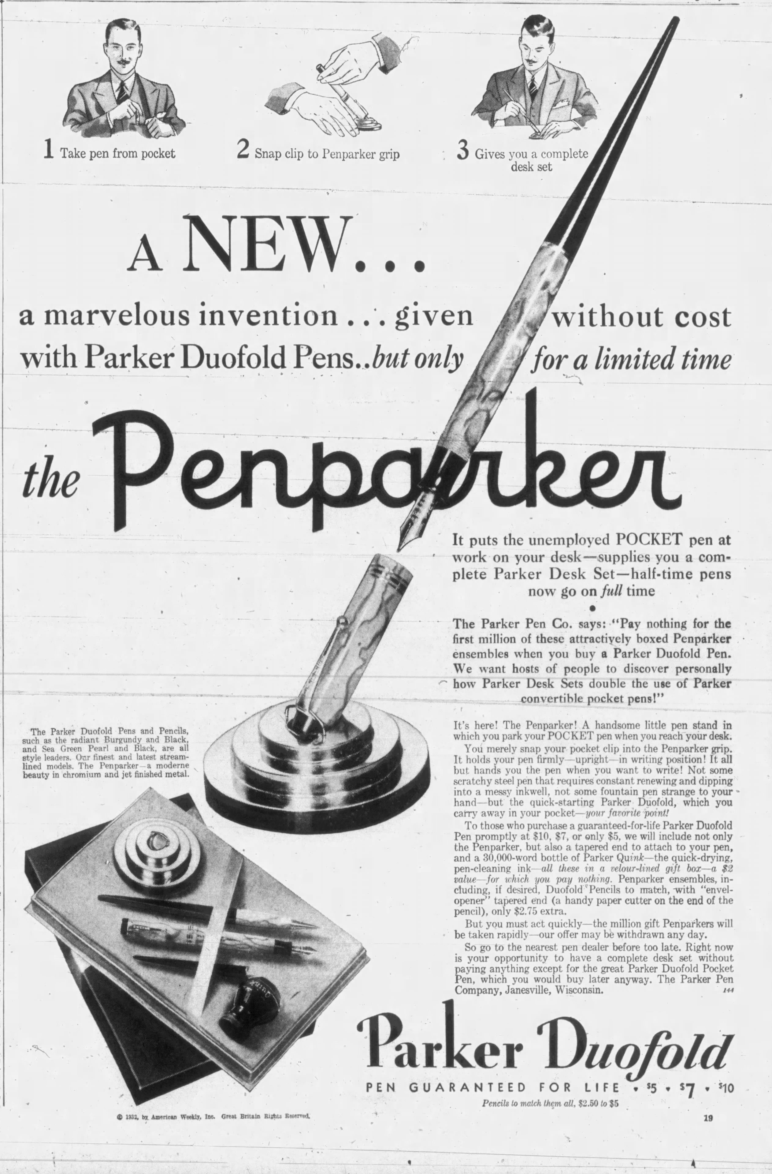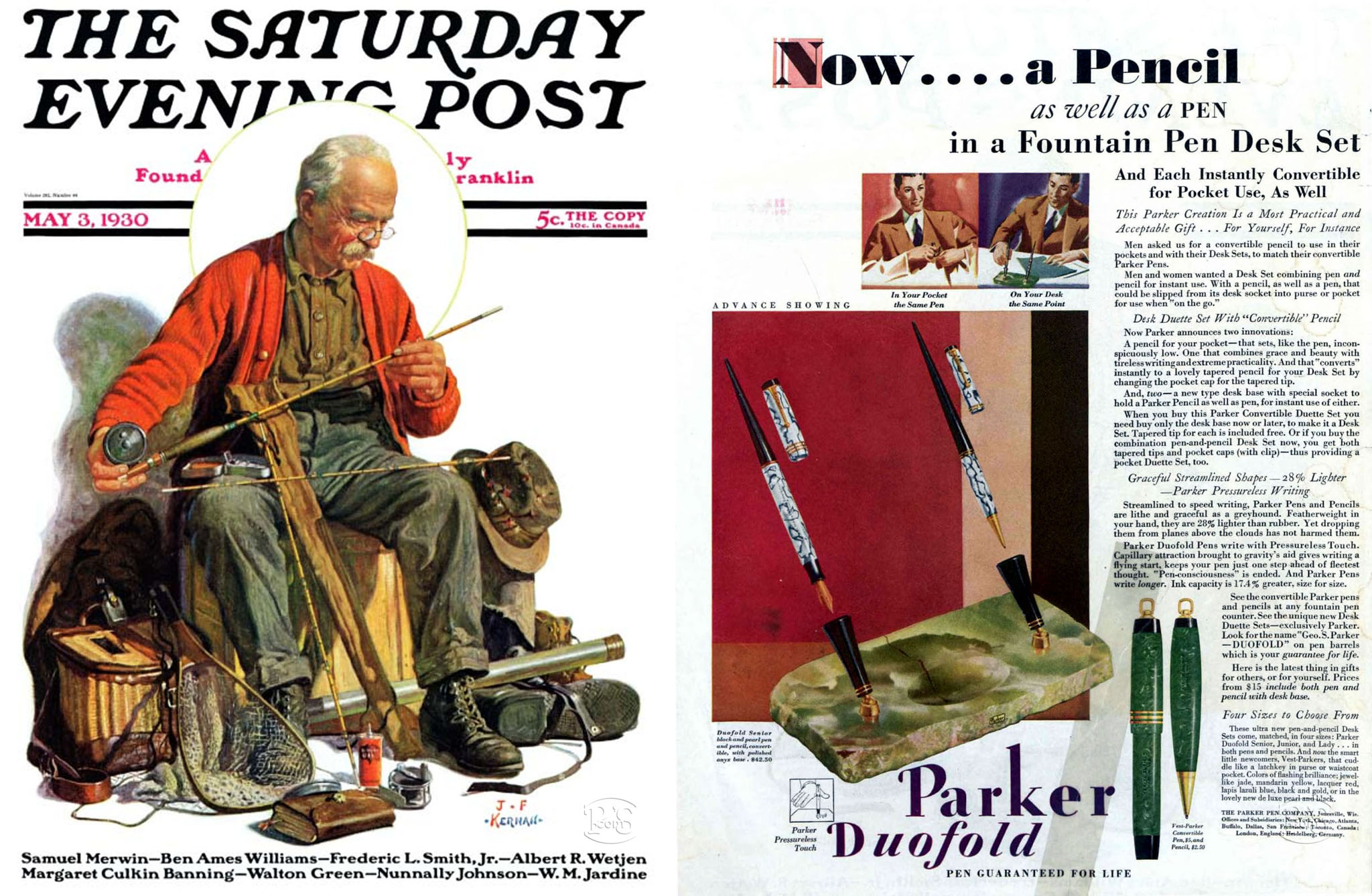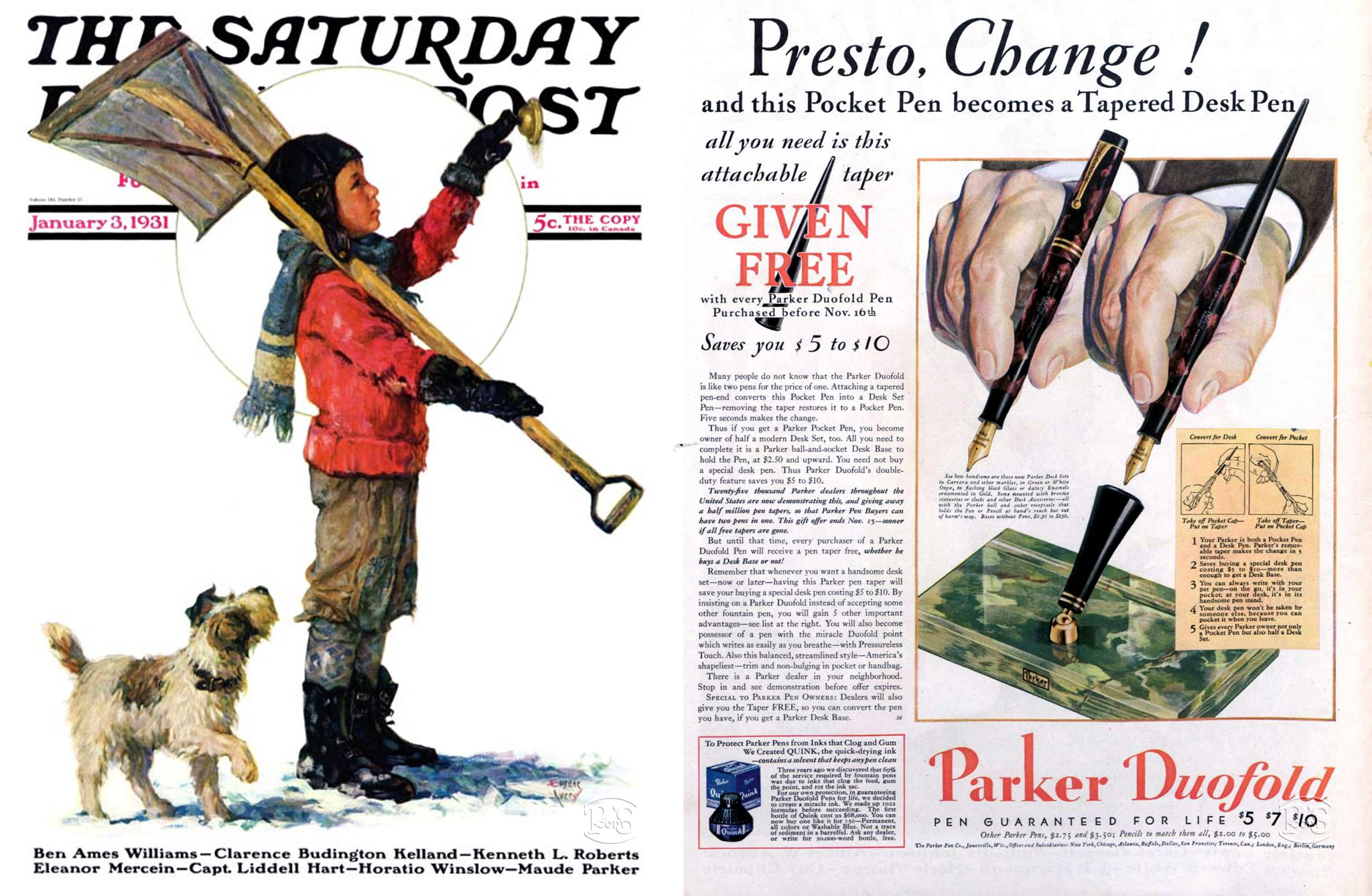 Sulle riviste a diffusione nazionale la prima apparizione da me rinvenuta è di due settimane dopo, sul Saturday Evening Post del 20 febbraio 1932, ma è in bianco e nero e corrisponde alla pubblicità della stampa quotidiana che allegherò più sotto; personalmente, ho voluto acquistare dagli USA una pubblicità originale a colori del Penparker in cui comparisse anche la penna con cui lo presento, e volentieri conferisco il mio primo contributo odierno al Wiki: