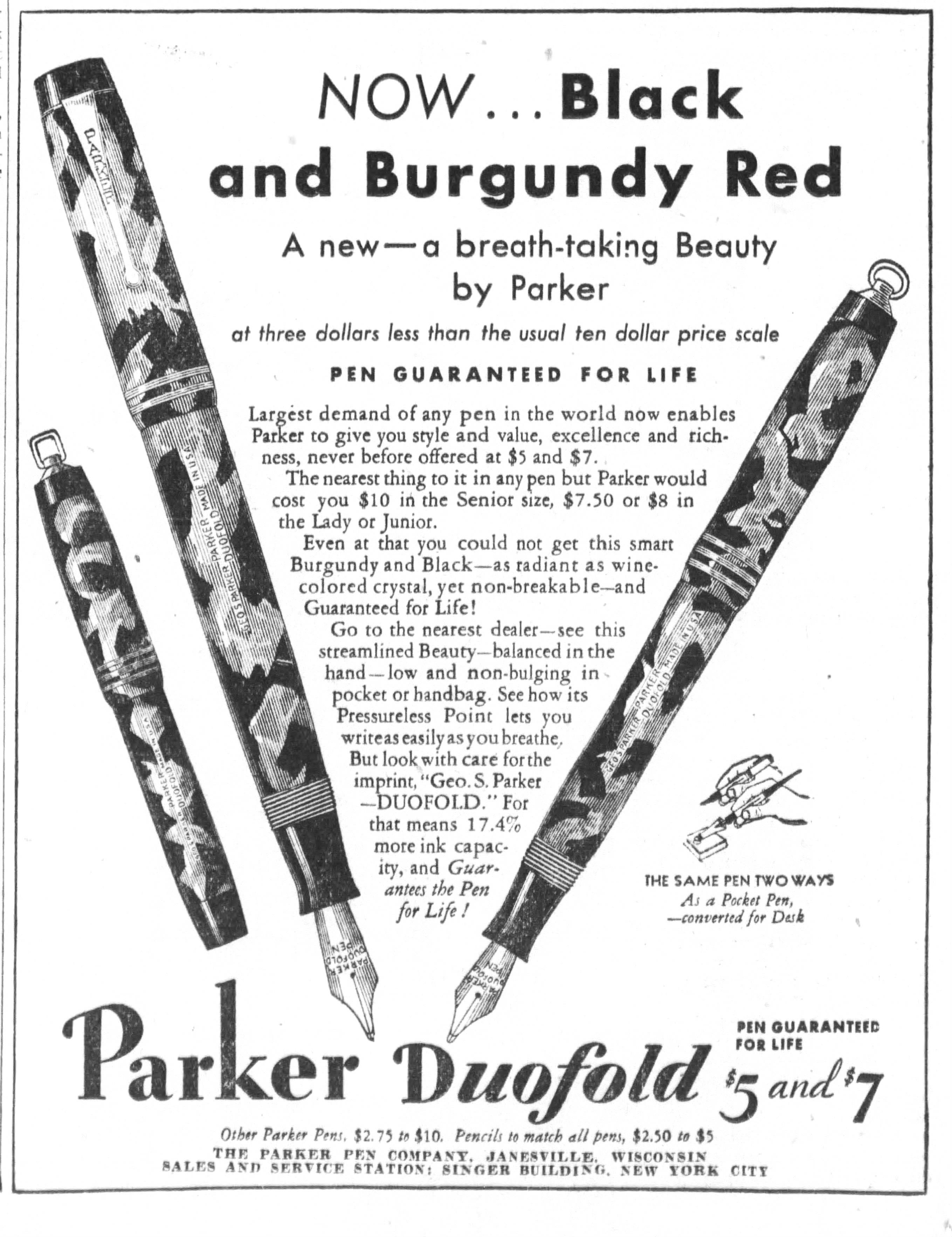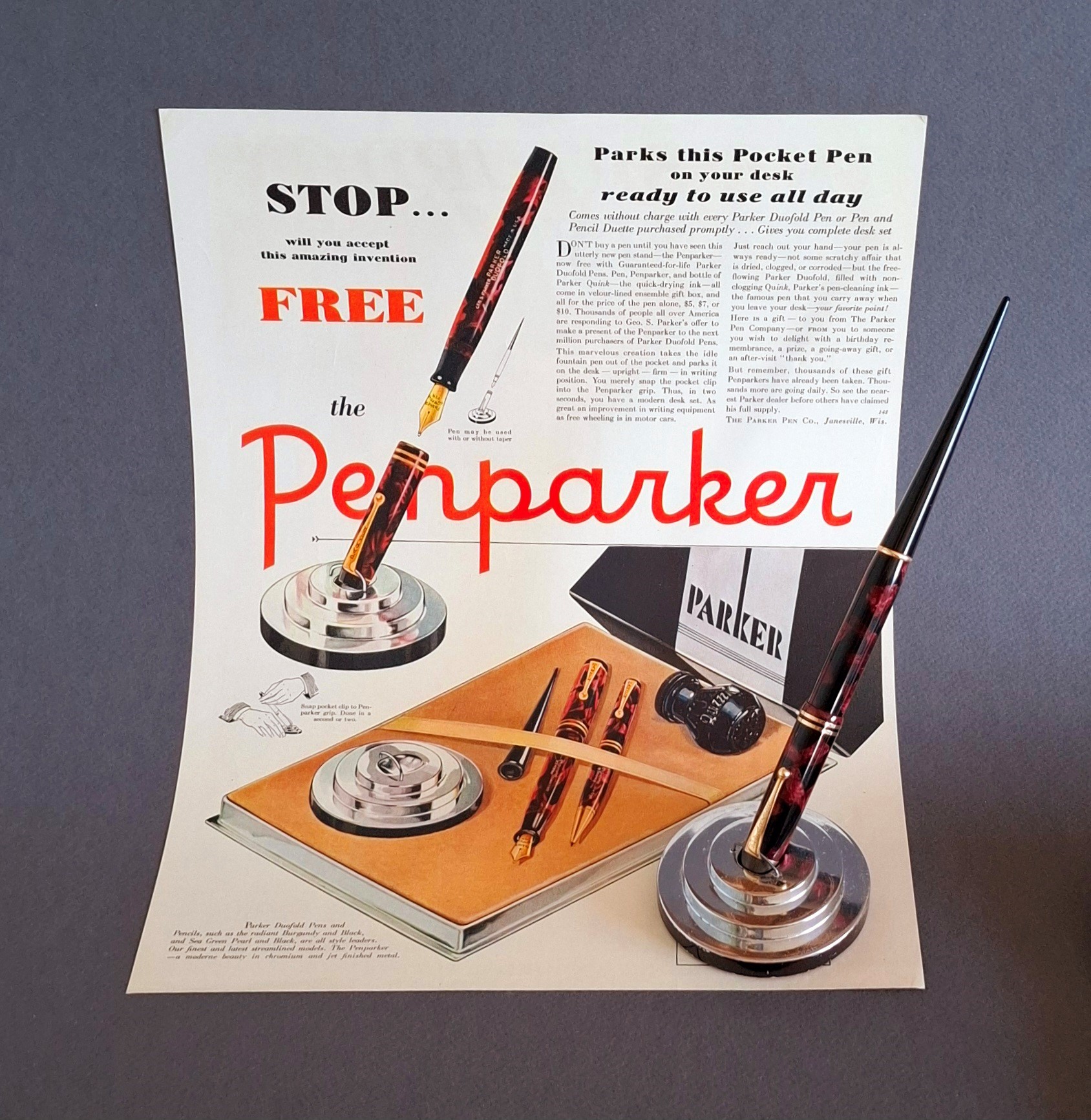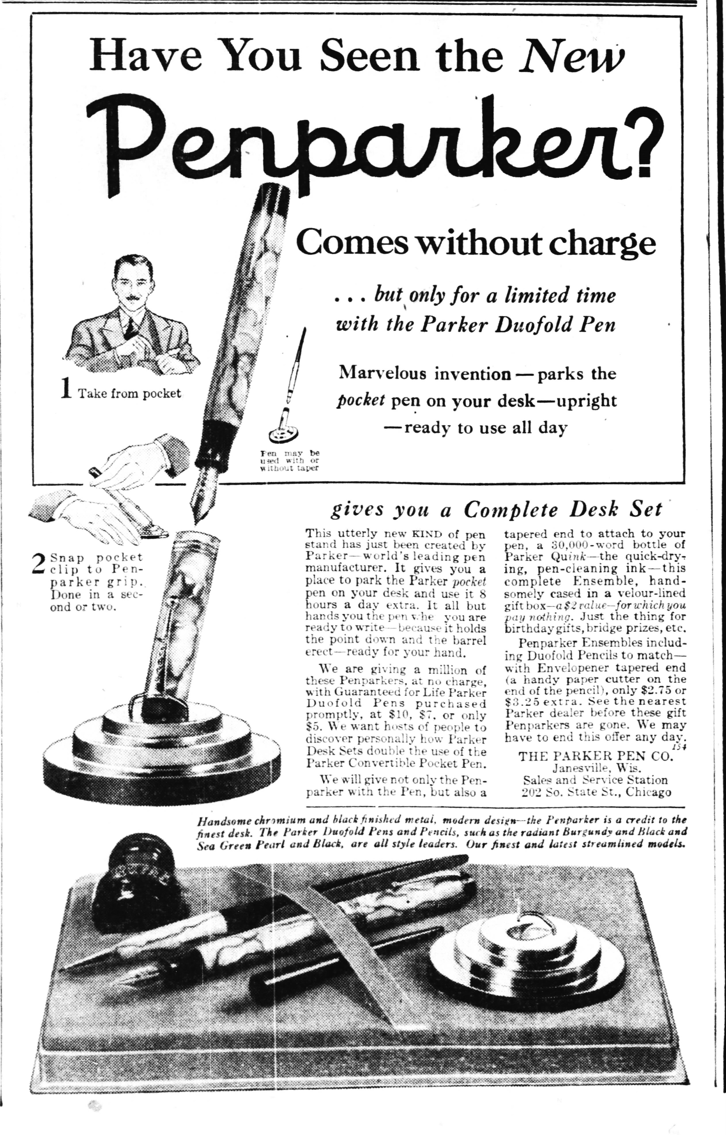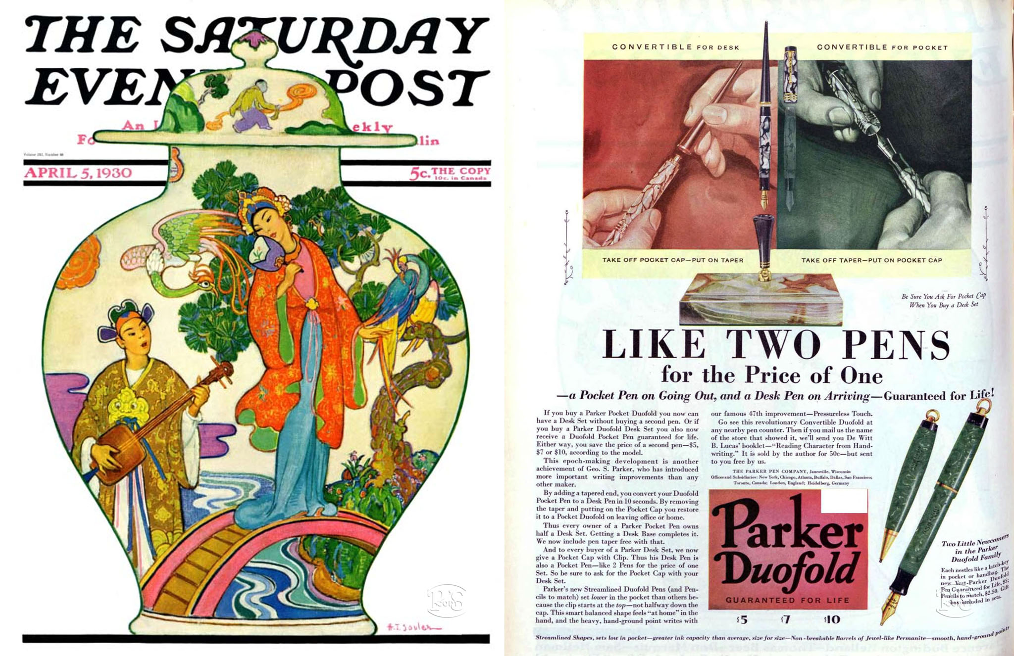 Sulle riviste a diffusione nazionale la prima apparizione da me rinvenuta è di due settimane dopo, sul Saturday Evening Post del 20 febbraio 1932, ma è in bianco e nero e corrisponde alla pubblicità della stampa quotidiana che allegherò più sotto; personalmente, ho voluto acquistare dagli USA una pubblicità originale a colori del Penparker in cui comparisse anche la penna con cui lo presento, e volentieri conferisco il mio primo contributo odierno al Wiki: