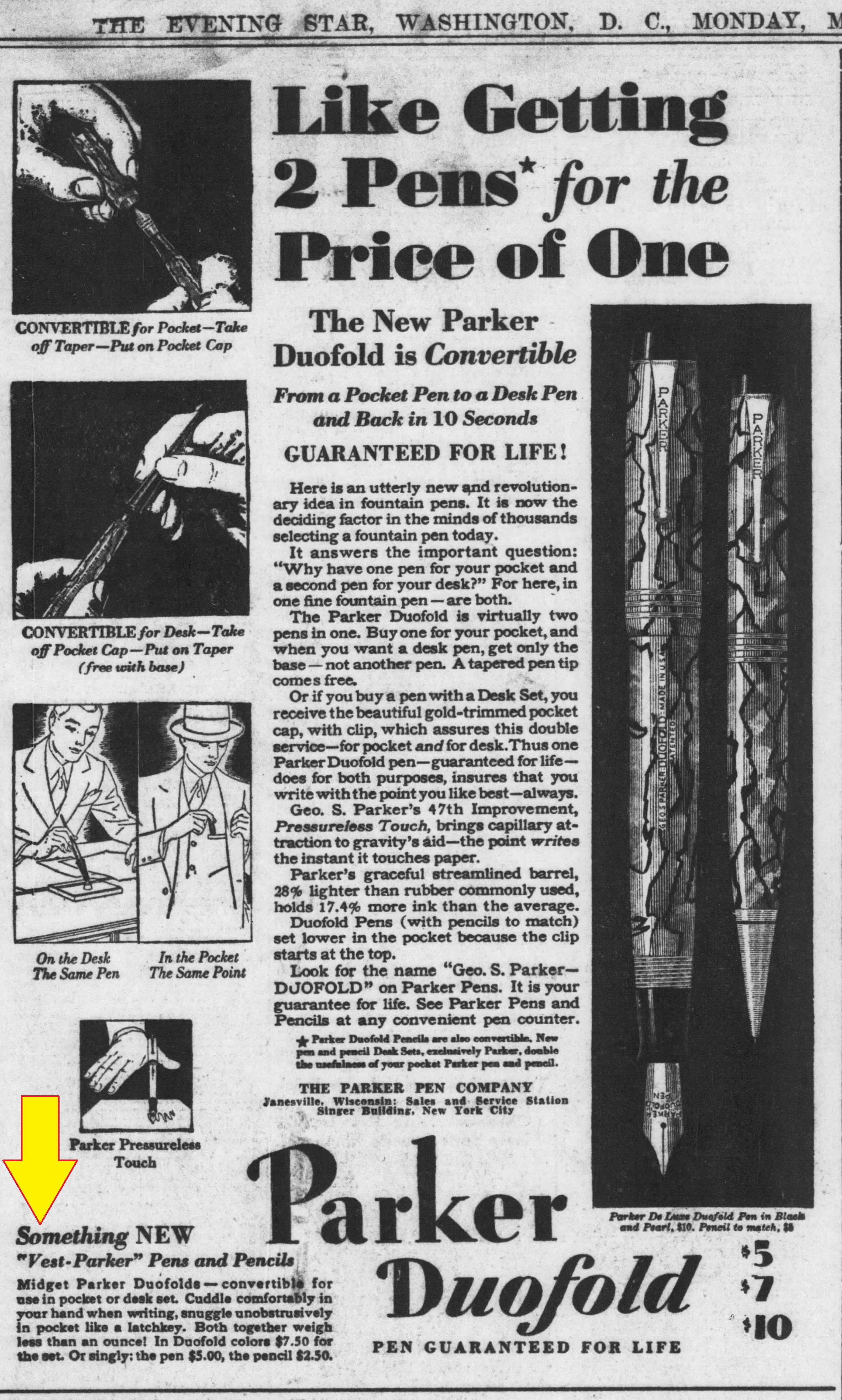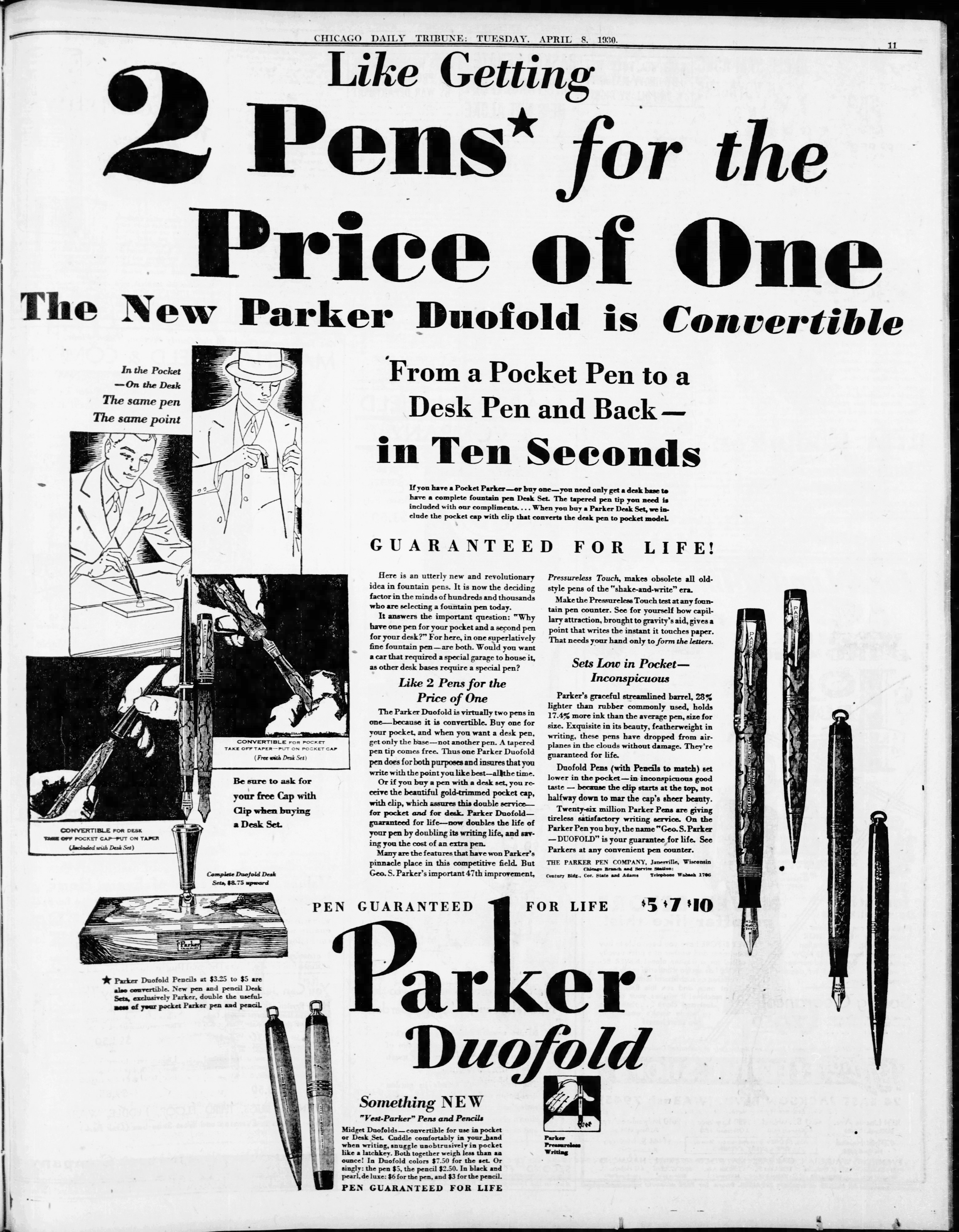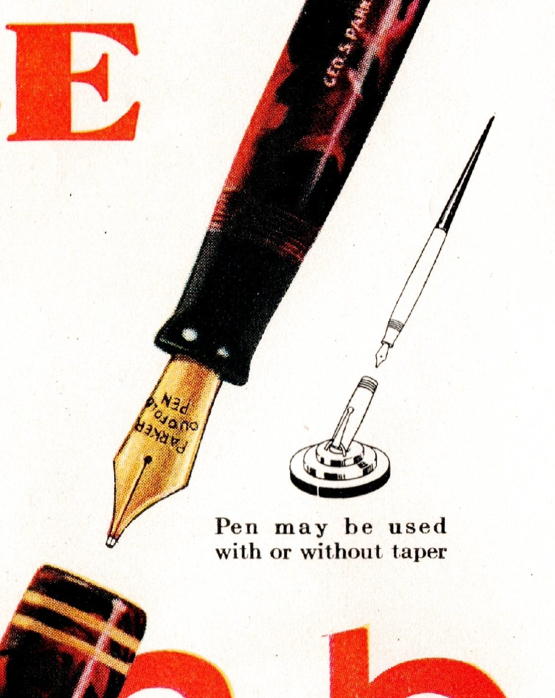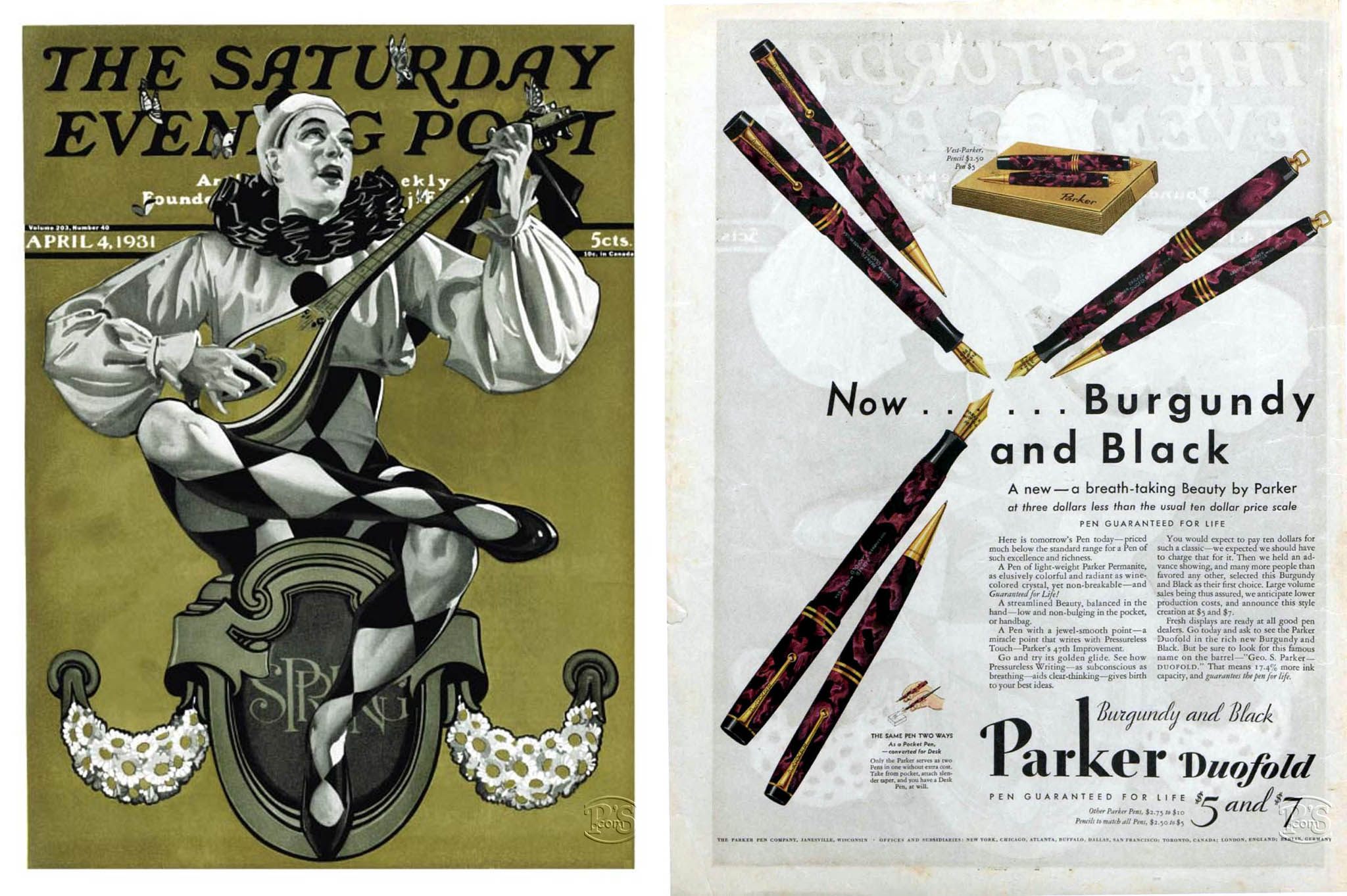 Sulle riviste a diffusione nazionale la prima apparizione da me rinvenuta è di due settimane dopo, sul Saturday Evening Post del 20 febbraio 1932, ma è in bianco e nero e corrisponde alla pubblicità della stampa quotidiana che allegherò più sotto; personalmente, ho voluto acquistare dagli USA una pubblicità originale a colori del Penparker in cui comparisse anche la penna con cui lo presento, e volentieri conferisco il mio primo contributo odierno al Wiki: