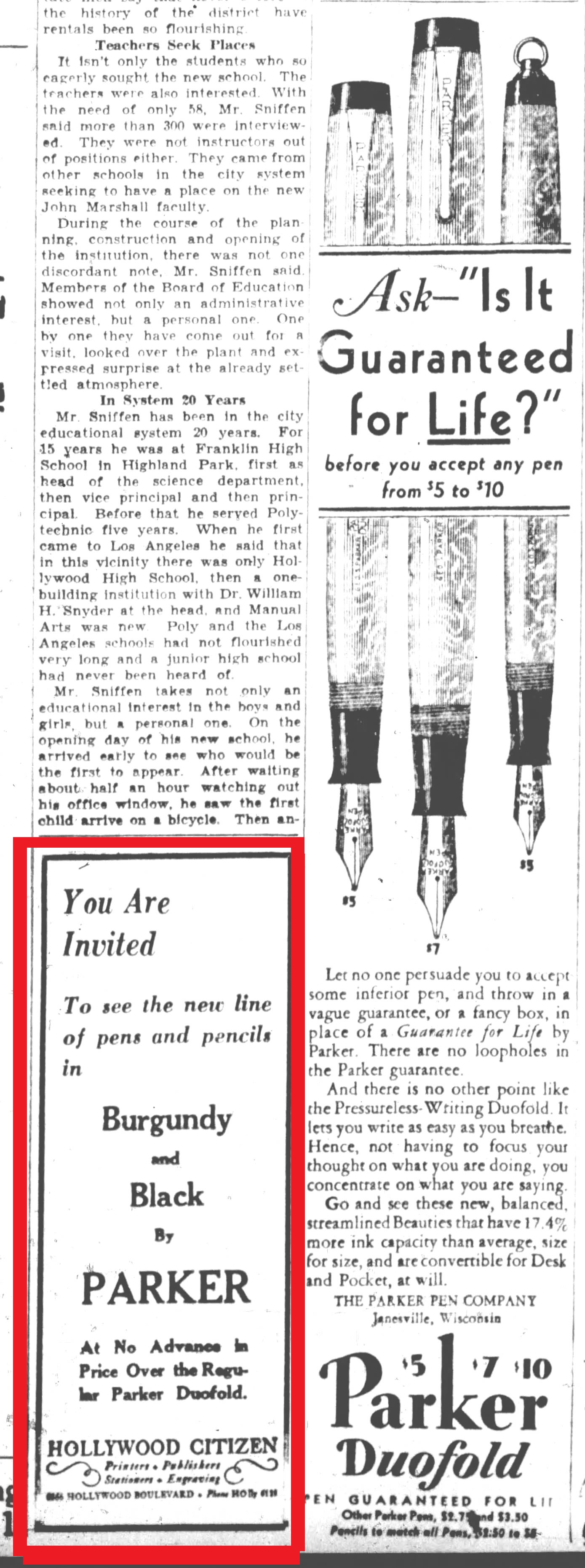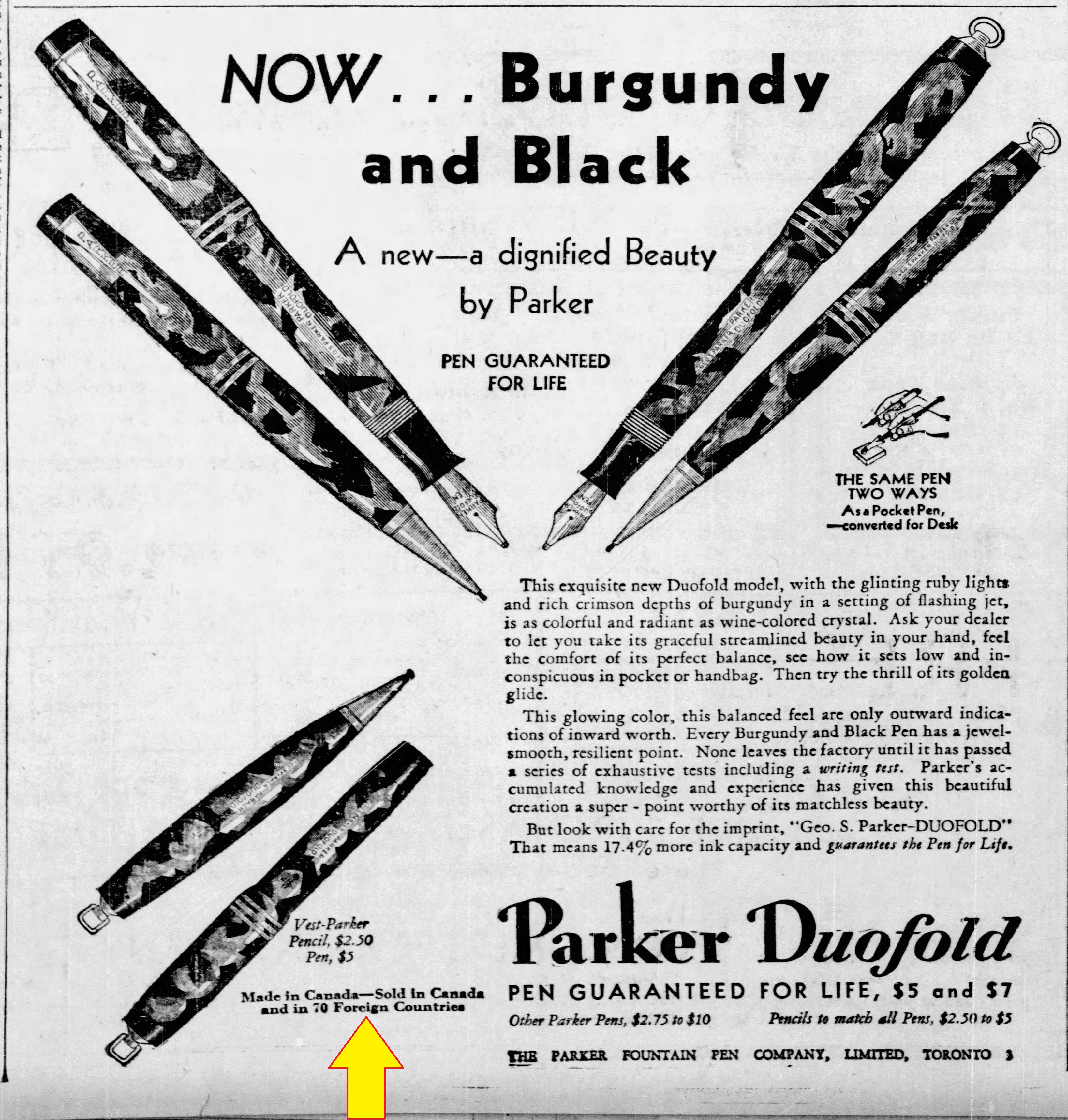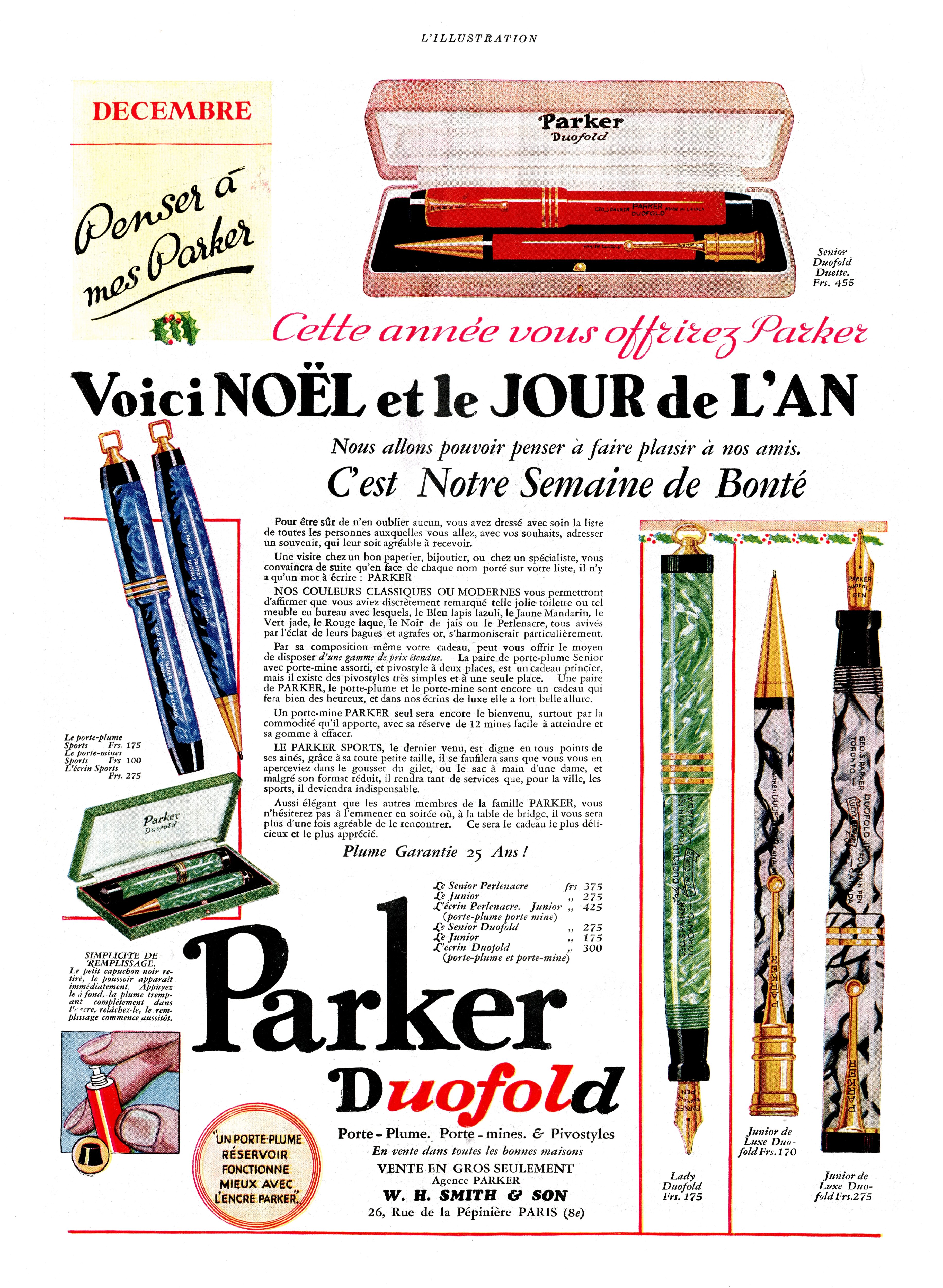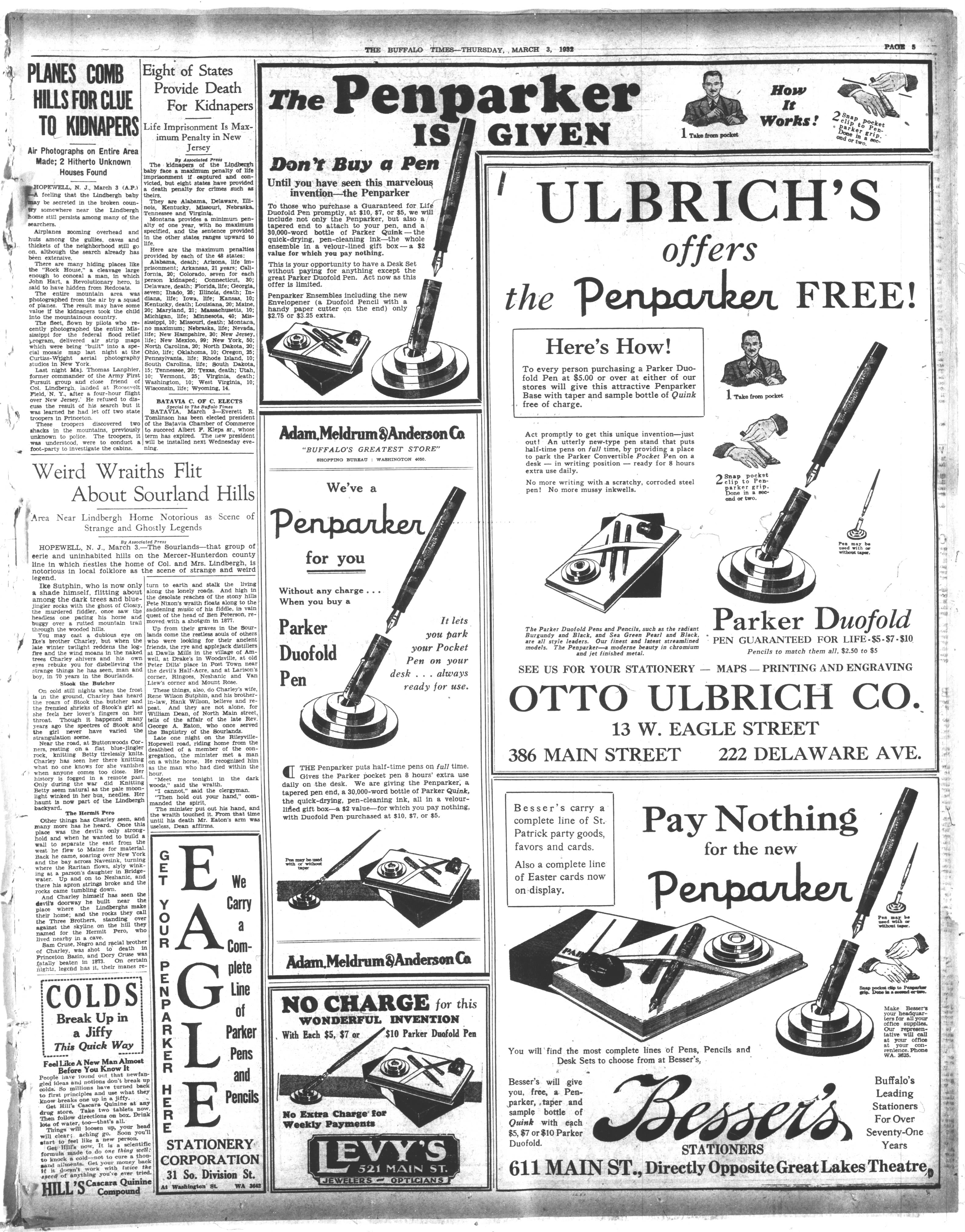 Sulle riviste a diffusione nazionale la prima apparizione da me rinvenuta è di due settimane dopo, sul Saturday Evening Post del 20 febbraio 1932, ma è in bianco e nero e corrisponde alla pubblicità della stampa quotidiana che allegherò più sotto; personalmente, ho voluto acquistare dagli USA una pubblicità originale a colori del Penparker in cui comparisse anche la penna con cui lo presento, e volentieri conferisco il mio primo contributo odierno al Wiki: