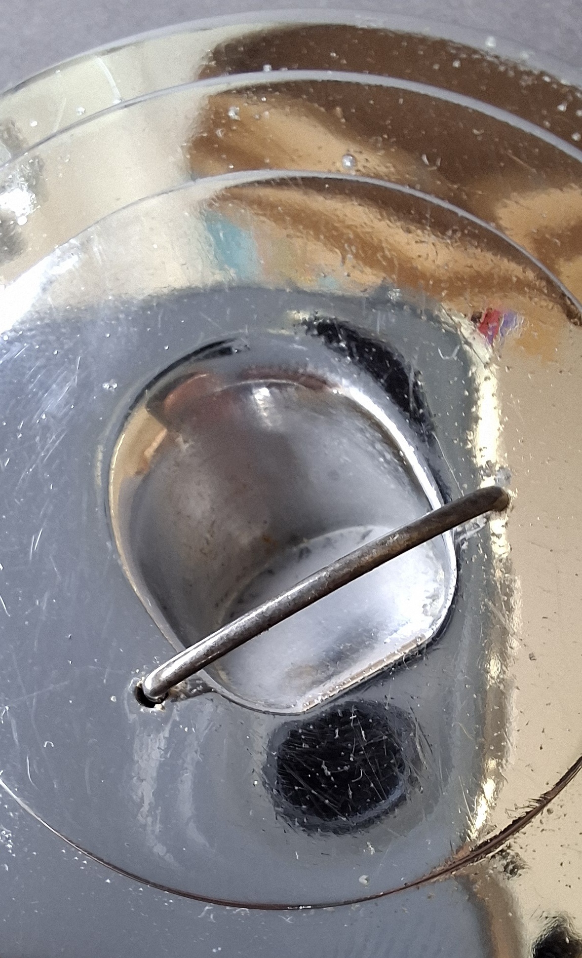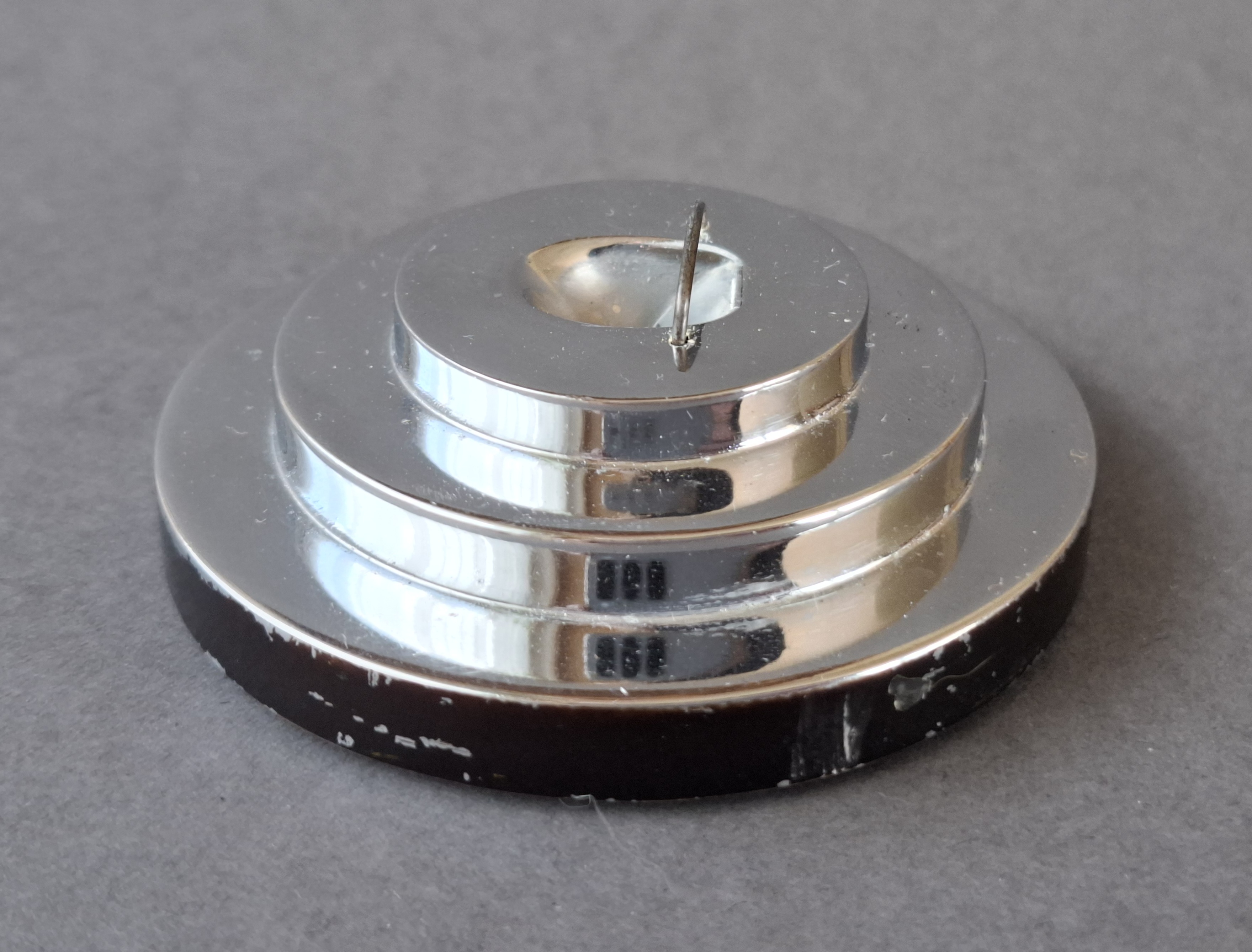 Definito in una Ad «a moderne beauty in chromium and jet finished metal» (feb. 20, 1932), mostra una superficie cromata (una cromatura, senza dubbio, di qualità) con l’eccezione del disco che funge da base, che è invece verniciato di nero a contrasto (direttamente sulla cromatura): sul mio esemplare la vernice nera non si è rivelata altrettanto efficace nel resistere alle ingiurie del tempo.