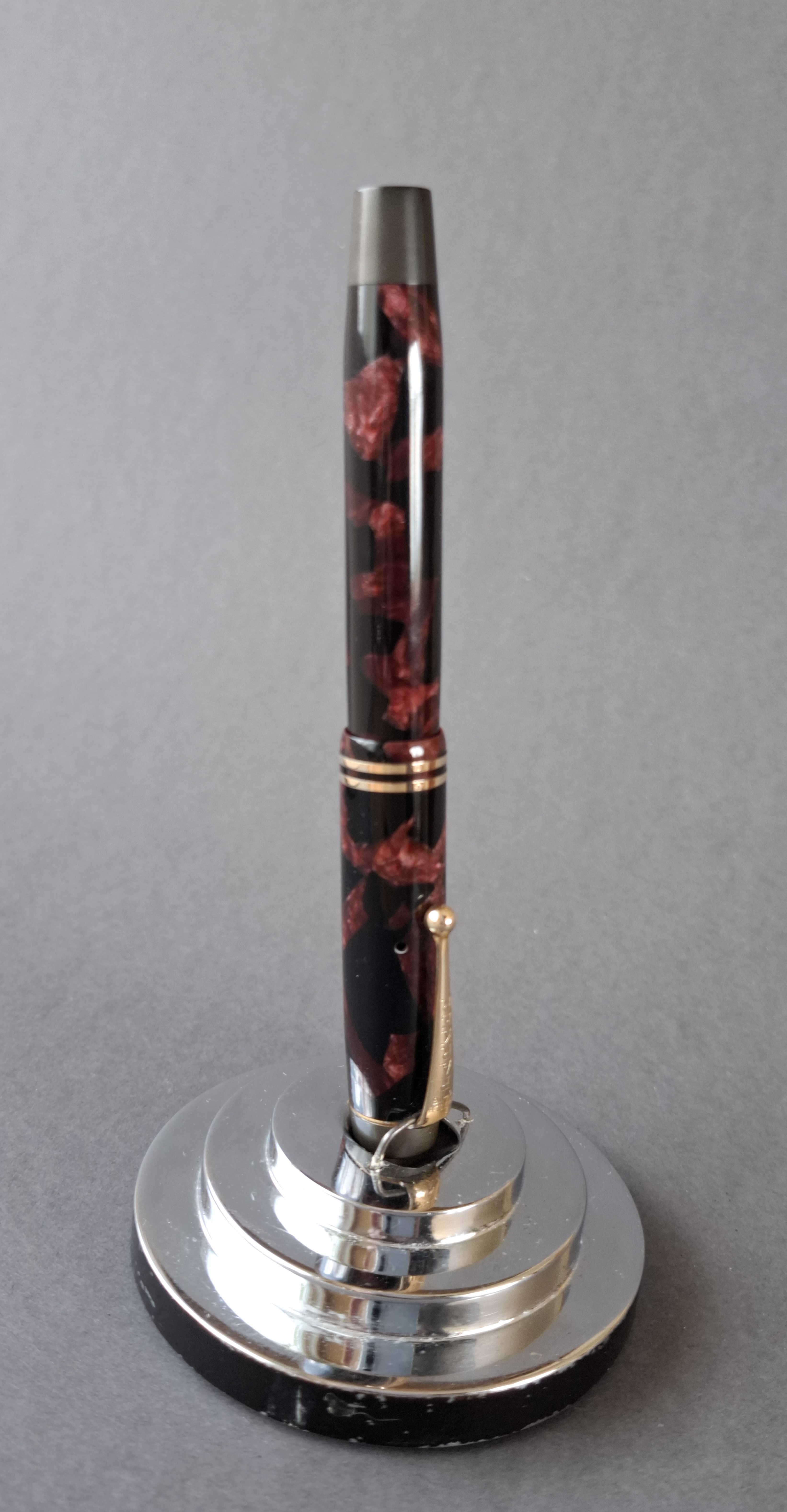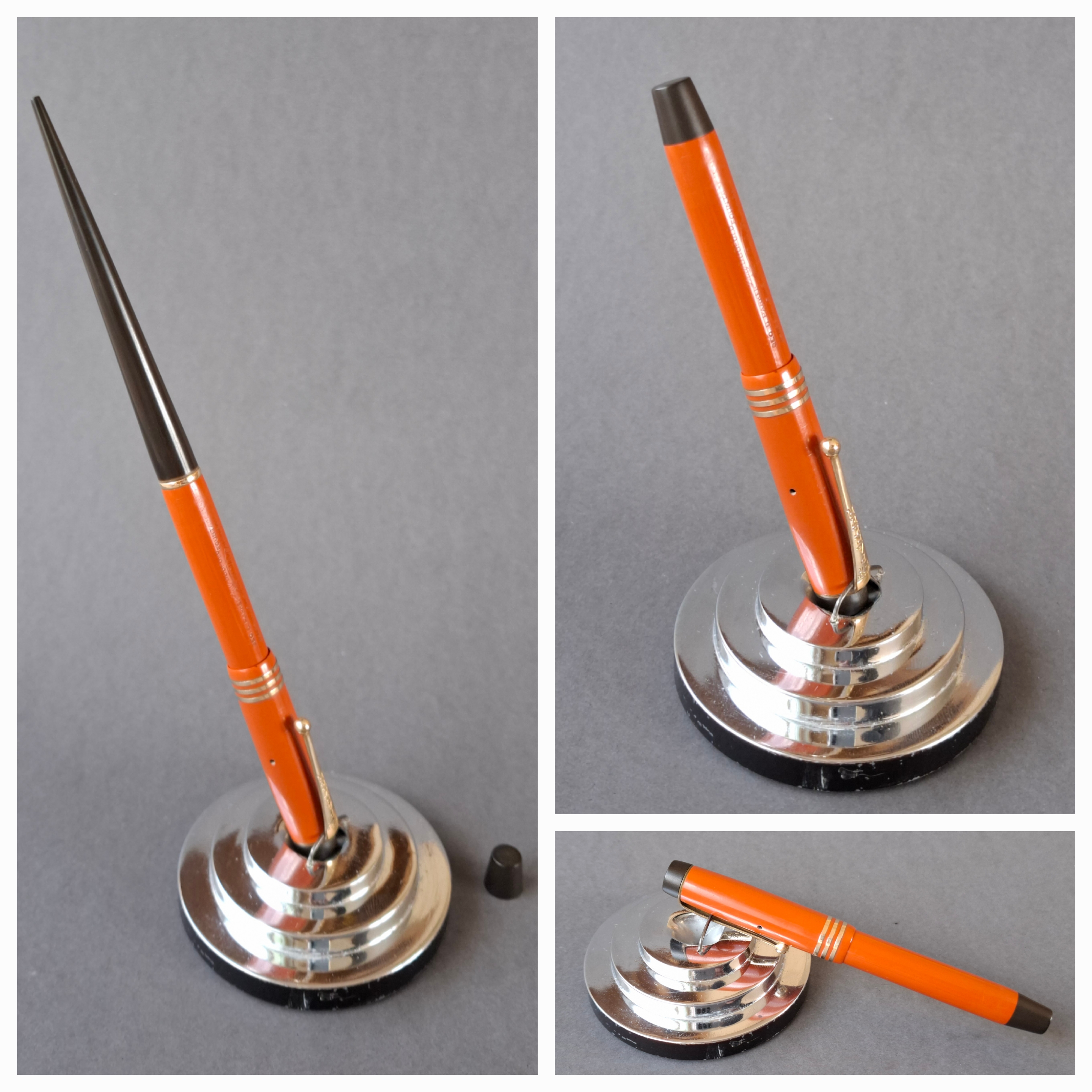 Il Penparker è in buona sostanza una lucente “base da tavolo” in stile Déco caratterizzata da tre dischi concentrici, impilati uno sull’altro con diametri decrescenti (di ca. 0,5 cm).