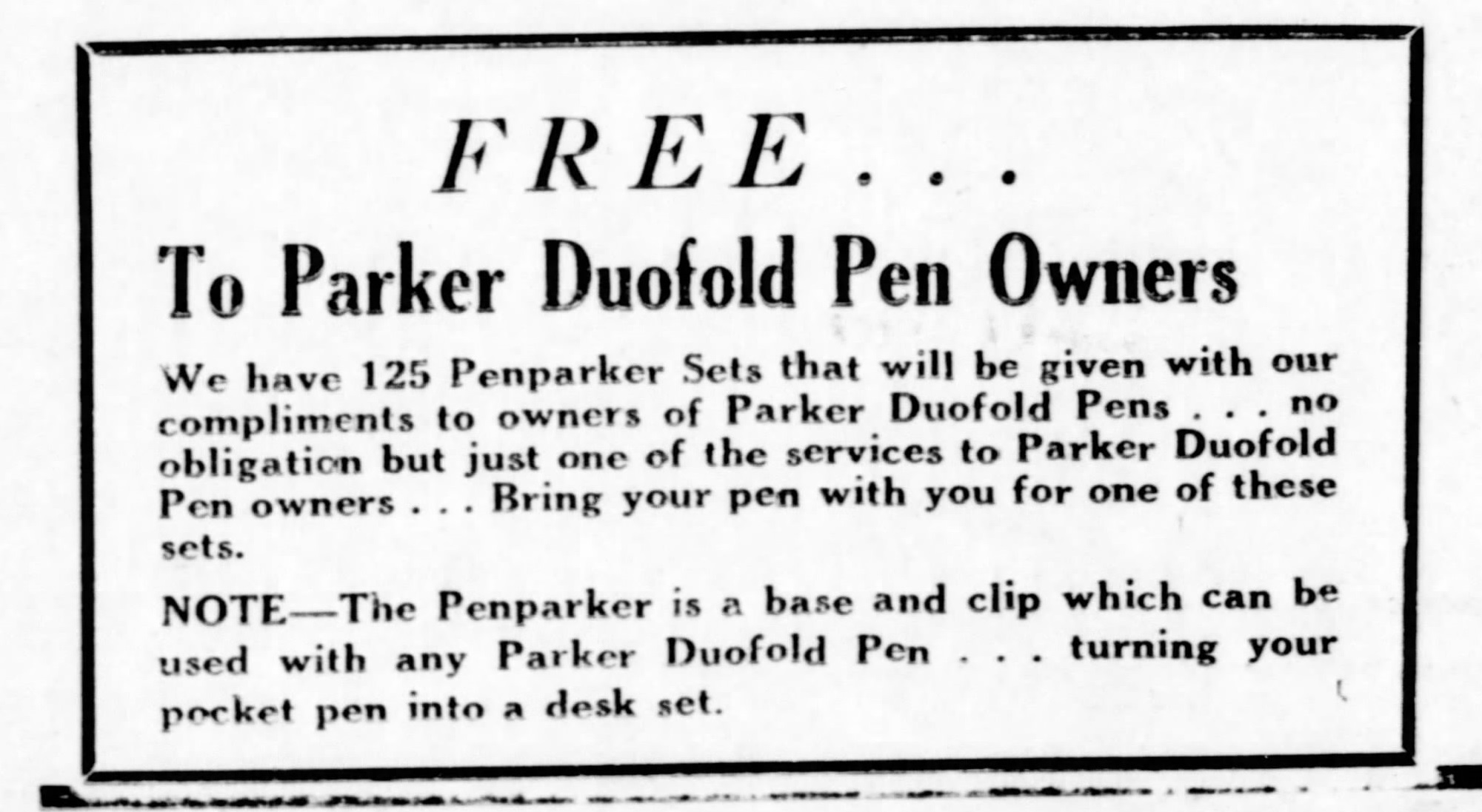 Nonostante fossero previsti ben tre calici diversi, dedicati ad accogliere le tre misure storiche delle Duofold, ovvero Senior, Junior e Lady (e che quest’ultimo possa essere usato anche per le Pastel e per le desk-pen solo nere “entry level”), e che anche i corrispondenti tre codali avvitabili (per trasformare le penne da “pocket” a “desk” pens) fossero adatti ciascuno ad una sola taglia, personalmente non ho letto in alcuna pubblicità che esistessero anche 3 misure di Penparker… Anzi, in questa Ad dell’anno seguente alla distribuzione (1933), in cui si cercava di sbolognare le centinaia di esemplari invenduti (o, meglio, nemmeno accettati in regalo), mi sembrerebbe di capire che i Penparker fossero stati sempre proposti in misura/taglia unica.