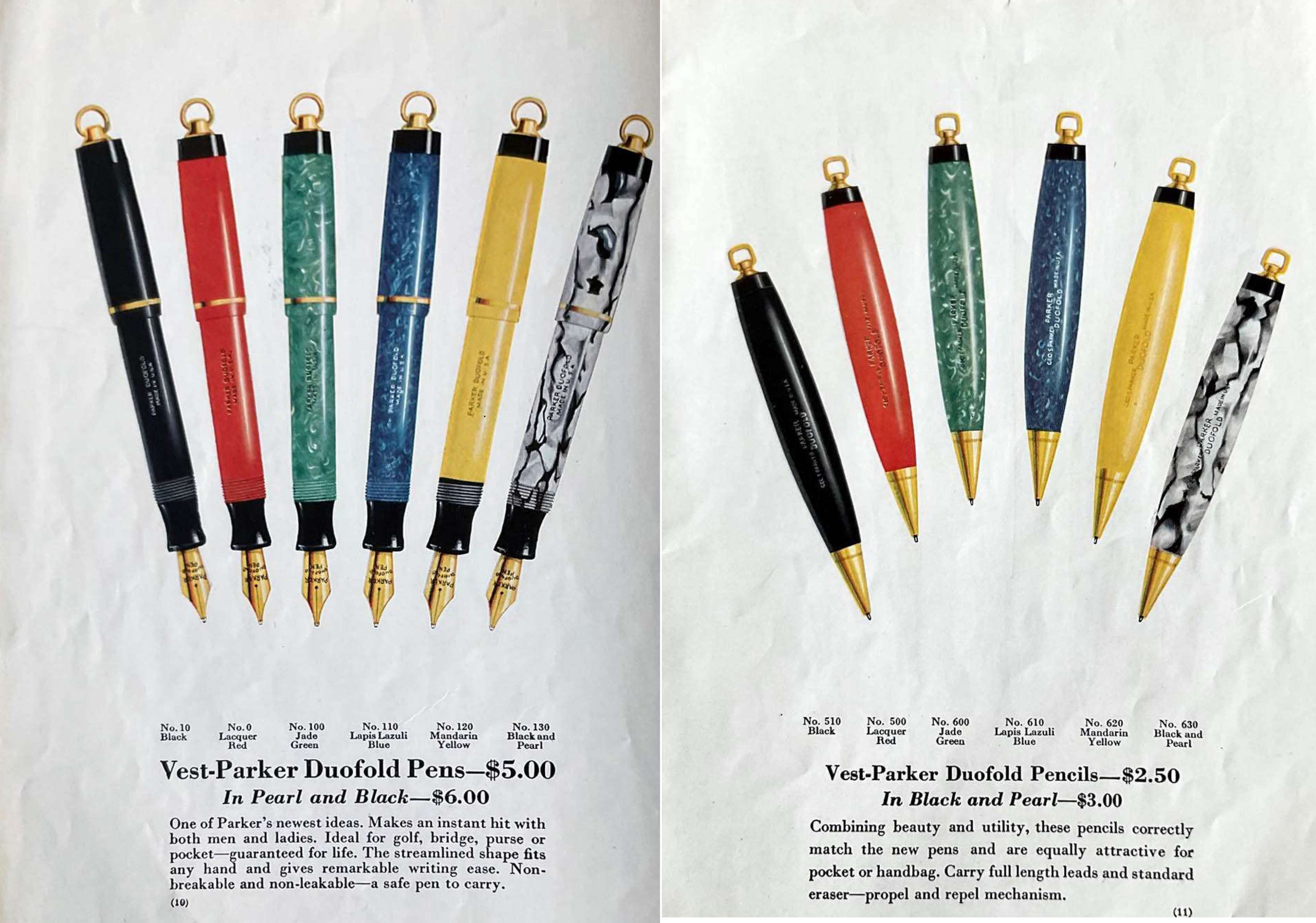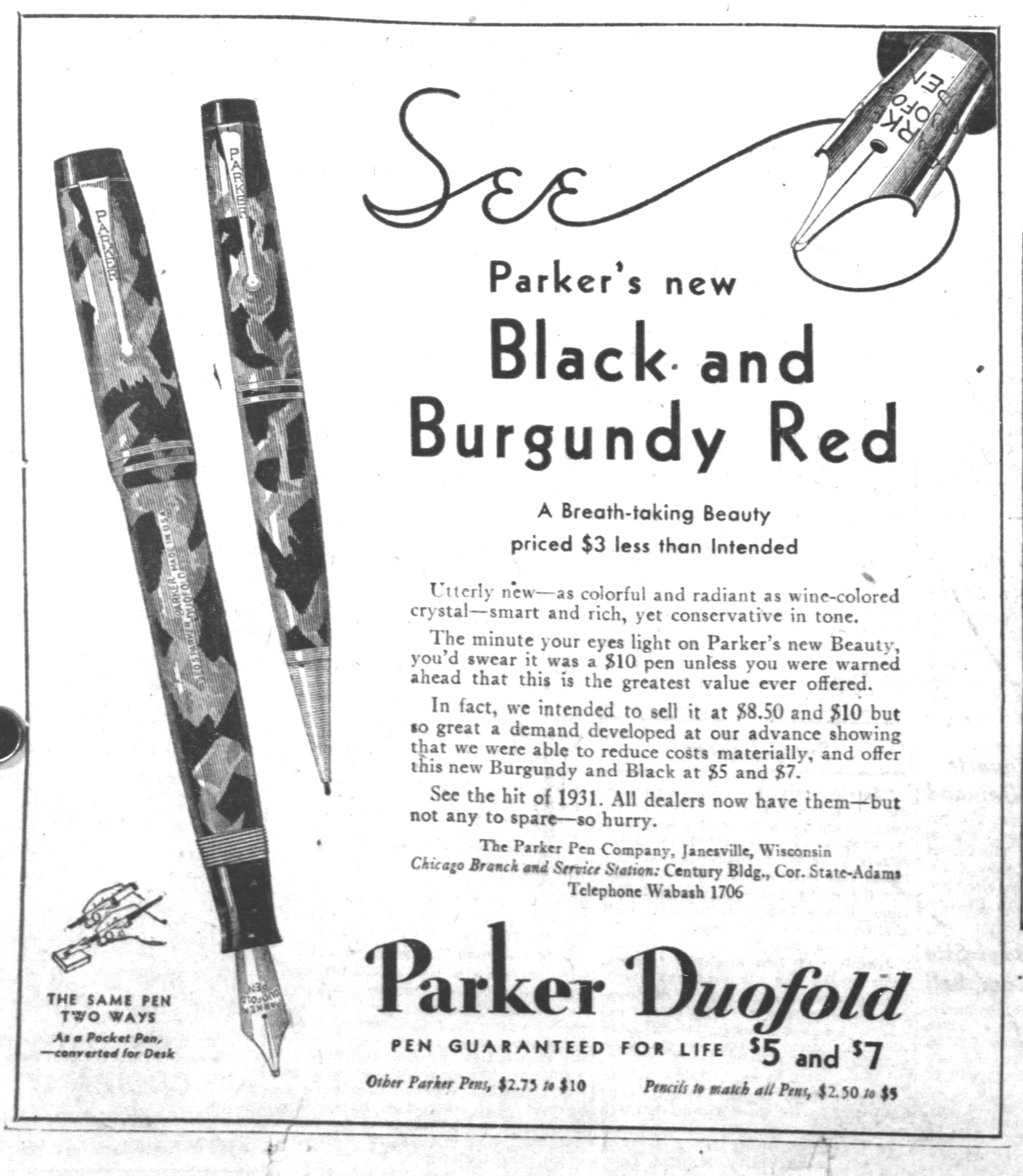 Nel citato sito parkersheaffer.com, l’ottimo Dan Zazove firma un articolo che introduce dal punto di vista storico il «Penparker» (https://parkersheaffer.com/penparker-a- ... desk-base/) ricordando come proprio nel 1932, al culmine degli effetti negativi della Grande Depressione, la Parker avrebbe visto il proprio fatturato ridursi ad un terzo rispetto a quello degli anni precedenti (!), e che avrebbe patito per la prima volta nella sua quarantennale storia il primo esercizio in perdita… La risposta della dirigenza, in attesa del lancio del nuovo prodotto che avrebbe rivoluzionato il mercato (la prima Vacuum-filler/Vacumatic trasparente è proprio dell’autunno di quell’anno), fu quella di prendere tempo, resistere senza abbassare i prezzi, e cercare di smaltire gli stock di Duofold invenduti, proponendo con campagne pubblicitarie di grande impatto le penne e le matite in abbinamento ad accessori utili ma con bassissimi costi di produzione.