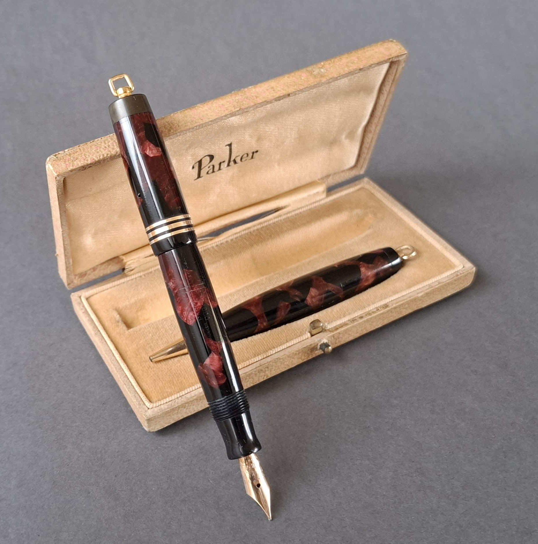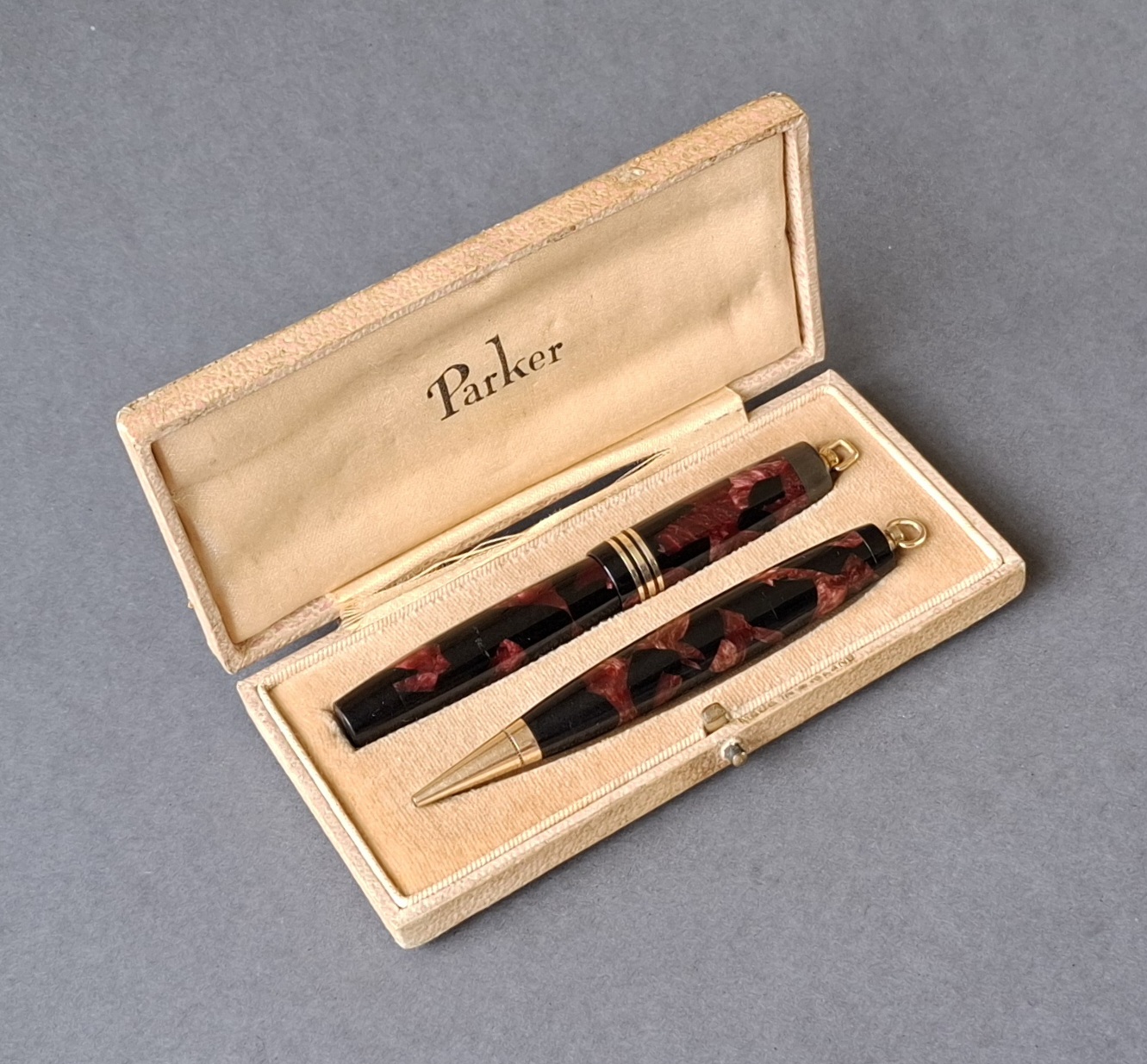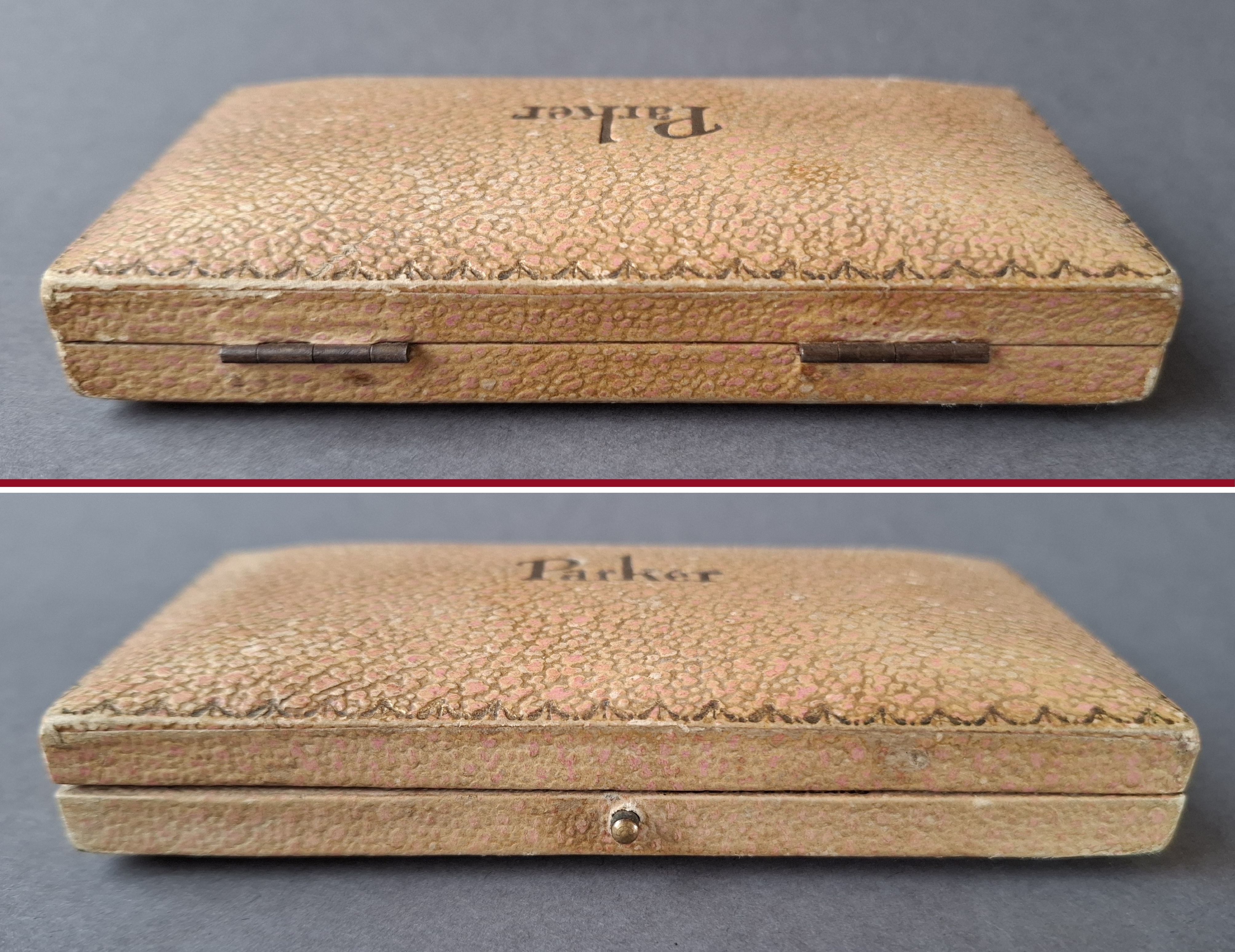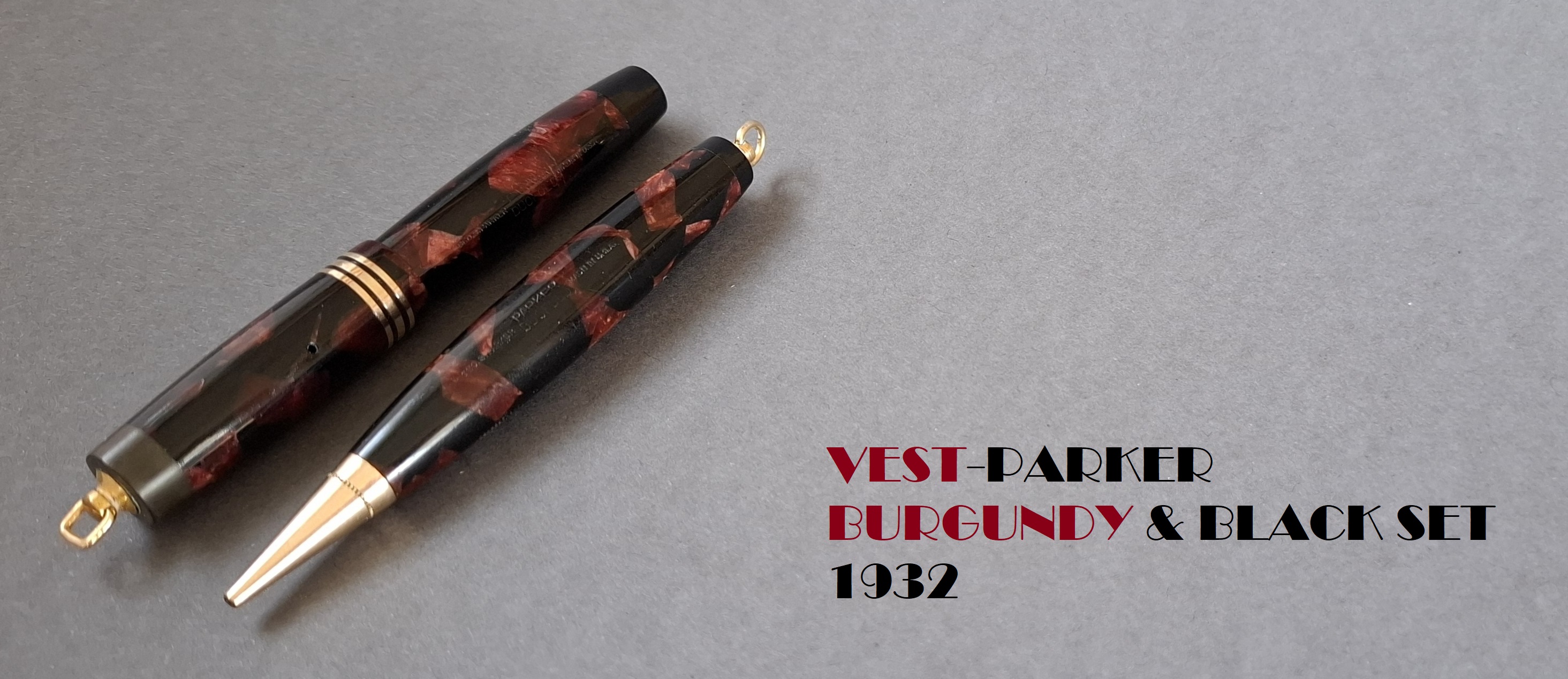 PARKER PENPARKER + ENVELOPENER + BURGUNDY & BLACK VEST-PARKER DUOFOLD SET IN BOX — U.S.A. 1932