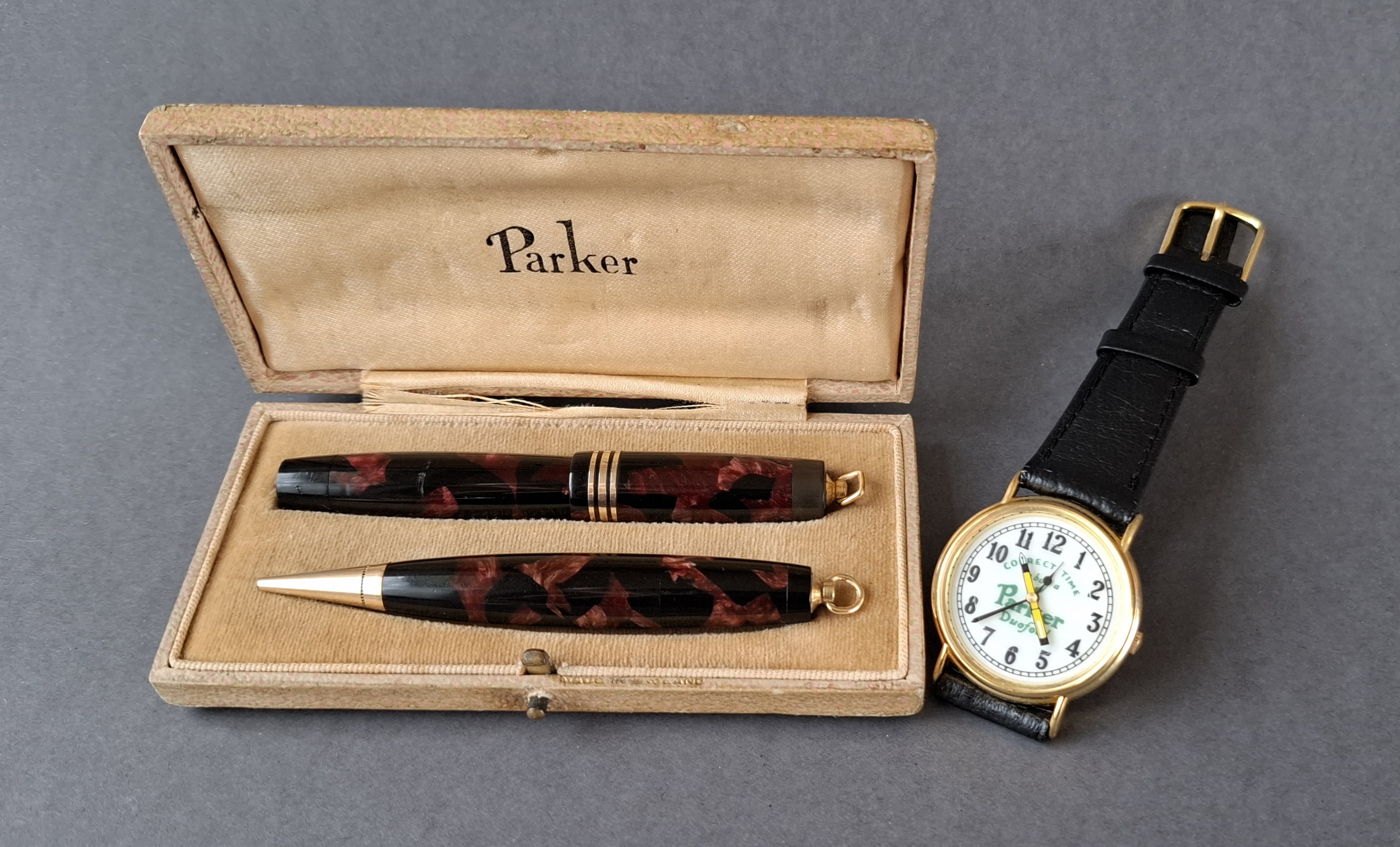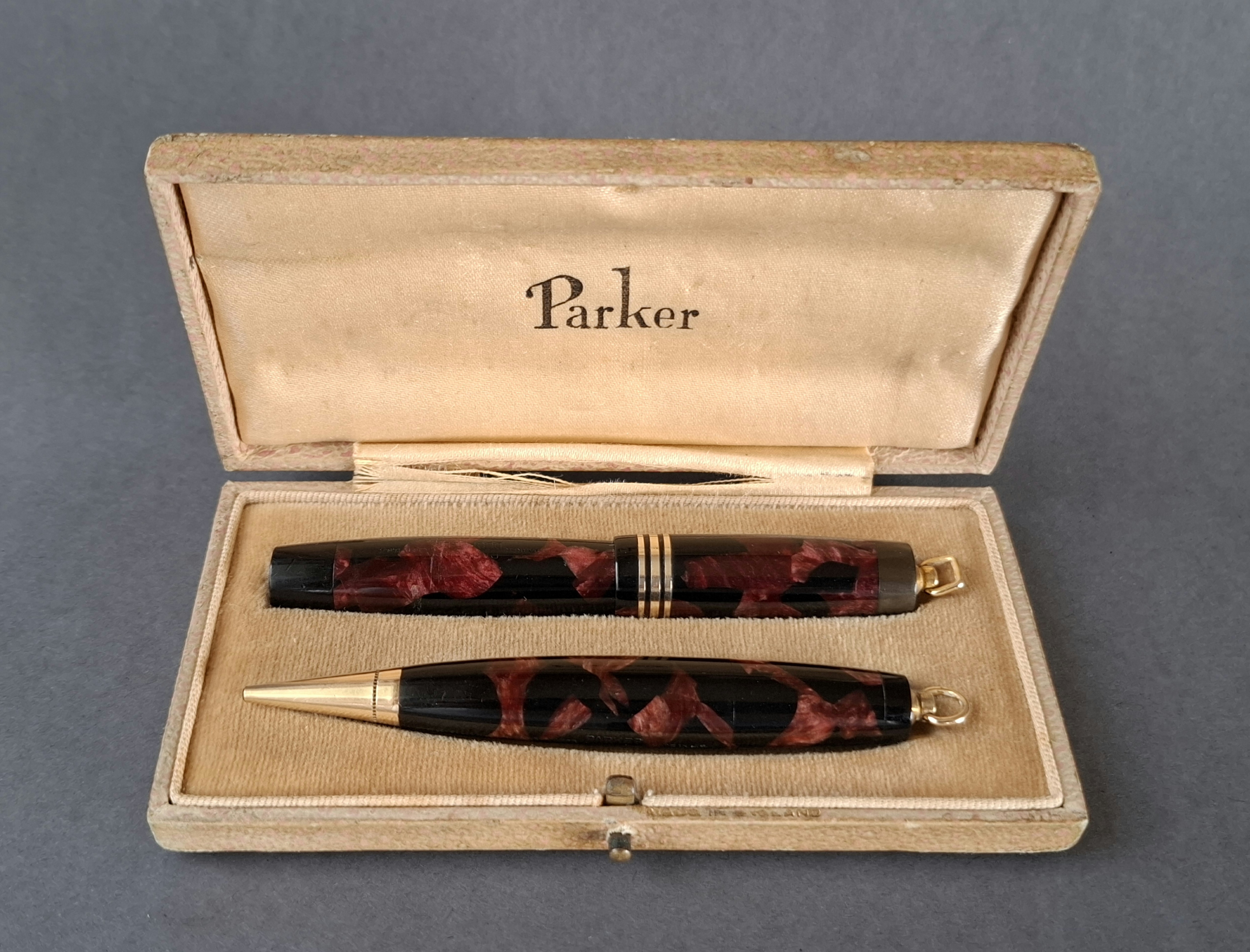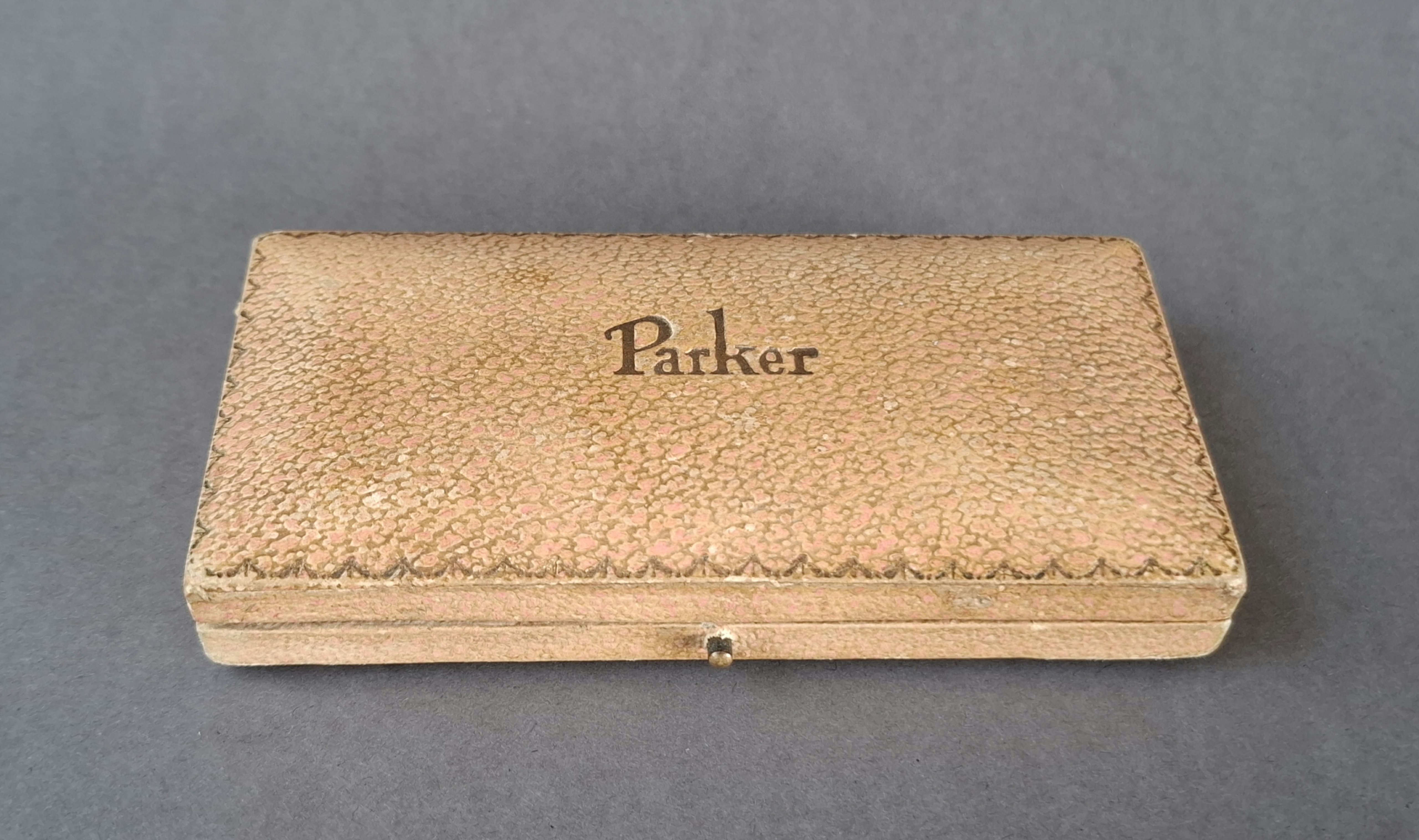 87. PARKER Penparker, Envelopener, GO desk base, Duofold Junior, Vest-Parker set in box (BIS).jpg
