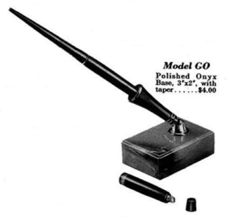 Di norma, la desk-base (dotata del calice in ebanite della misura adatta alla penna già posseduta o contestualmente acquistata) poteva essere venduta anche da sola, ma era sempre corredata di un codale (taper) anch’esso adatto alla taglia della penna (Senior, Junior, Lady/Pastel/Desk Pens).