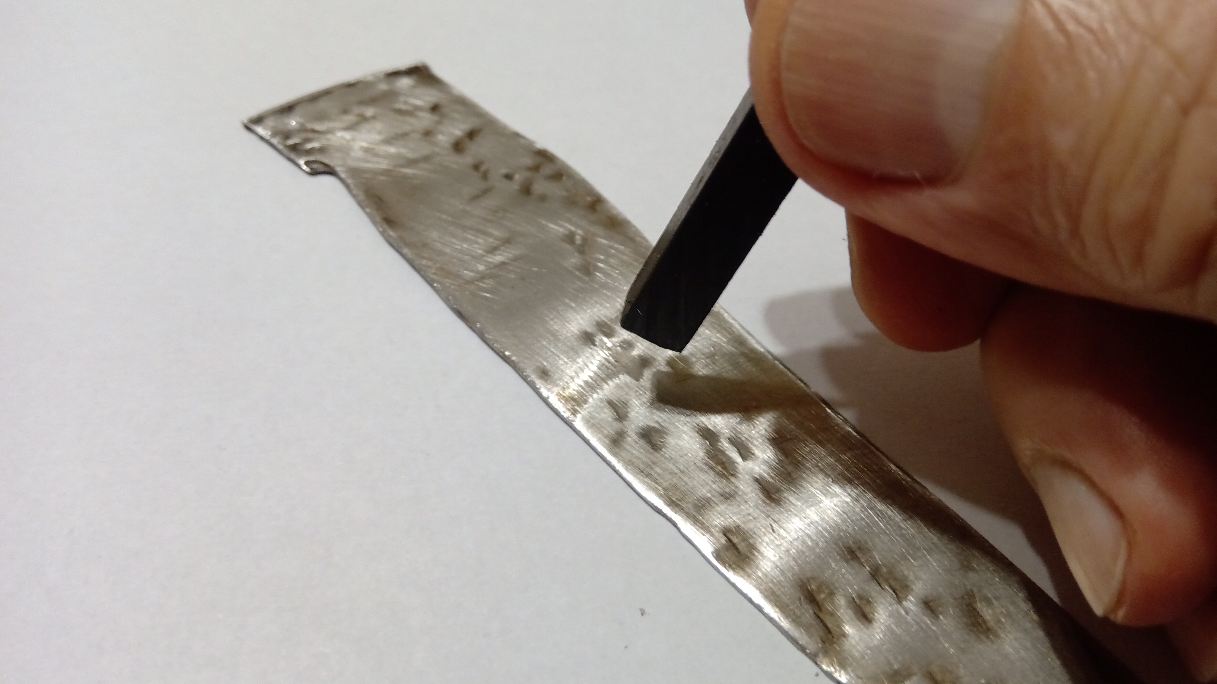 Buscando y buscando, encontré entre viejos cacharros de cocina arruinados, una pieza de la cual corté varias lonjas de acero...(mentira, destruí una vasija y luego me querían matar....!!!)