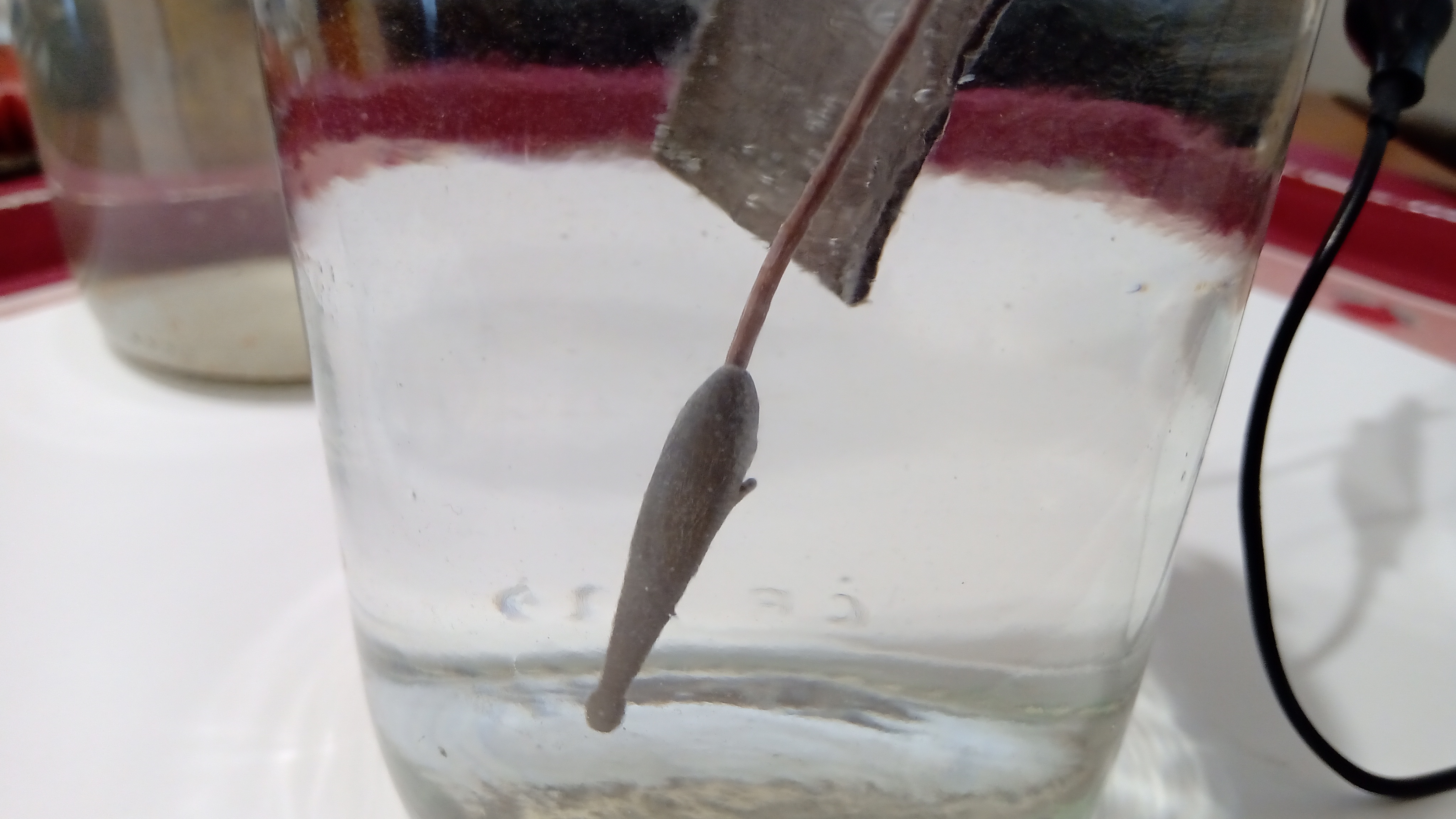 e, come per la generazione dell'elettrolita per la nichelatura, ho messo entrambi i pezzi di acciaio in un recipiente di vetro, che ho riempito completamente con aceto bianco in cui avevo precedentemente sciolto due cucchiai da tavola di cloruro di sodio...