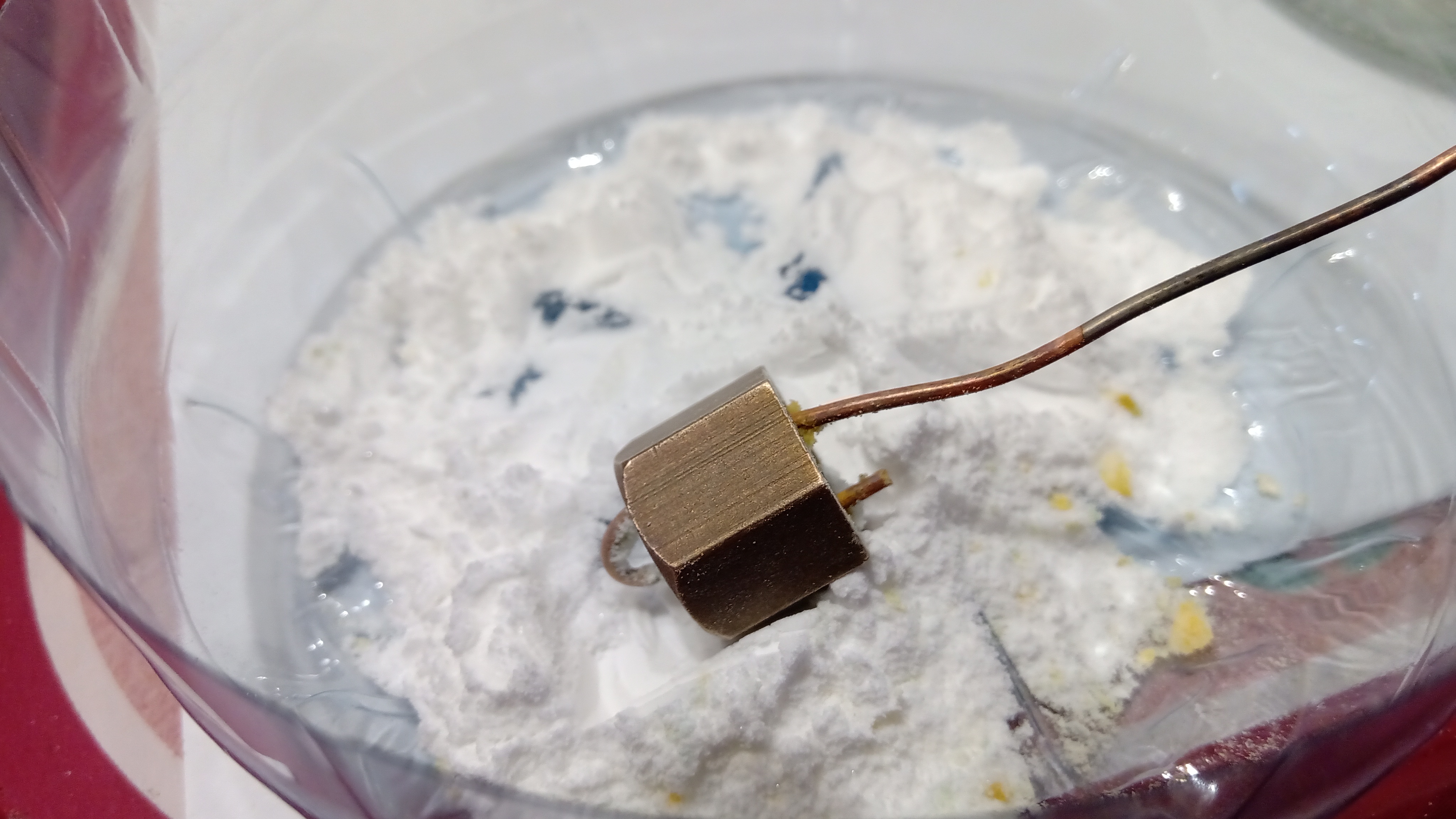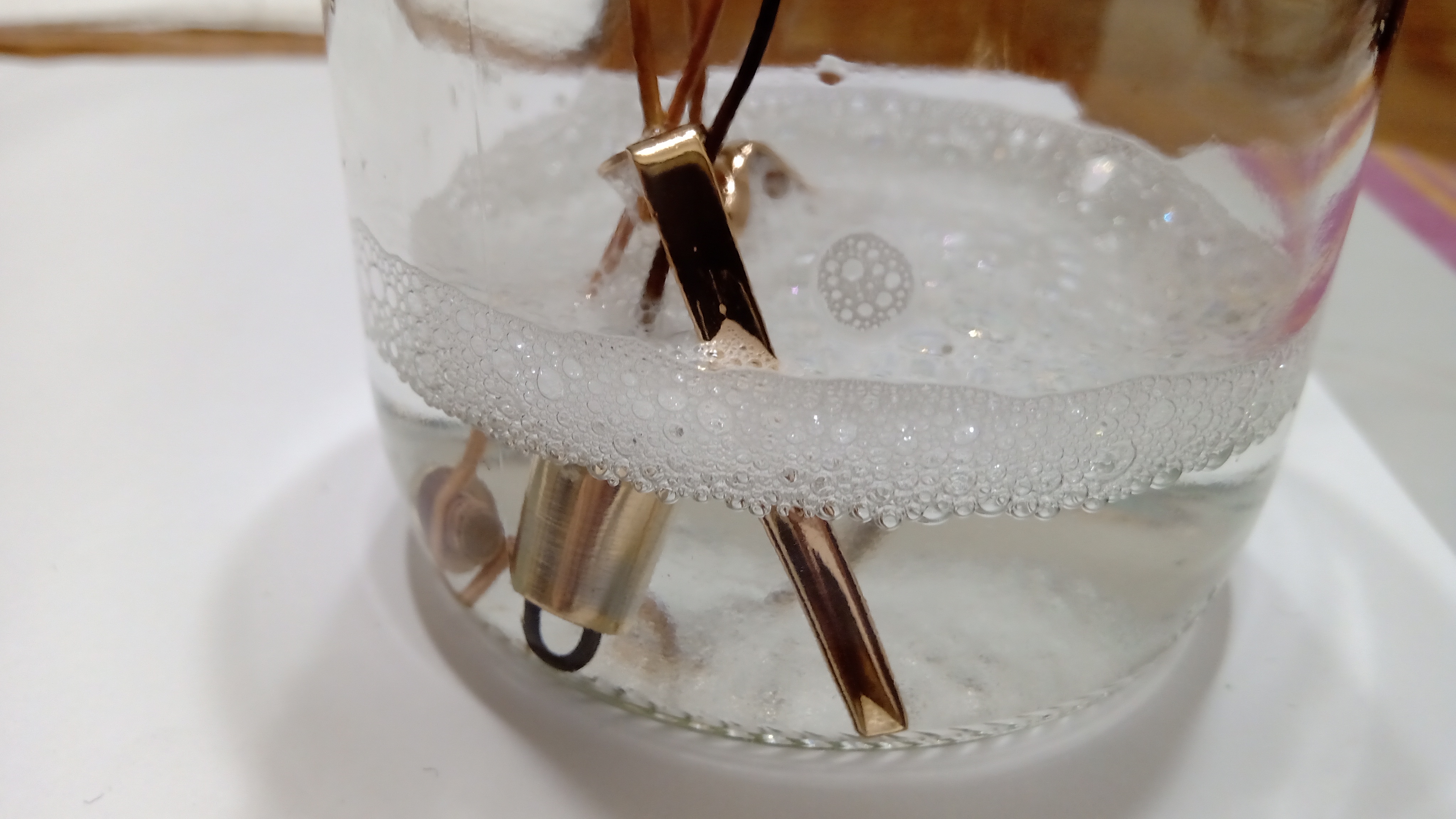 Desengrasé con alcohol puro las piezas, y comencé el proceso de cobreado de base de igual manera que habiamos procedido en el posteo para el niquelado.