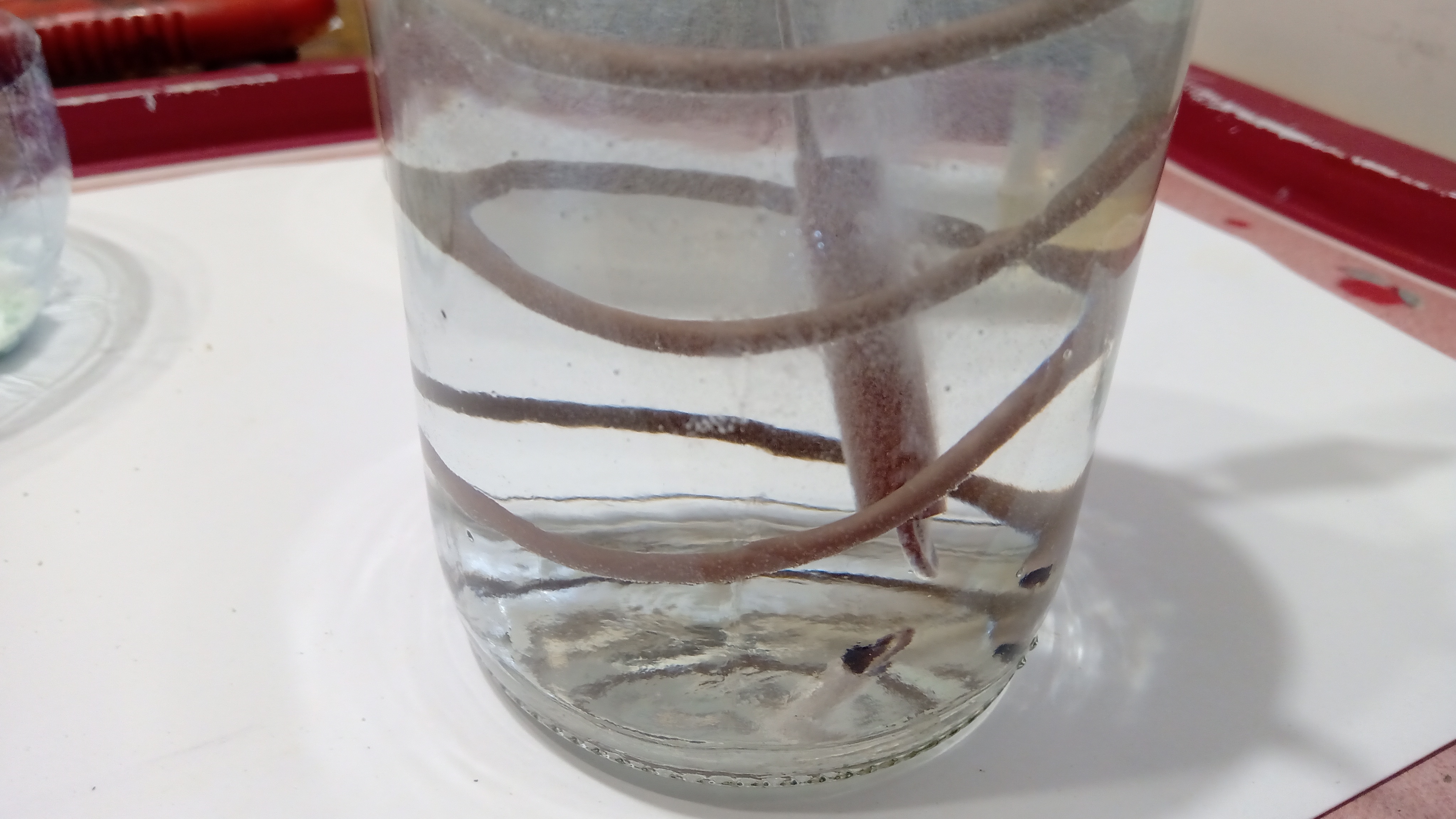 y al igual que en la generación del electrolito para el niquelado, coloqué ambas piezas de acero en un vidrio, el cual llené completamente con vinagre blanco en el cual disolví previamente dos cucharas soperas de cloruro de sodio...