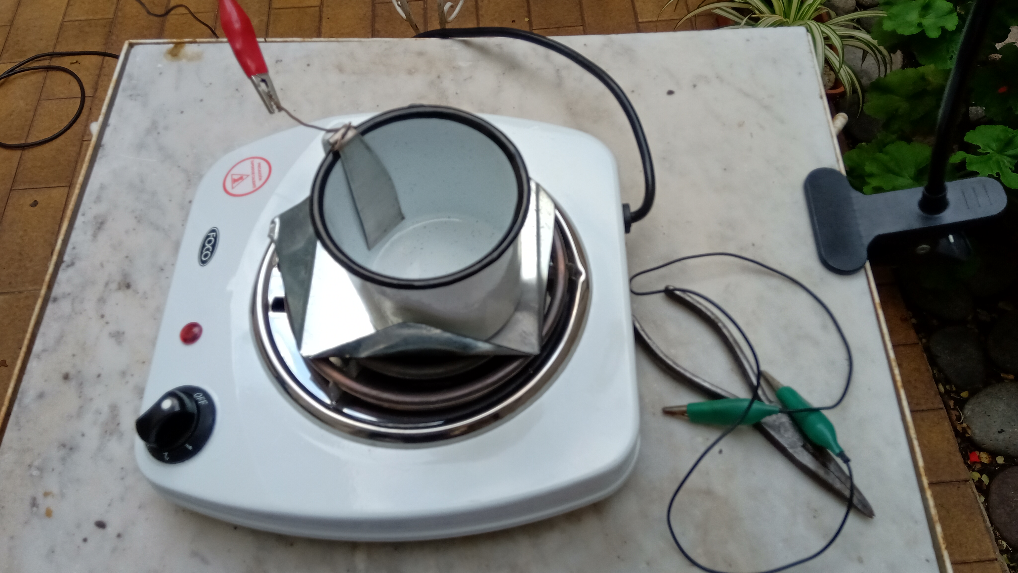 cucchiai da tavola di cloruro di sodio), con l'unica differenza che gli elettrodi di nichel sono stati sostituiti da elettrodi di acciaio inossidabile per creare l'elettrolita.