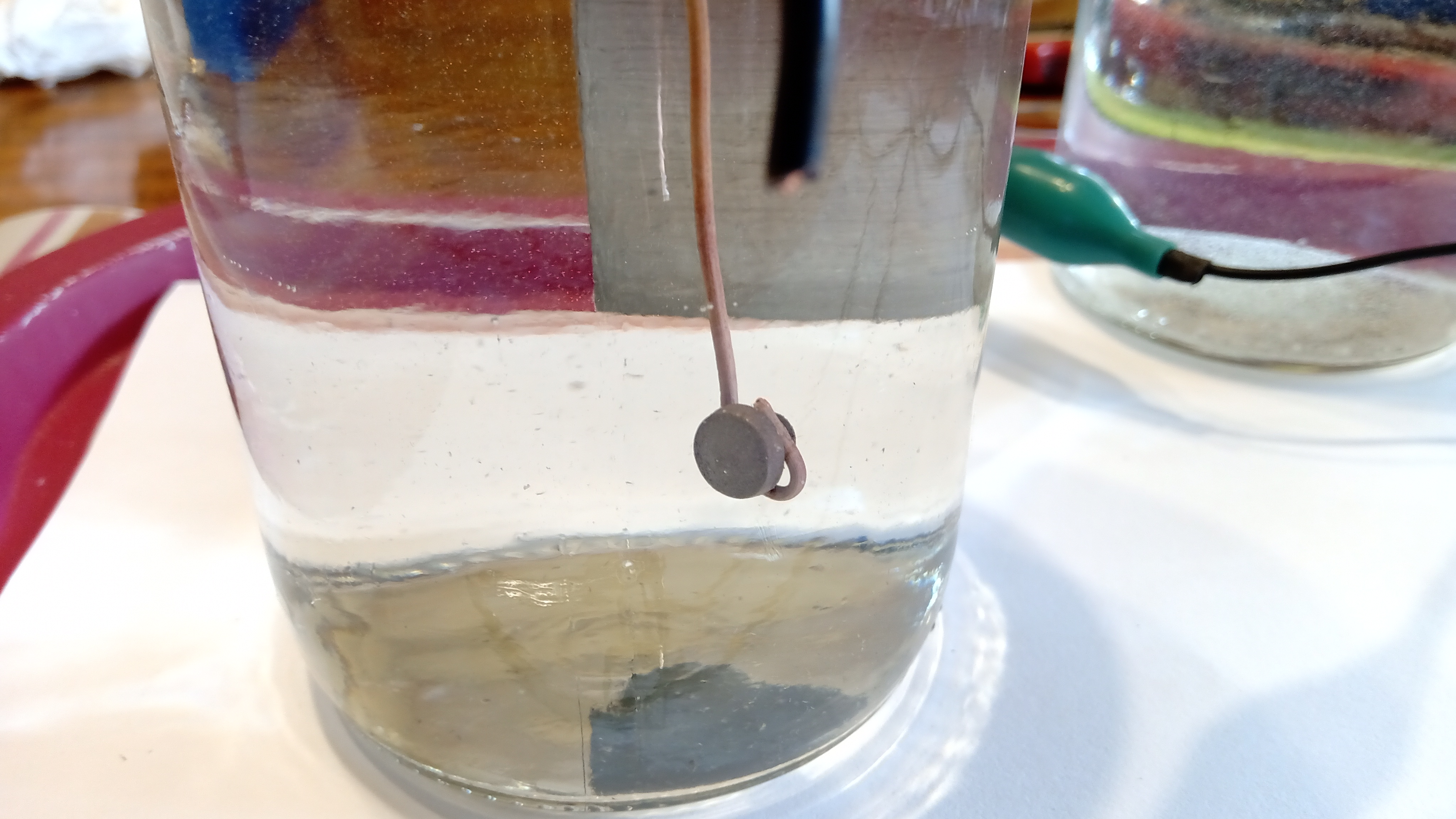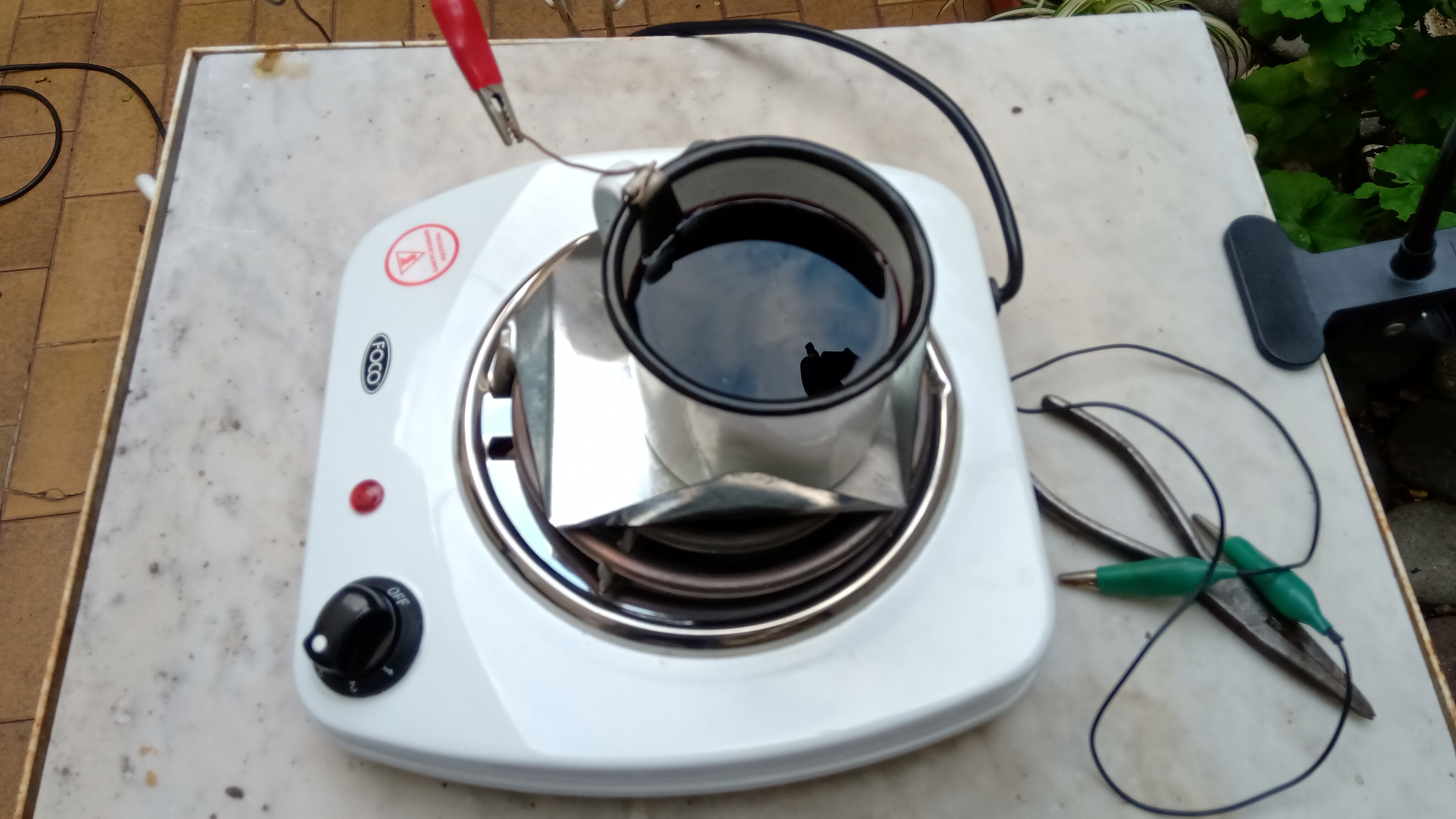 La solución de base fue la misma que en el caso del niquelado (1/2 litro de vinagre blanco + 2 cucharadas soperas de cloruro de sodio), donde el único cambio fue reemplazar los electrodos de níquel por electrodos de acero inoxidable para crear el electrolito.
