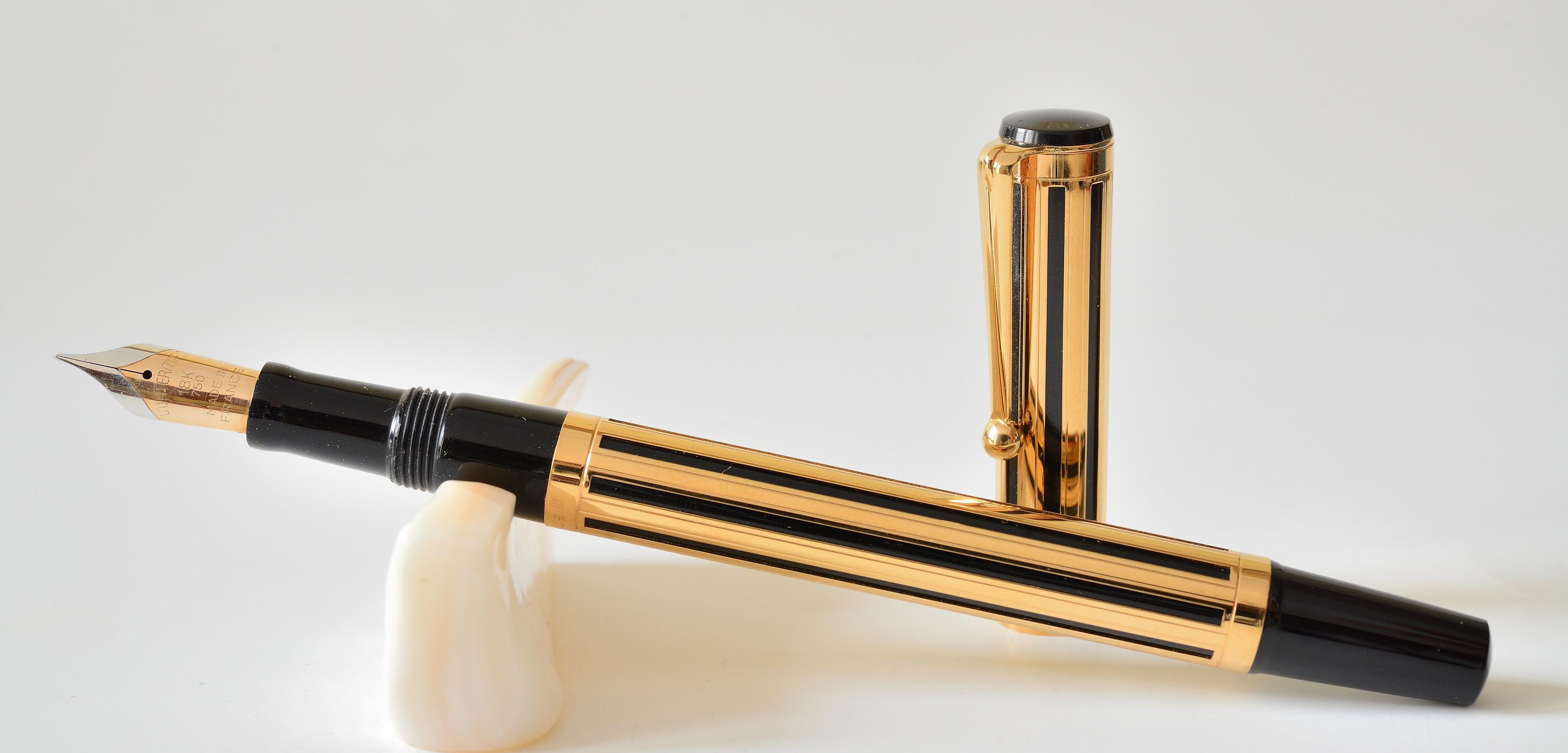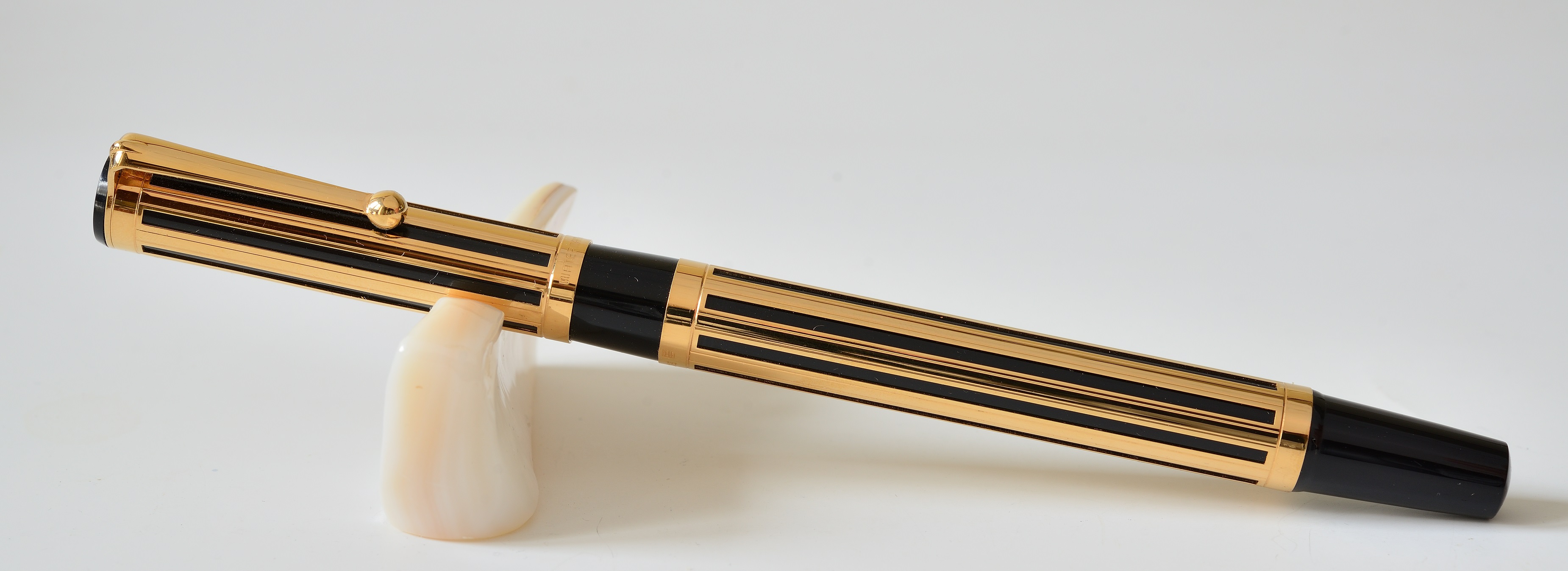 estremamente elegante ma ben più recente, credo prodotta tra il 1977 ed il 78, completa di scatola, controscatola, un pratico porta cartuccia di riserva, una piccola custodia in stoffa e libretto d'istruzioni e garanzia. Caricamento a cartuccia/converter di tipo CF. Pennino bicolore in oro 18K.
