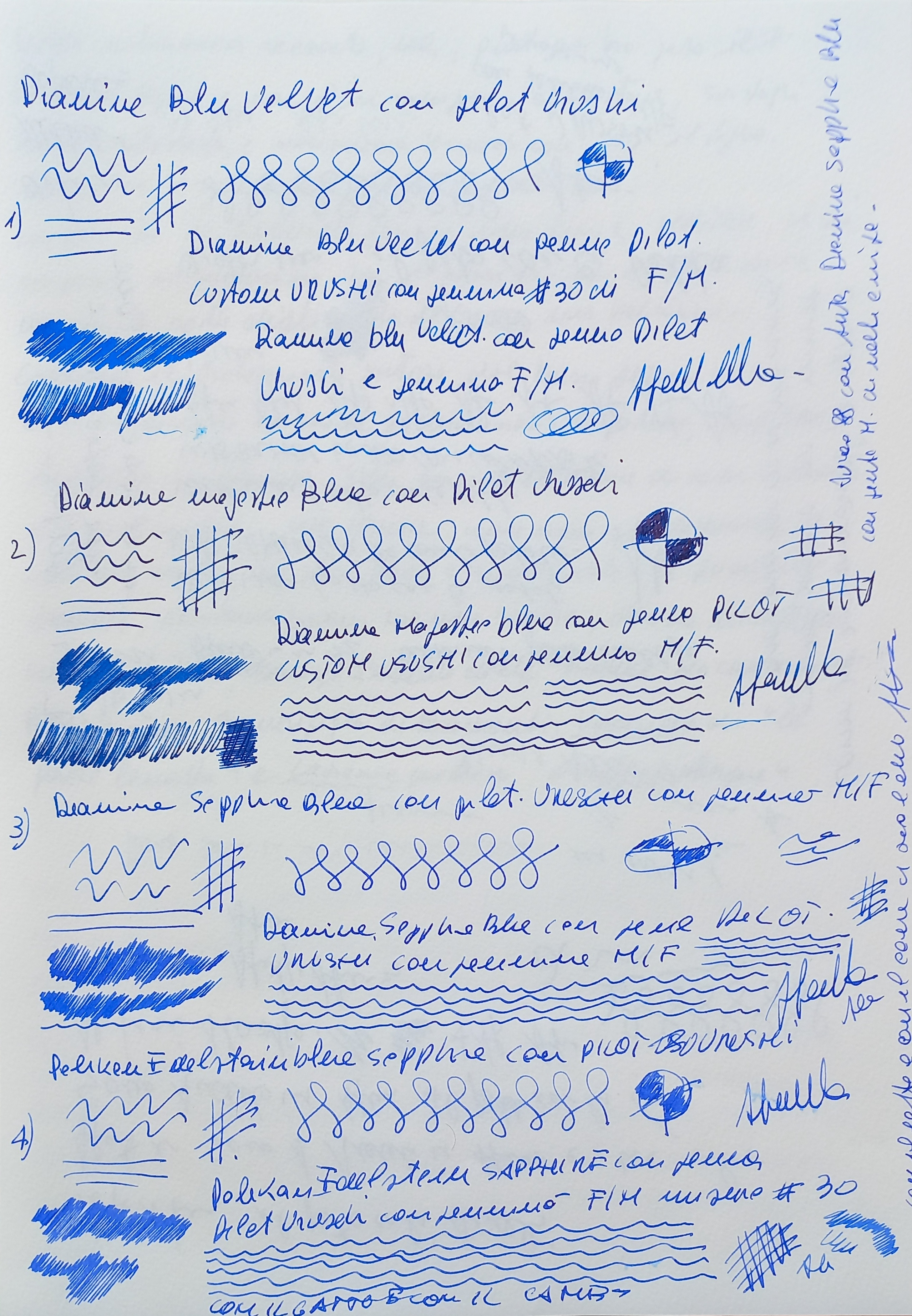 Di questi quattro blu che ci hai proposto non ne possiedo nemmeno uno ma devo dire che il Blue Velvet di Diamine mi piace molto vedendo la tua prova.